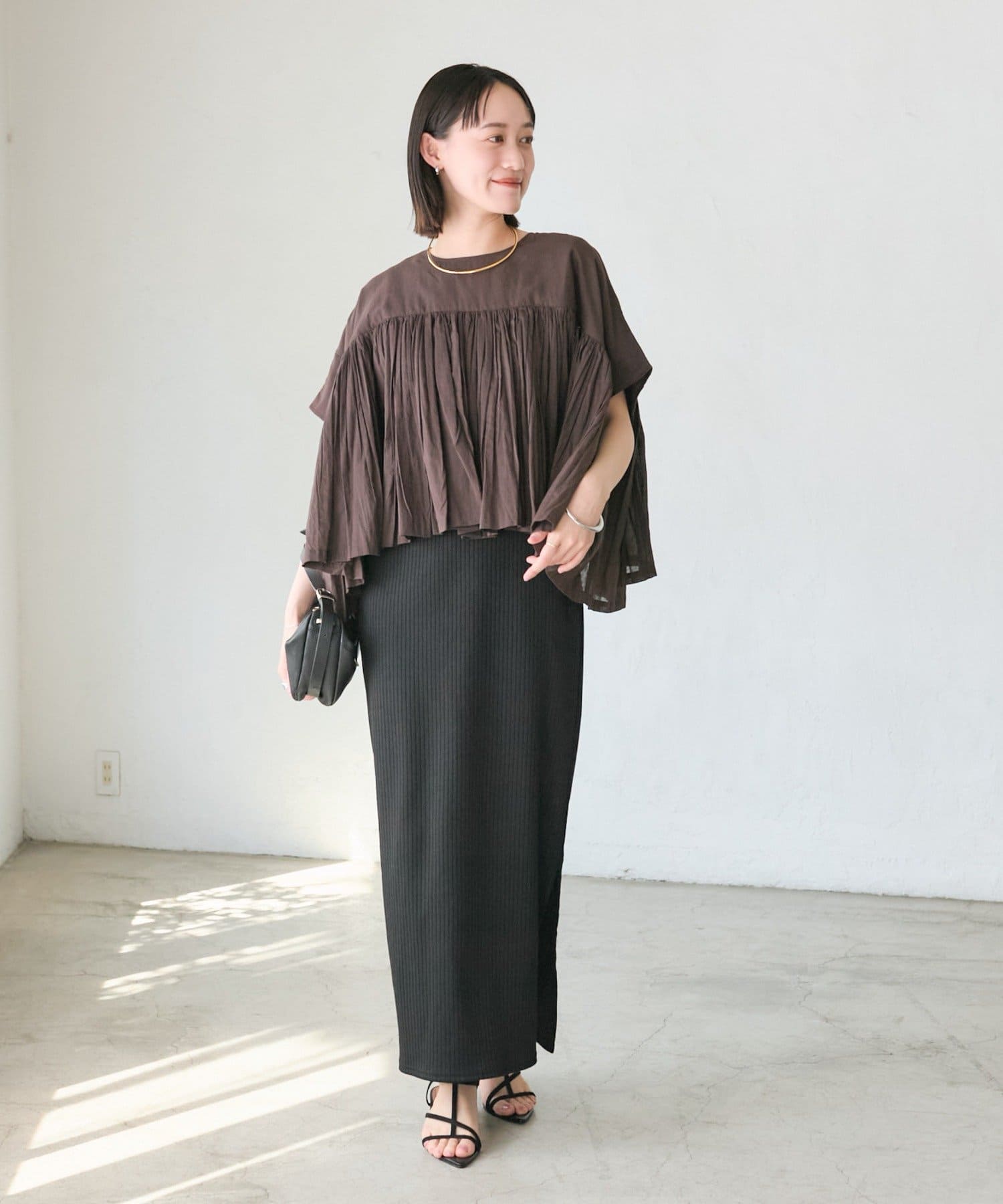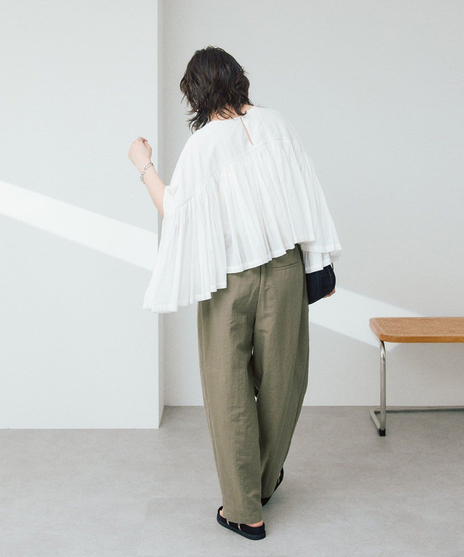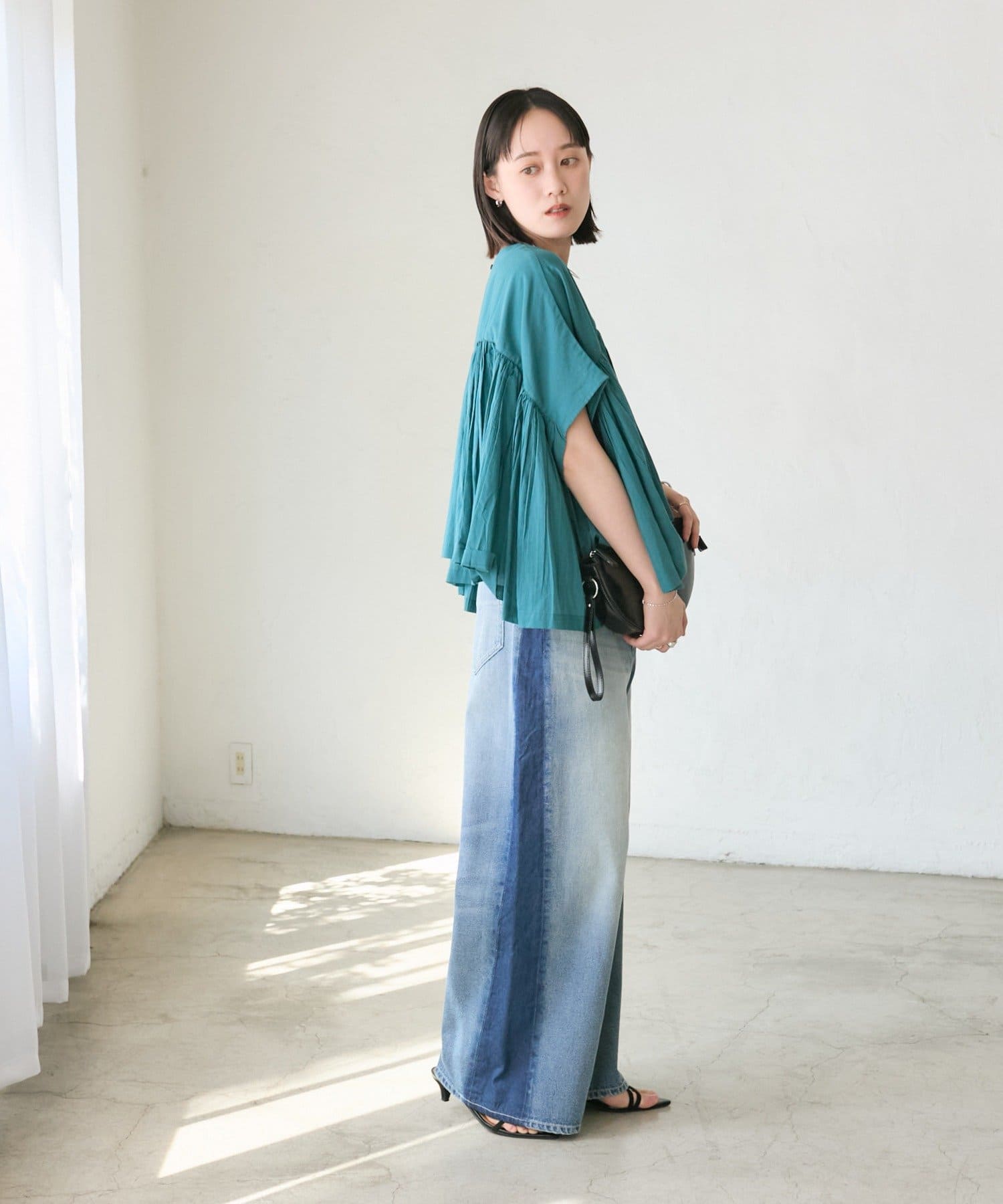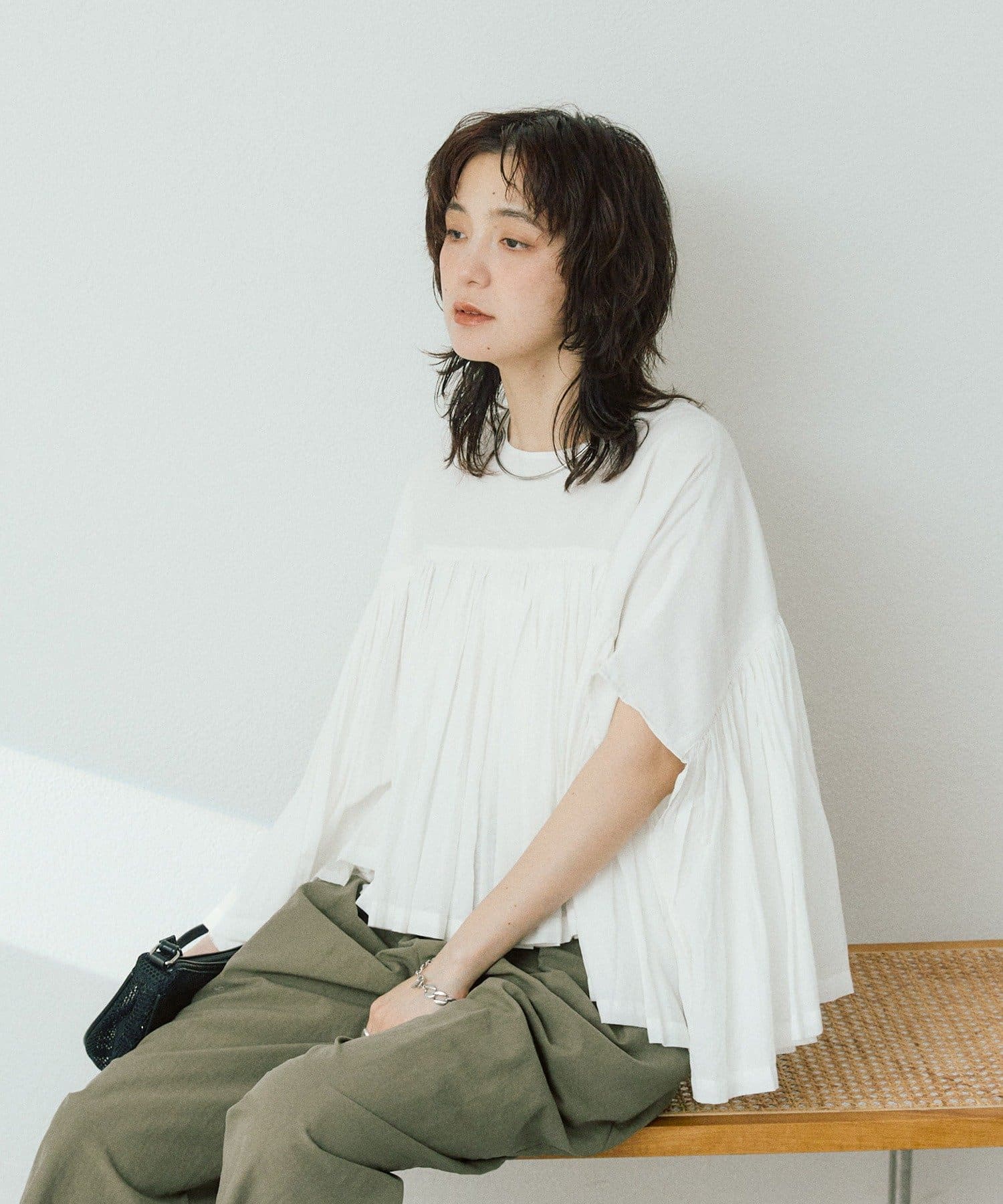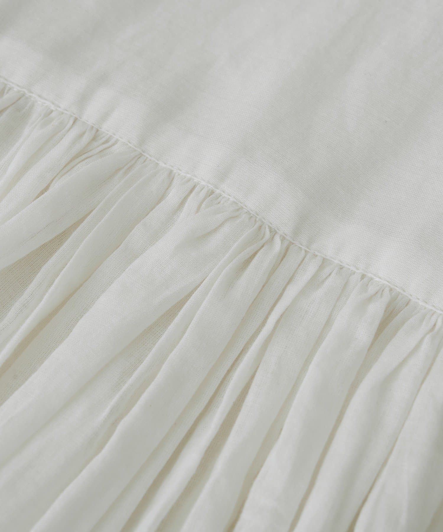 ・胸元の切り替え部分から袖下までギャザーをいれたことで、動きのある軽やかなデザインがポイント。