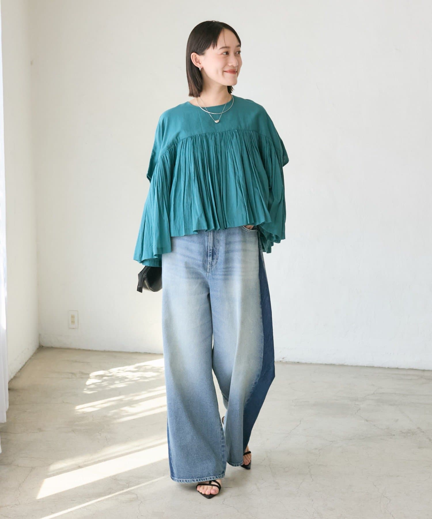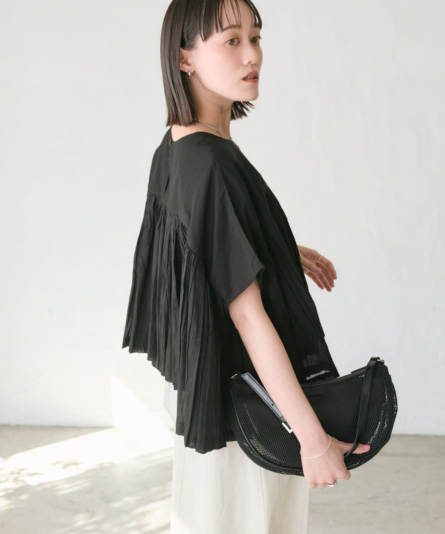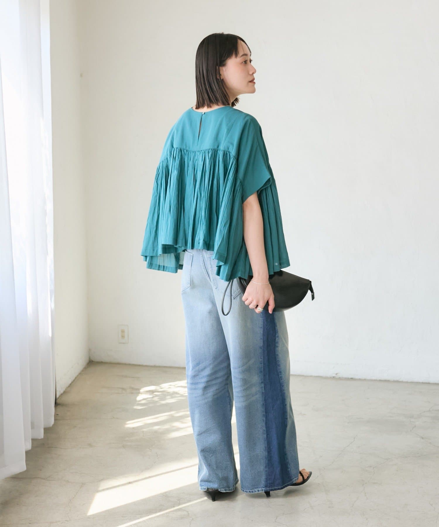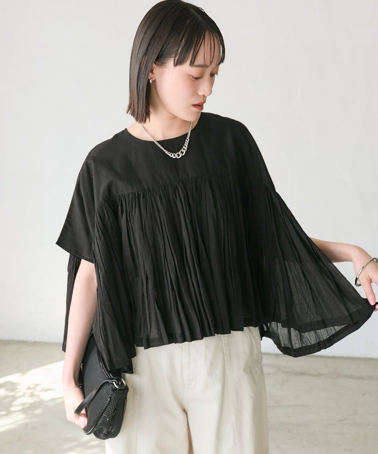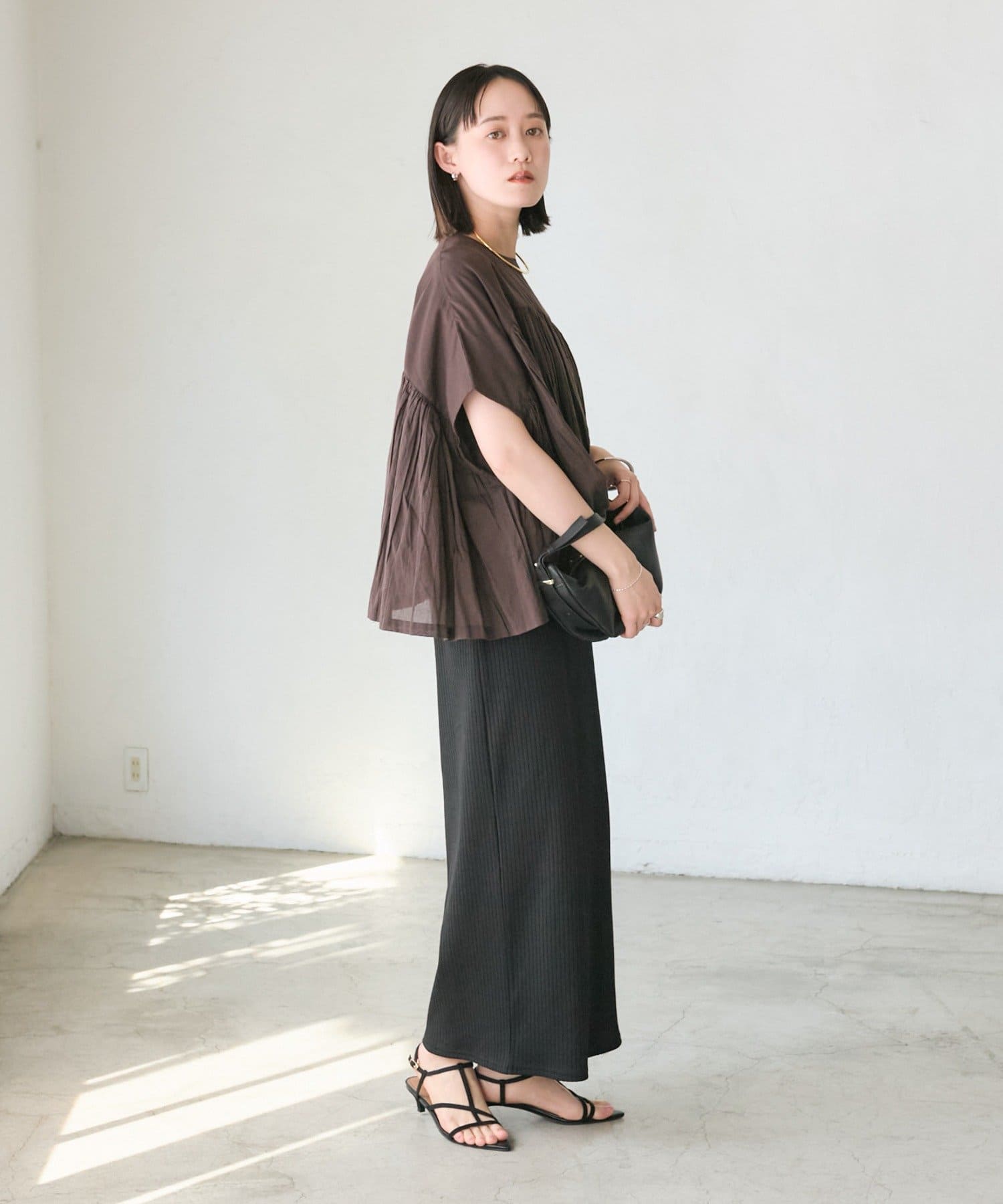 ・胸元の切り替え部分から袖下までギャザーをいれたことで、動きのある軽やかなデザインがポイント。
