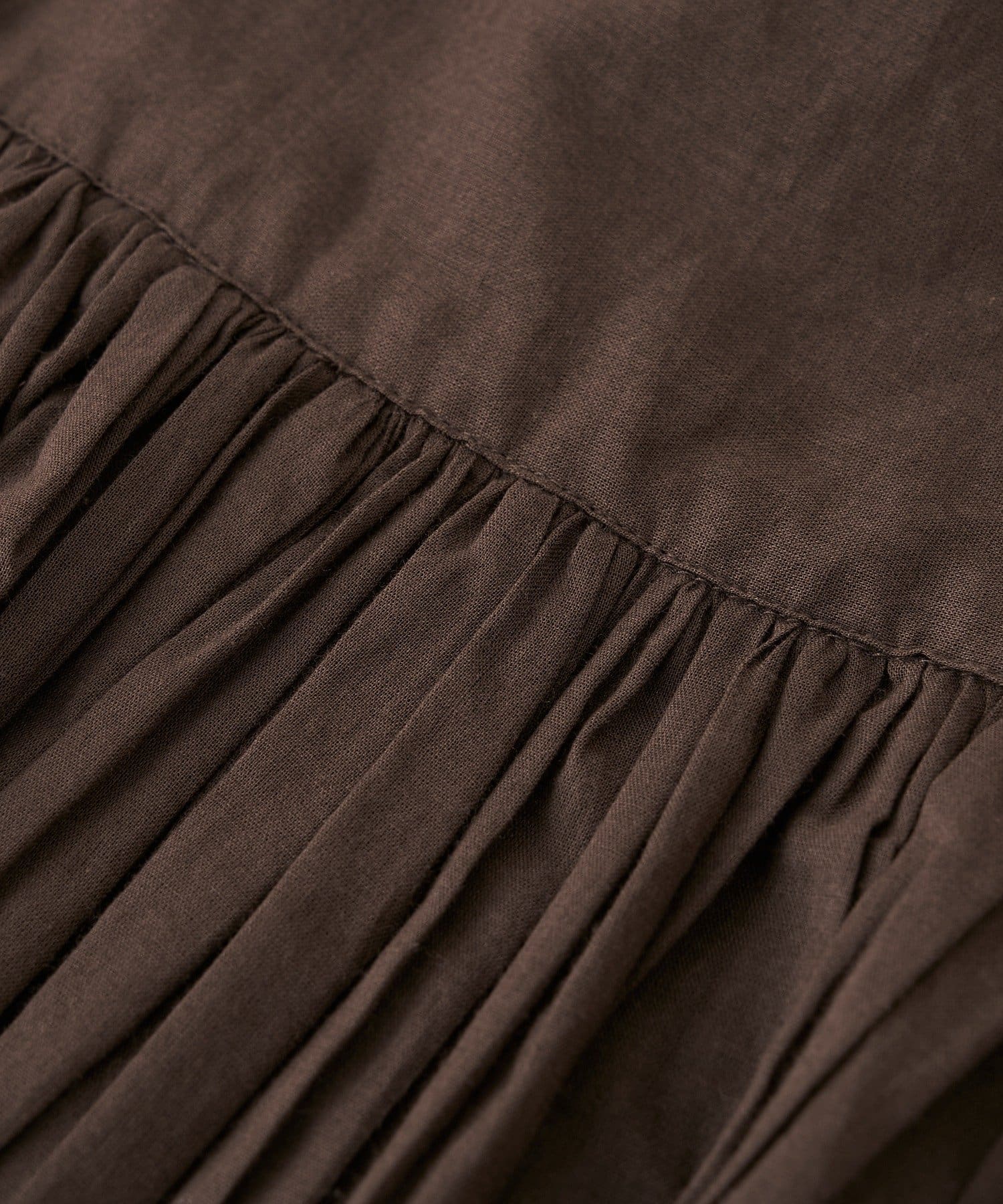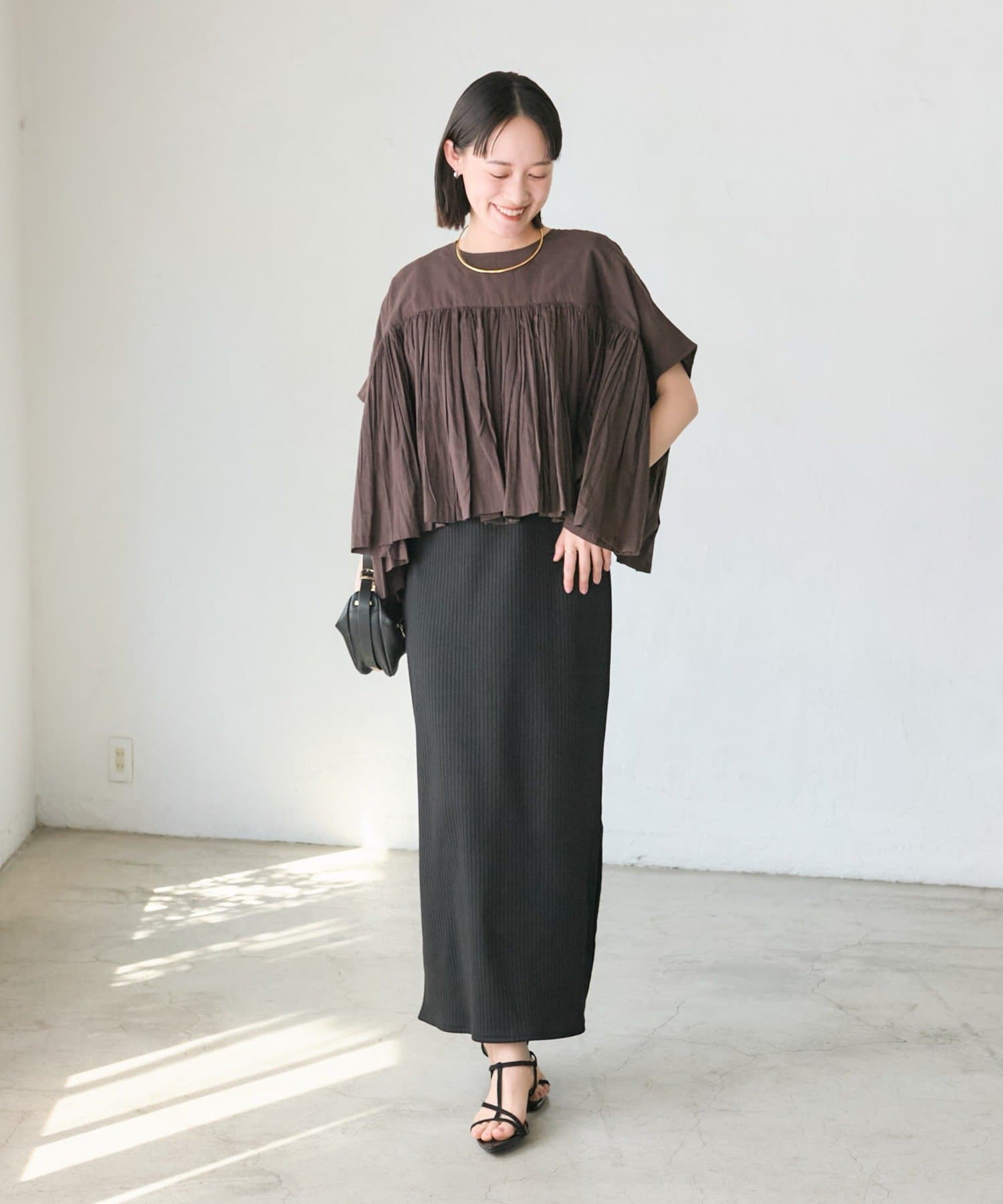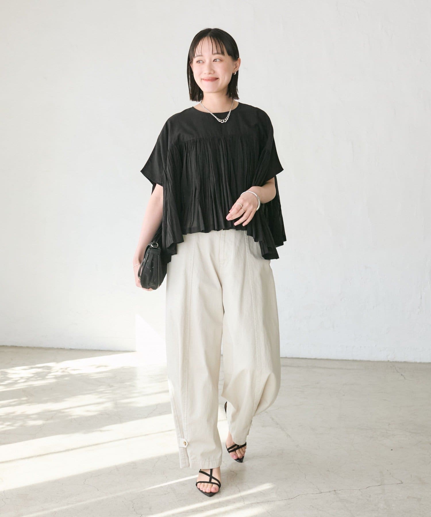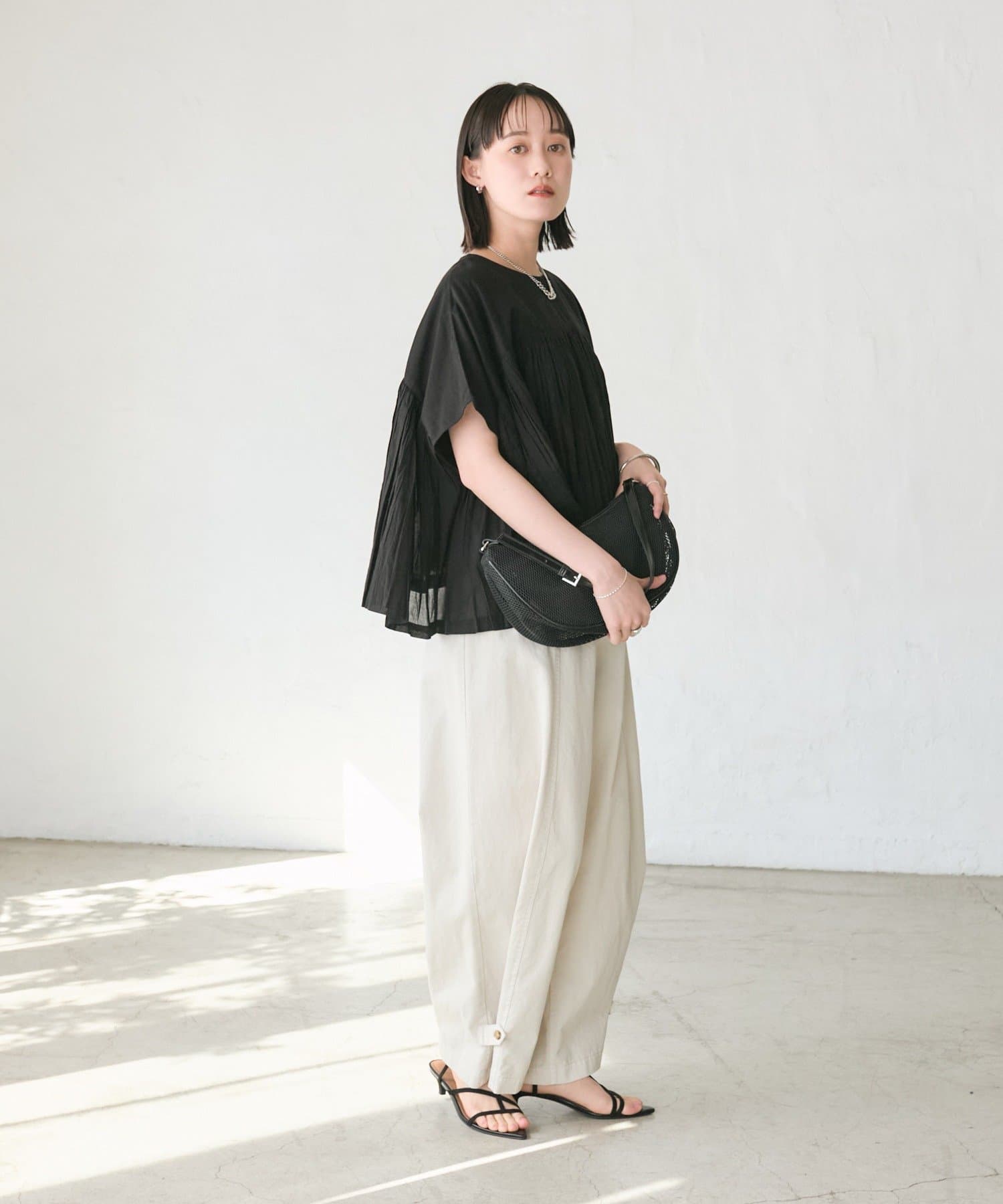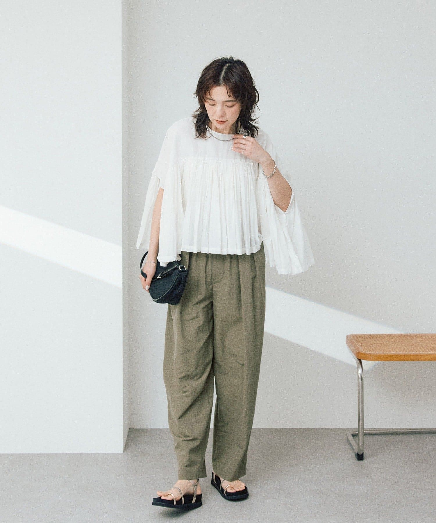 ・胸元の切り替え部分から袖下までギャザーをいれたことで、動きのある軽やかなデザインがポイント。