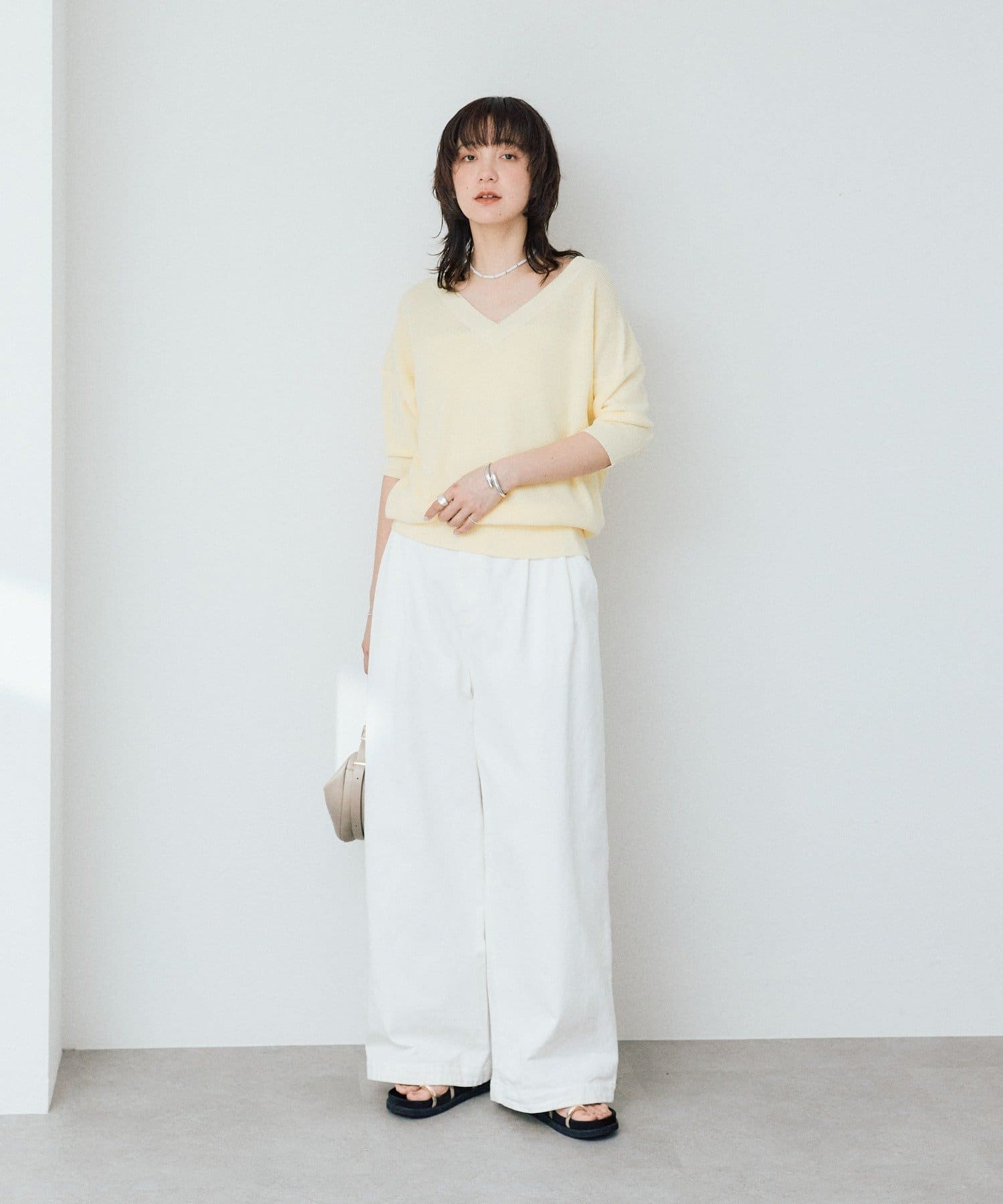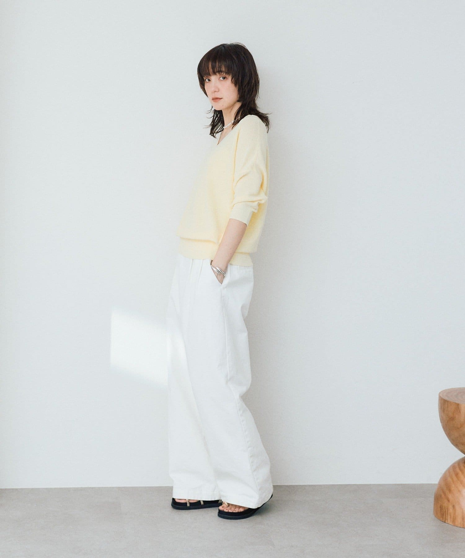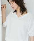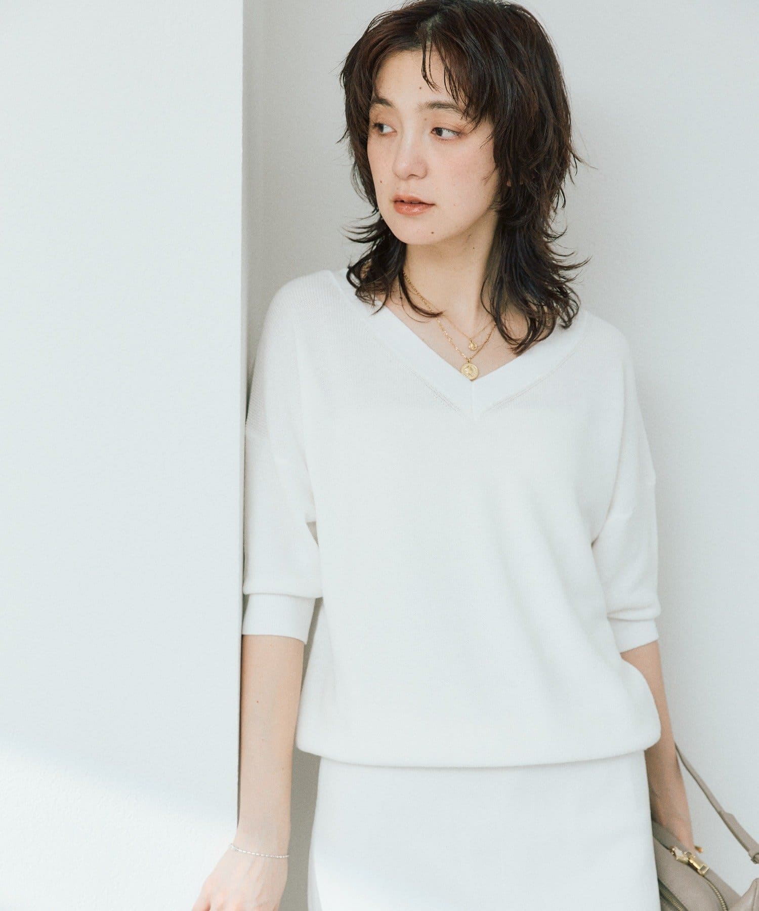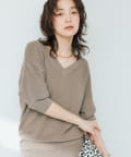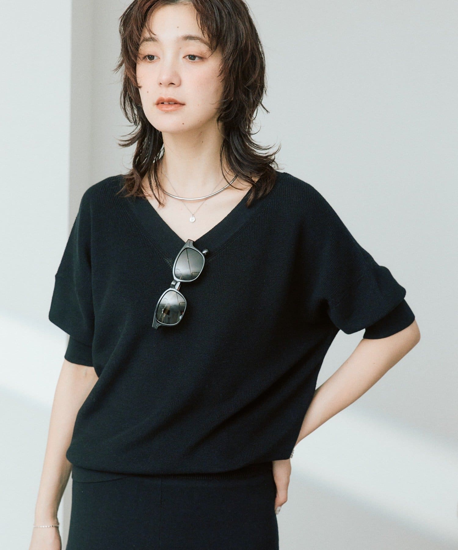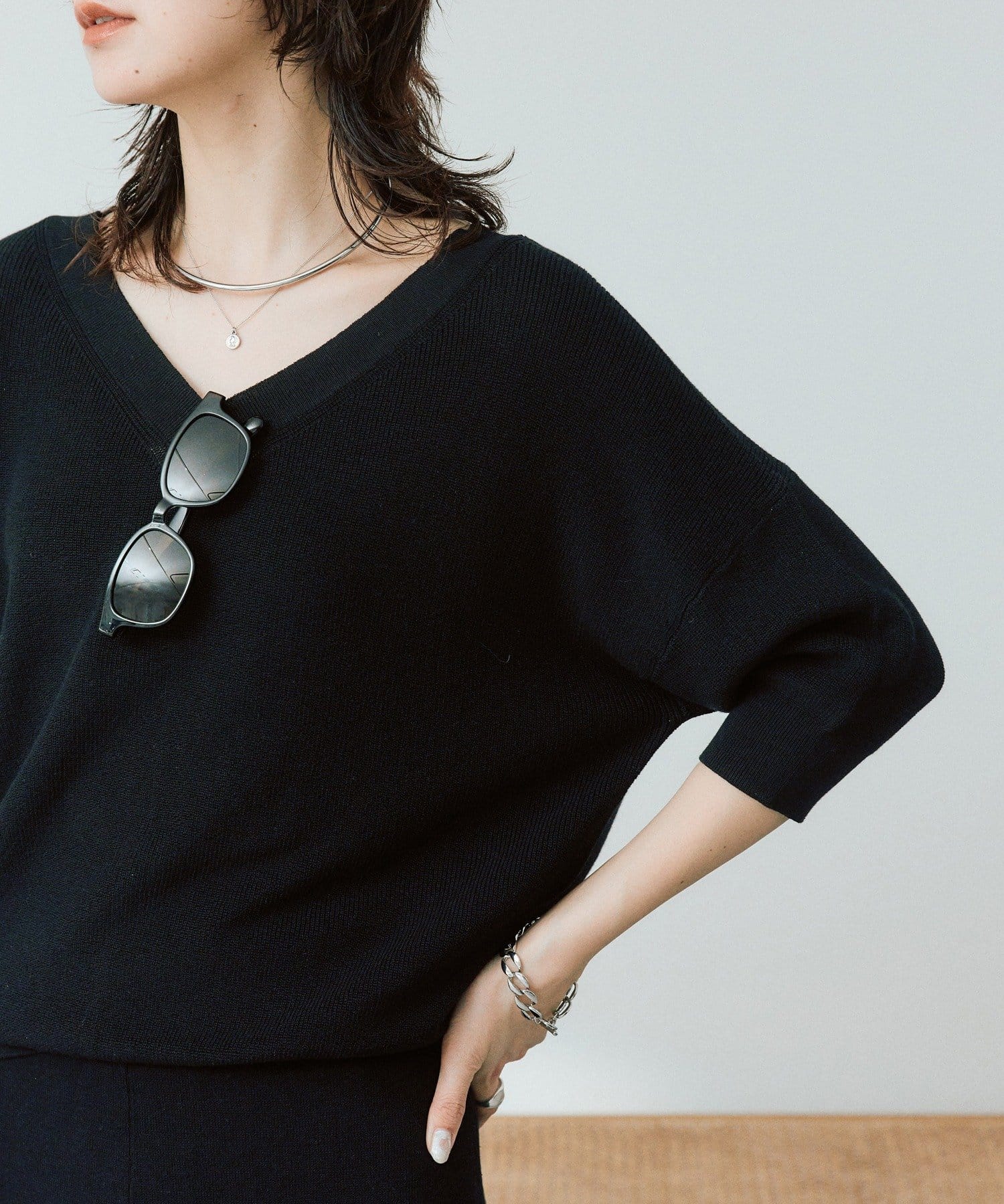 ・横に抜けた浅めのVネックで顔まわりの印象もスッキリ。