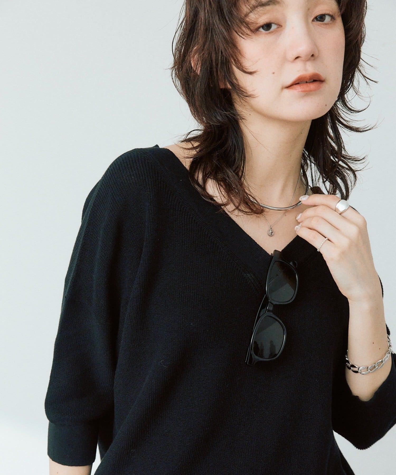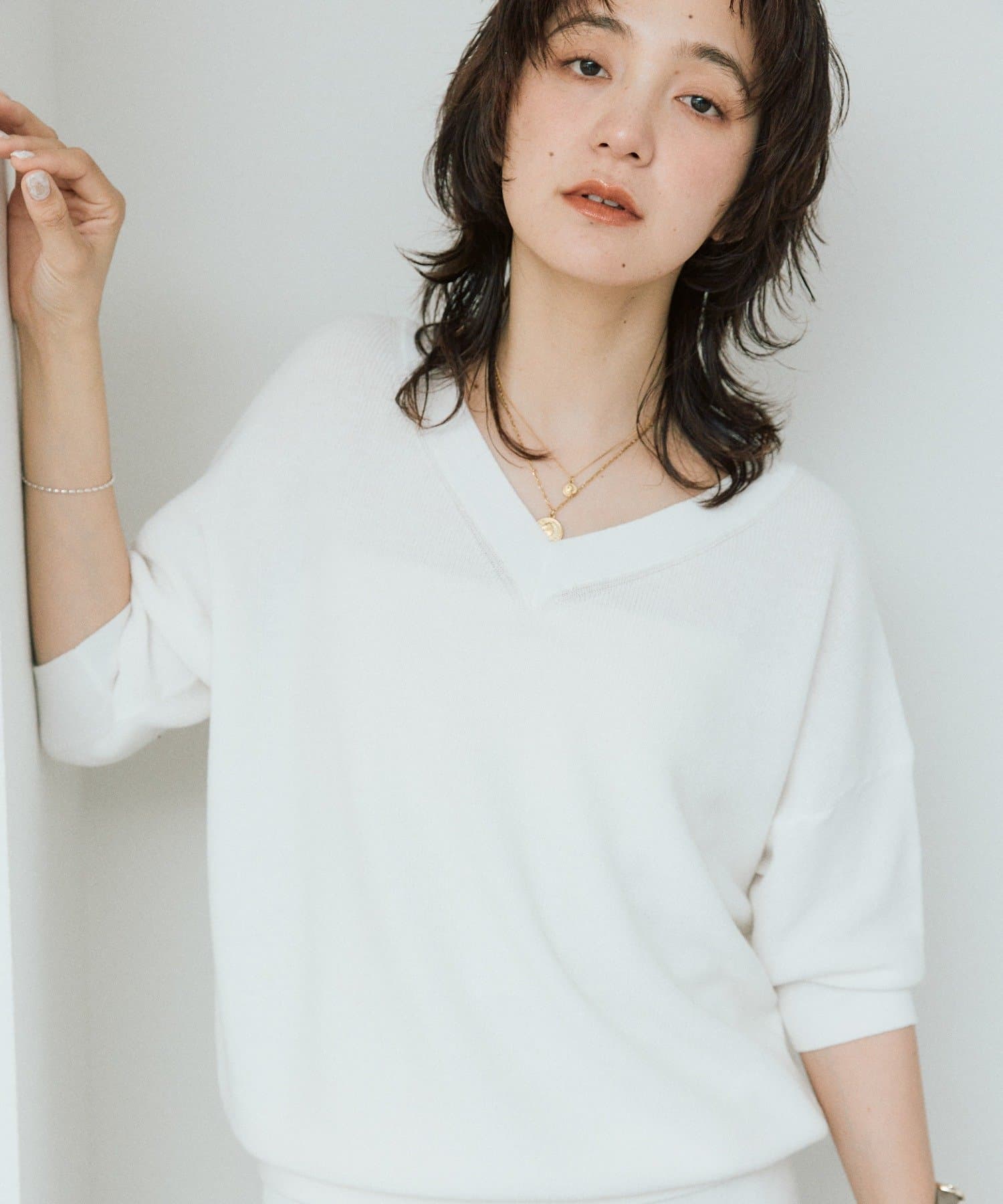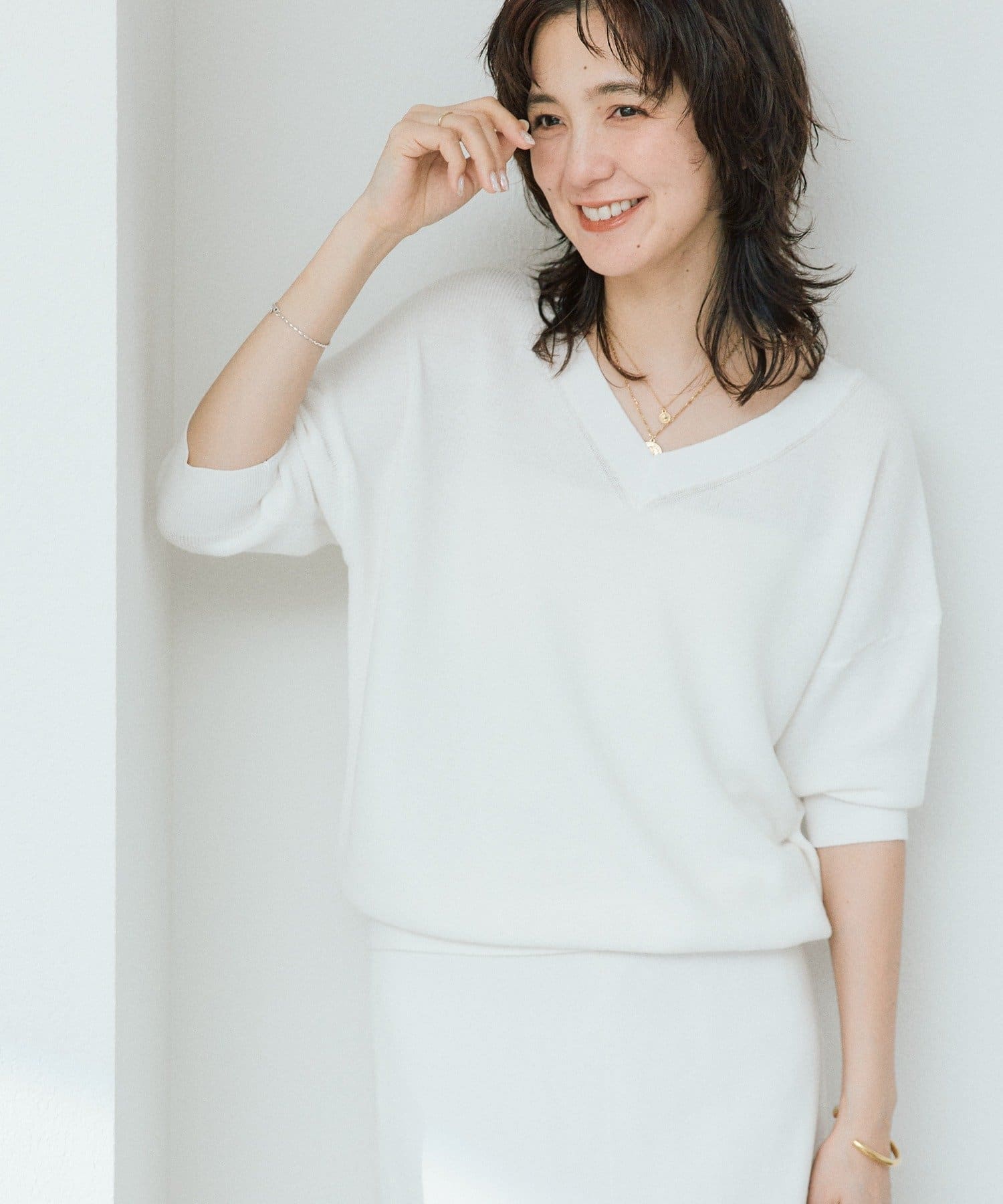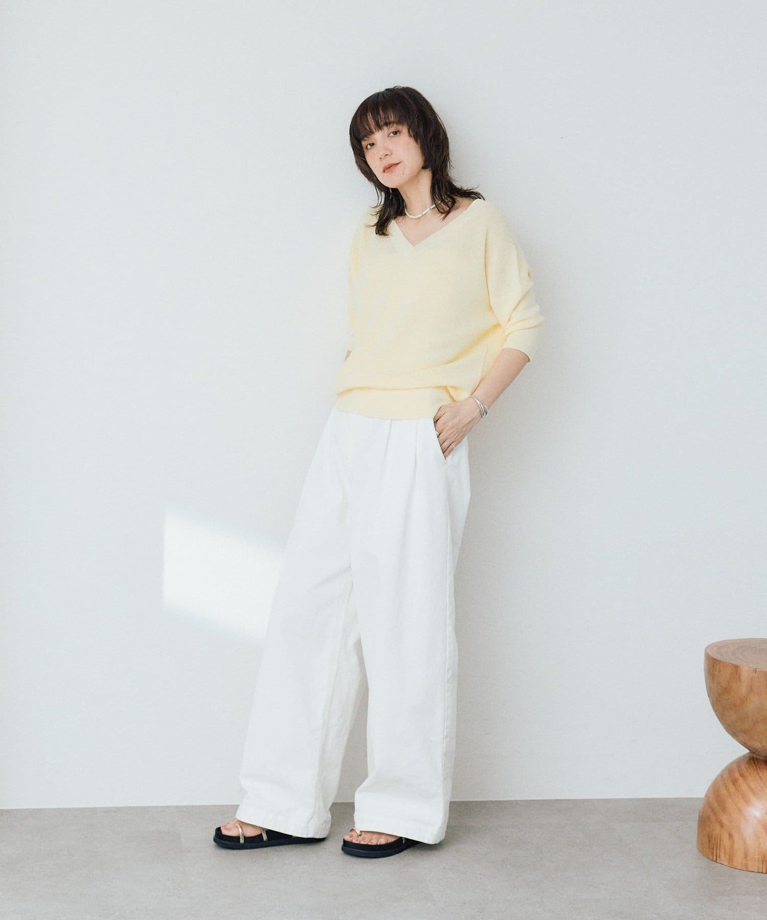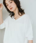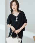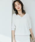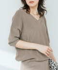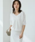・横に抜けた浅めのVネックで顔まわりの印象もスッキリ。