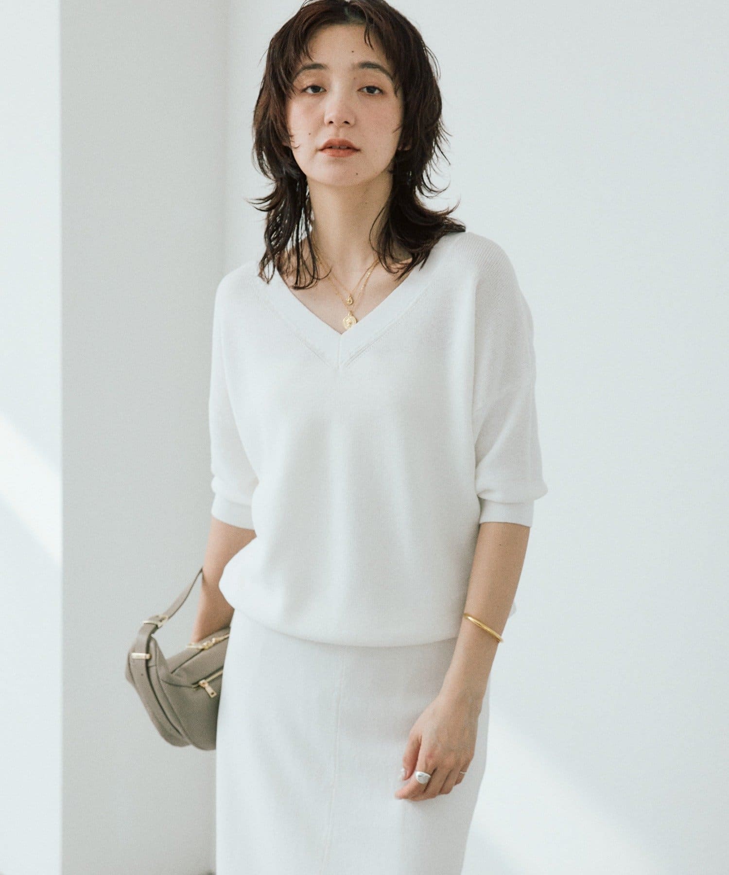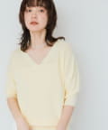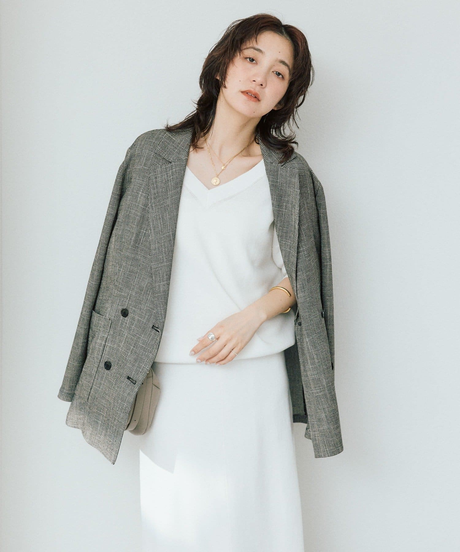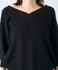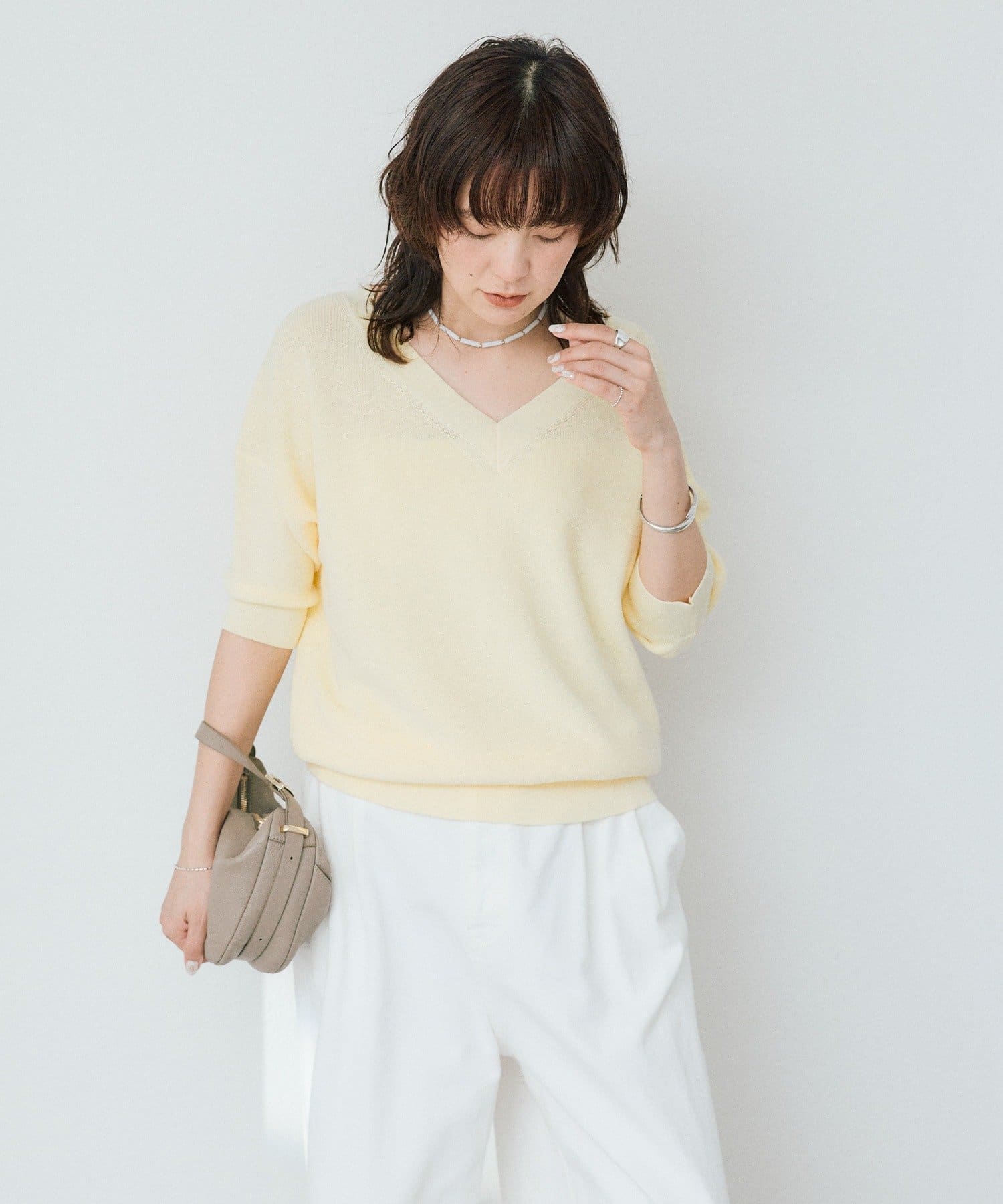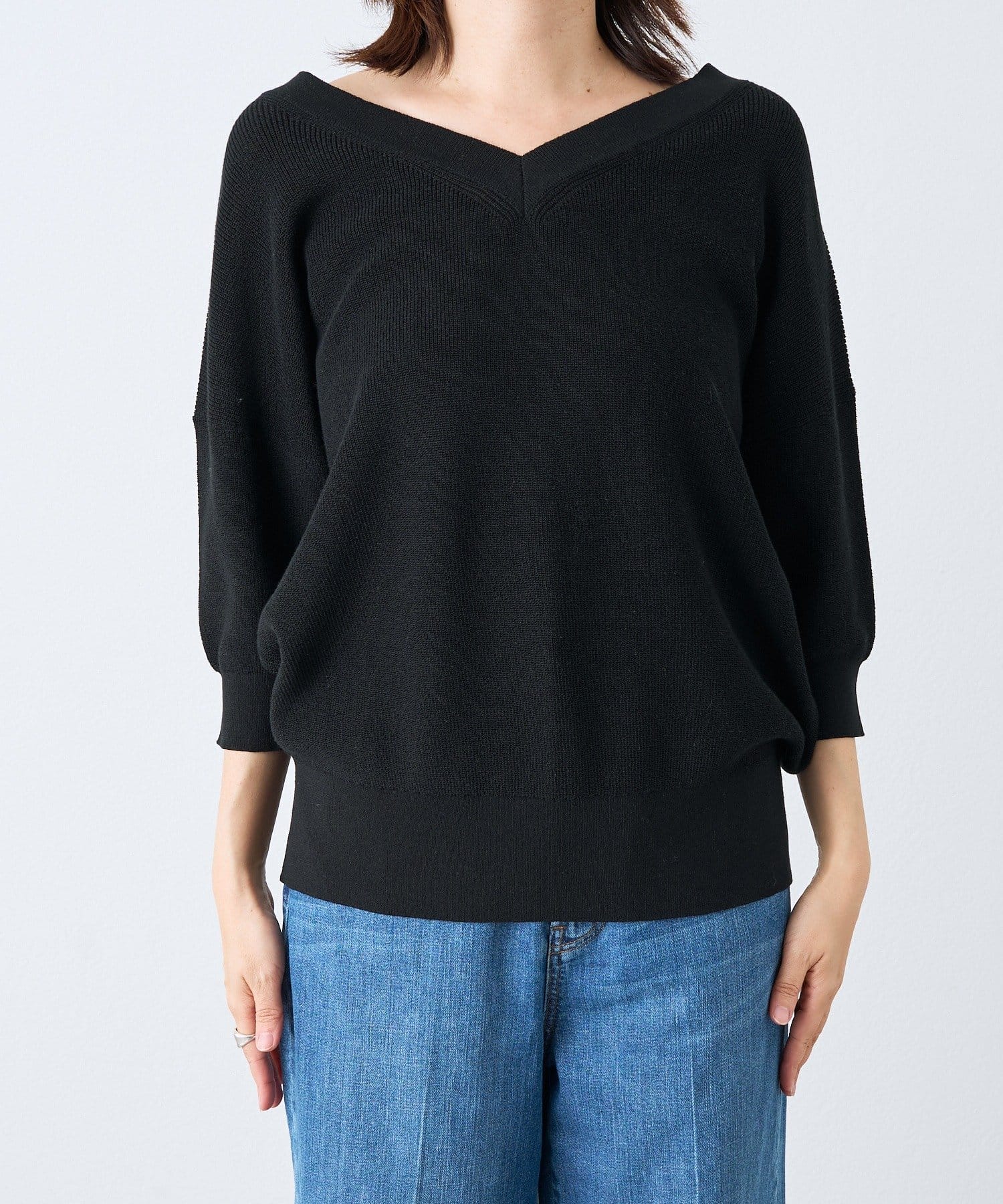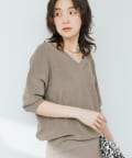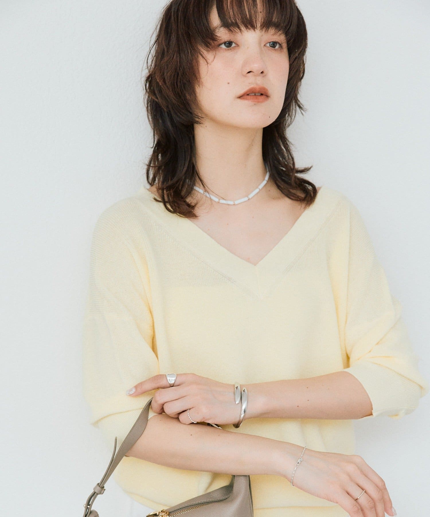 ・横に抜けた浅めのVネックで顔まわりの印象もスッキリ。