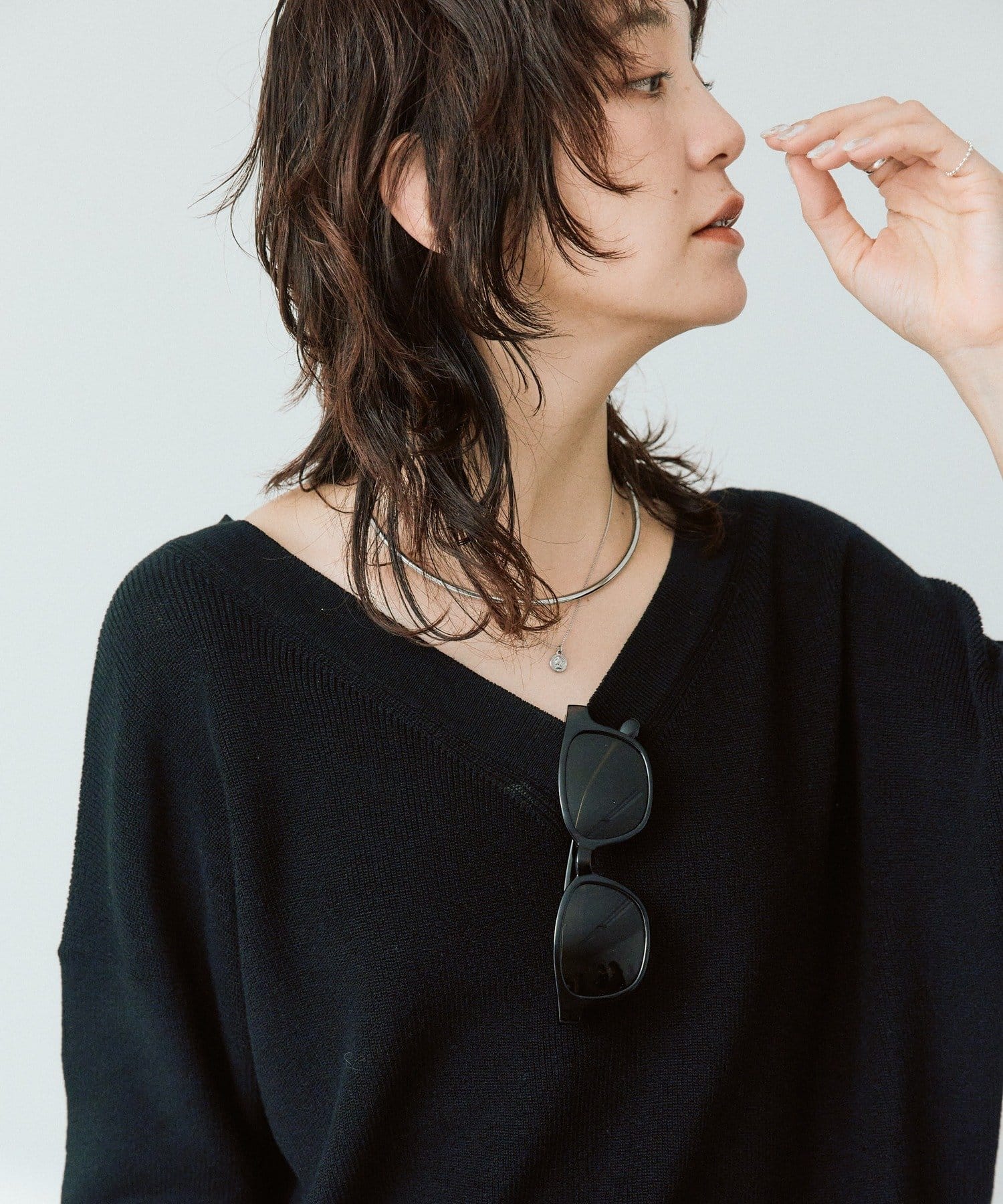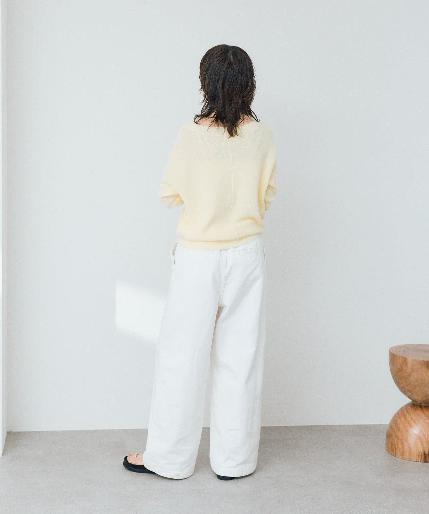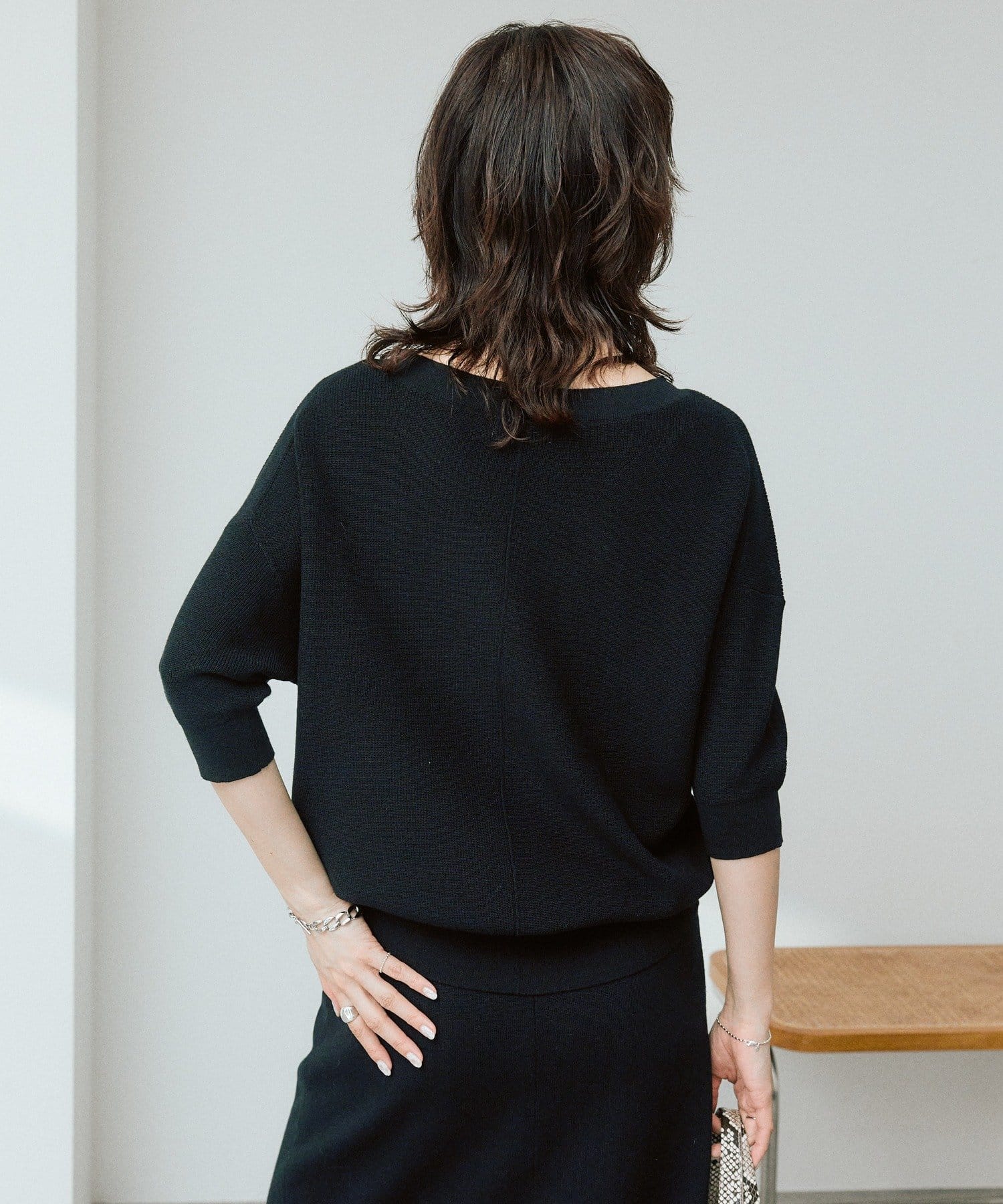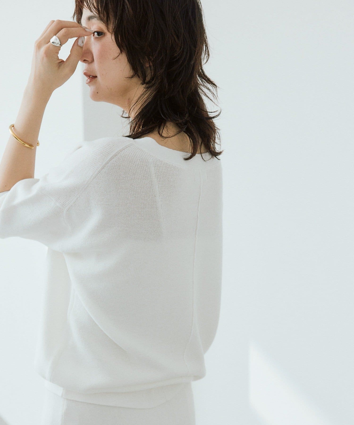 ・横に抜けた浅めのVネックで顔まわりの印象もスッキリ。