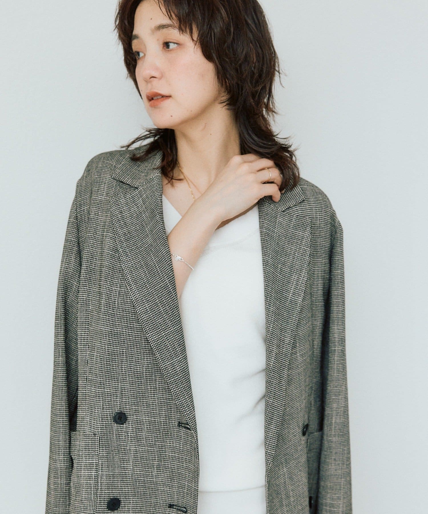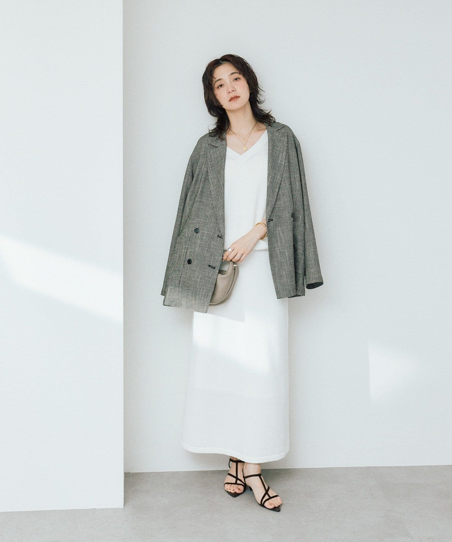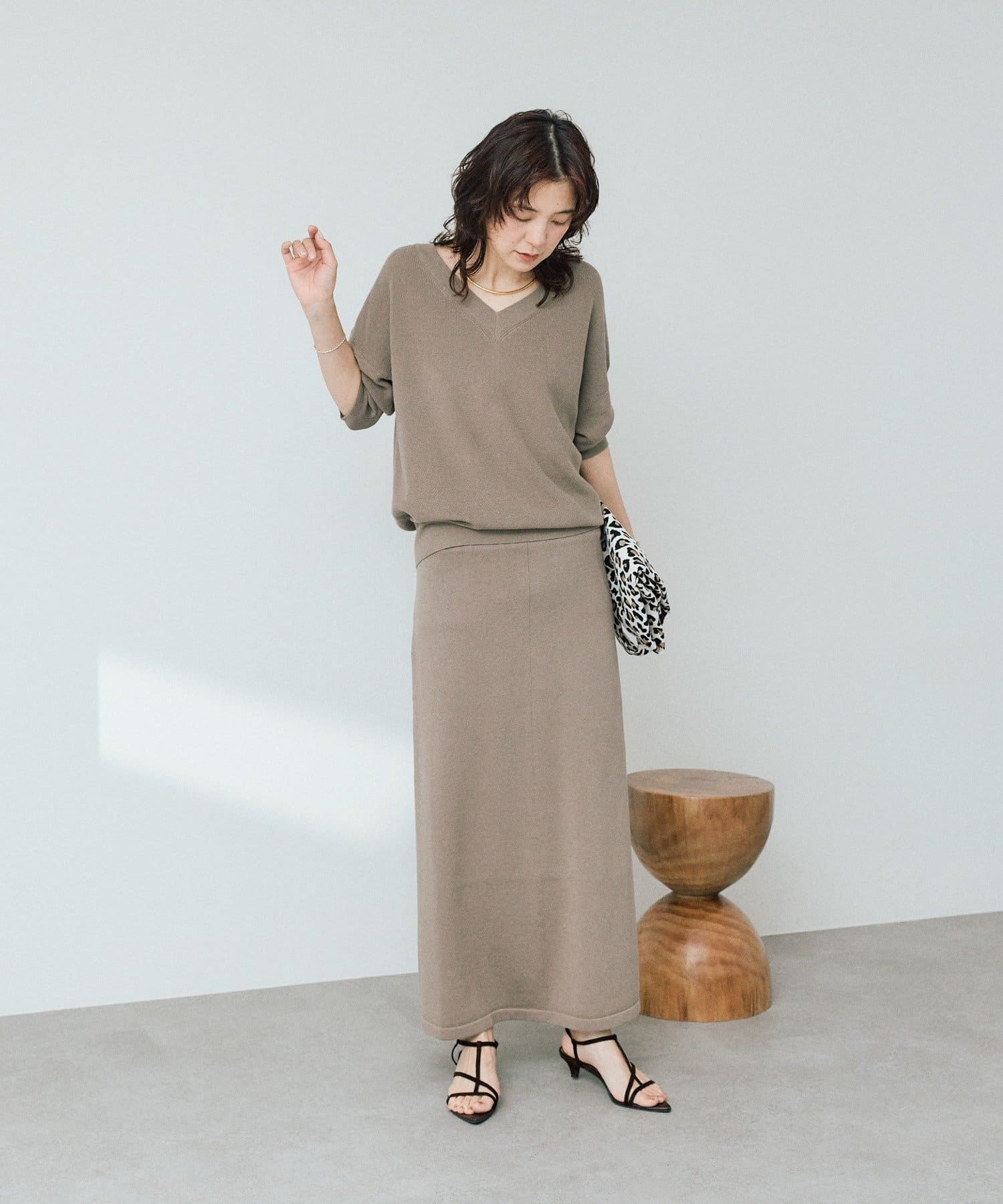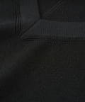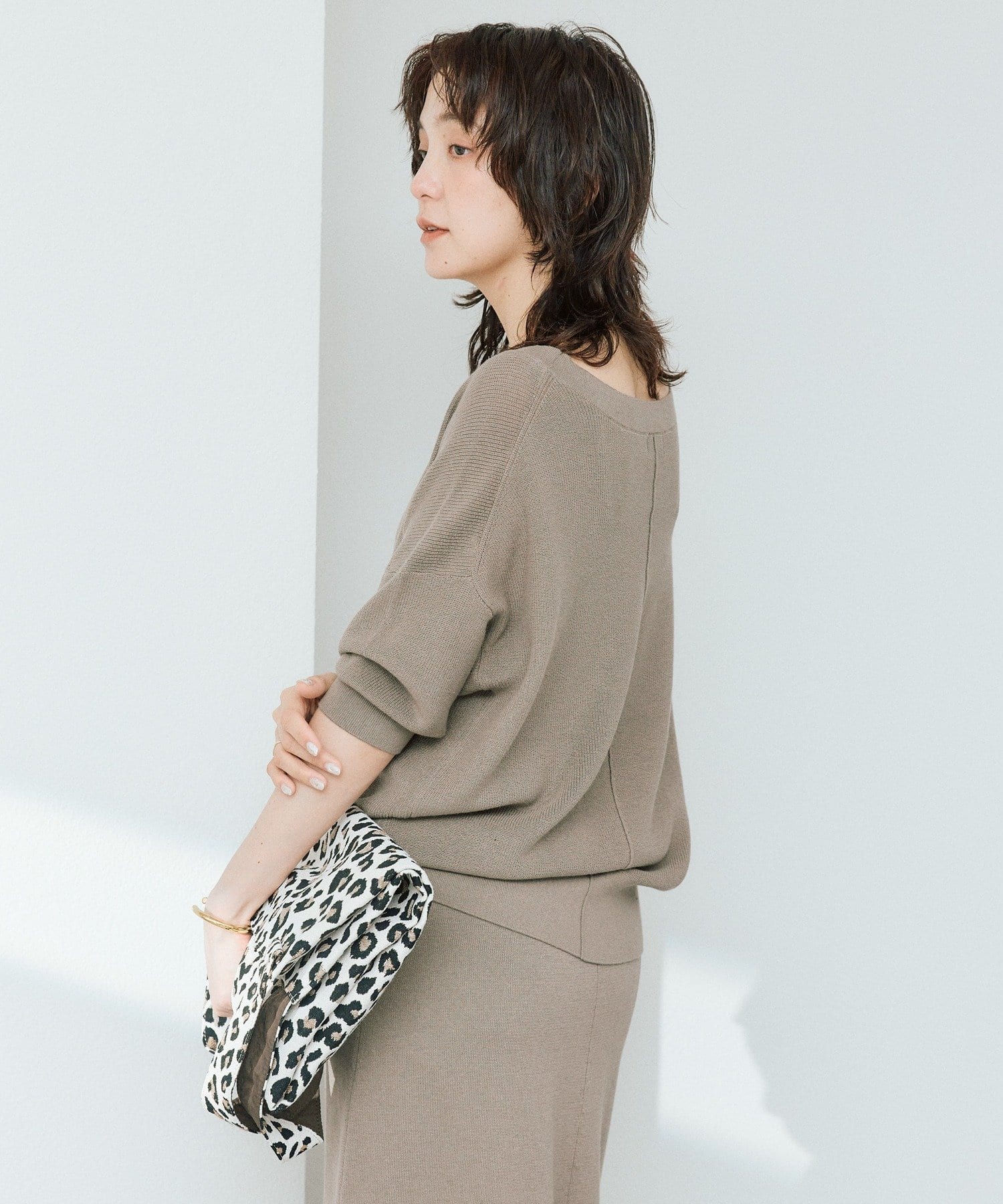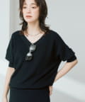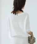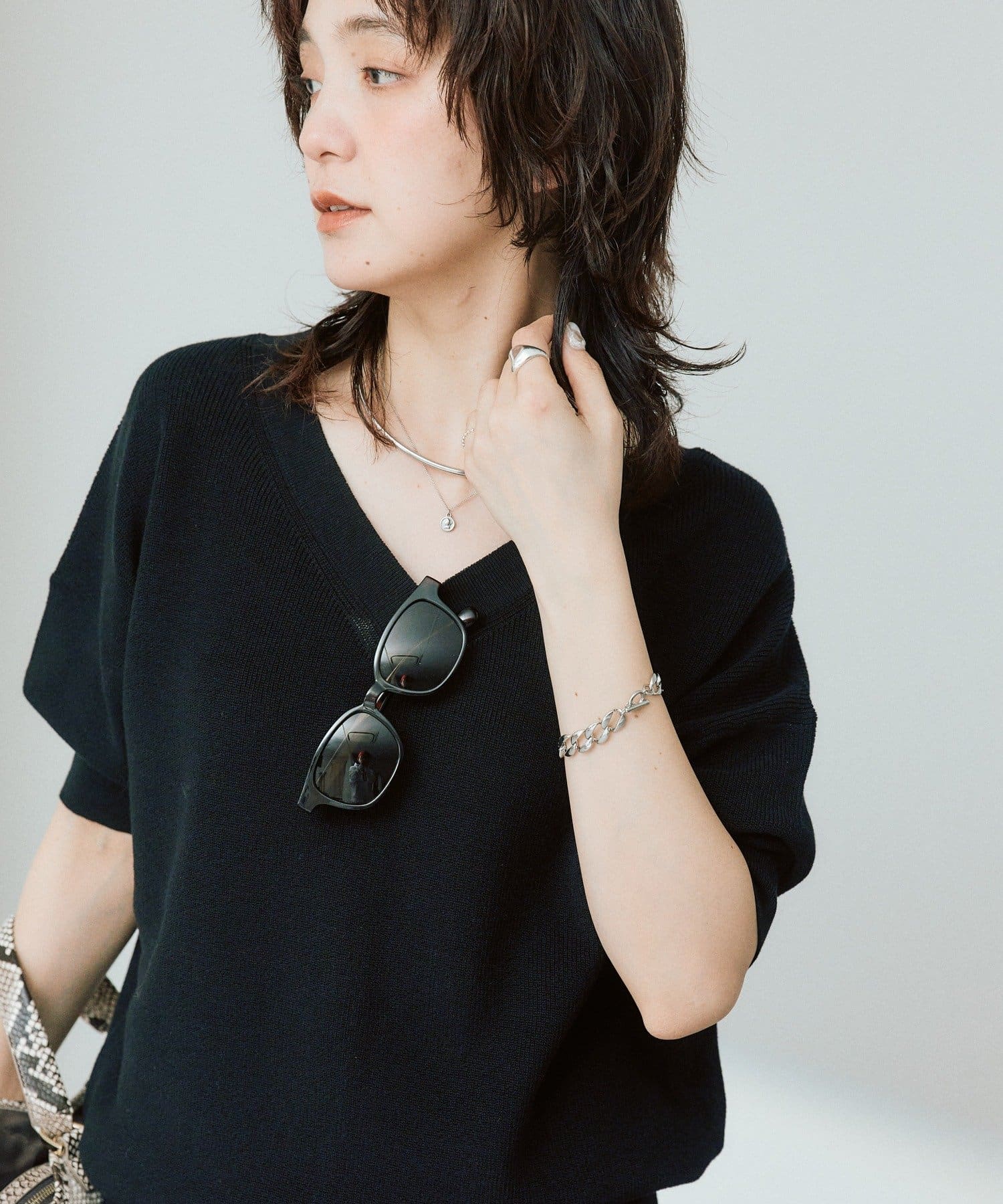 ・横に抜けた浅めのVネックで顔まわりの印象もスッキリ。