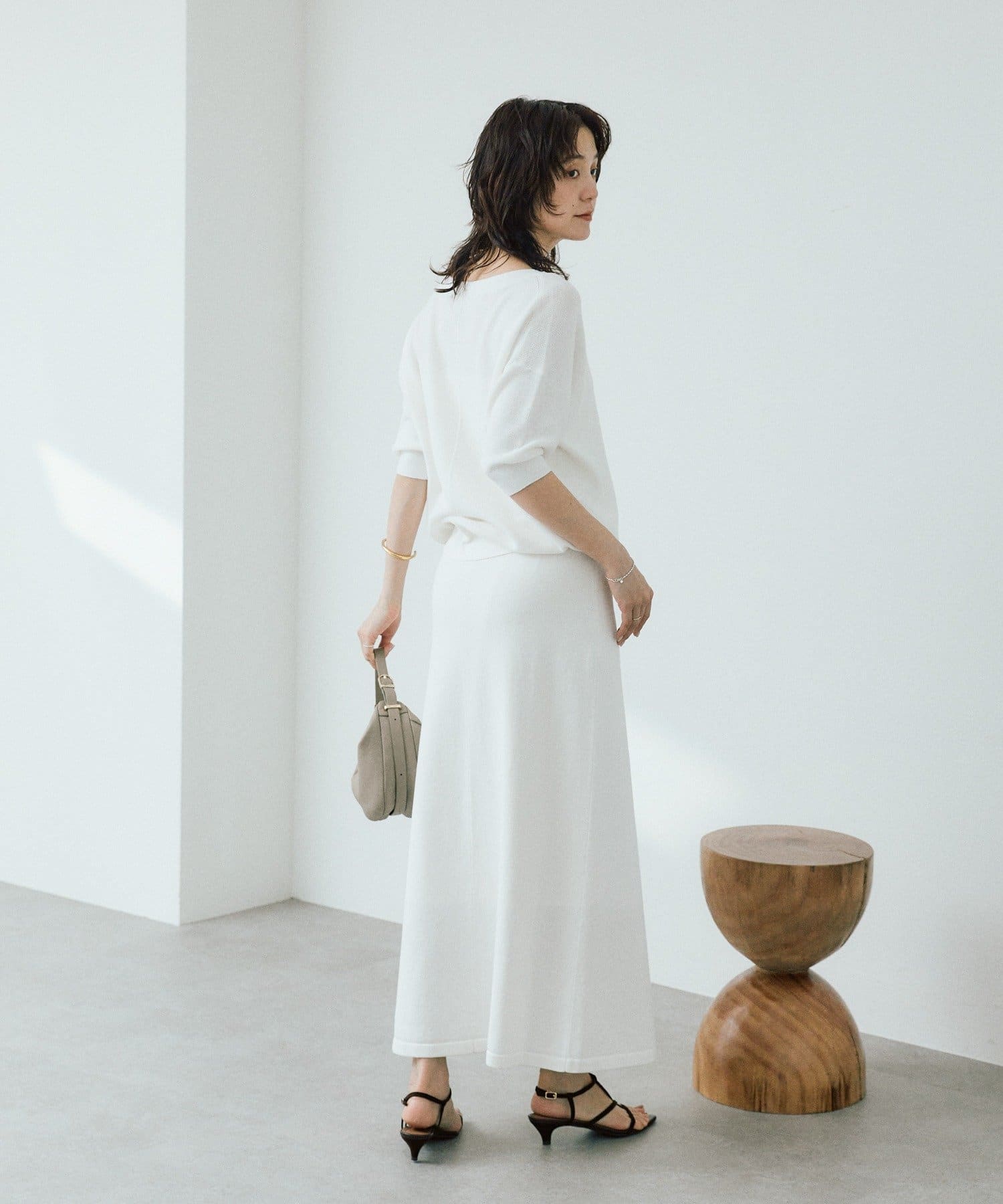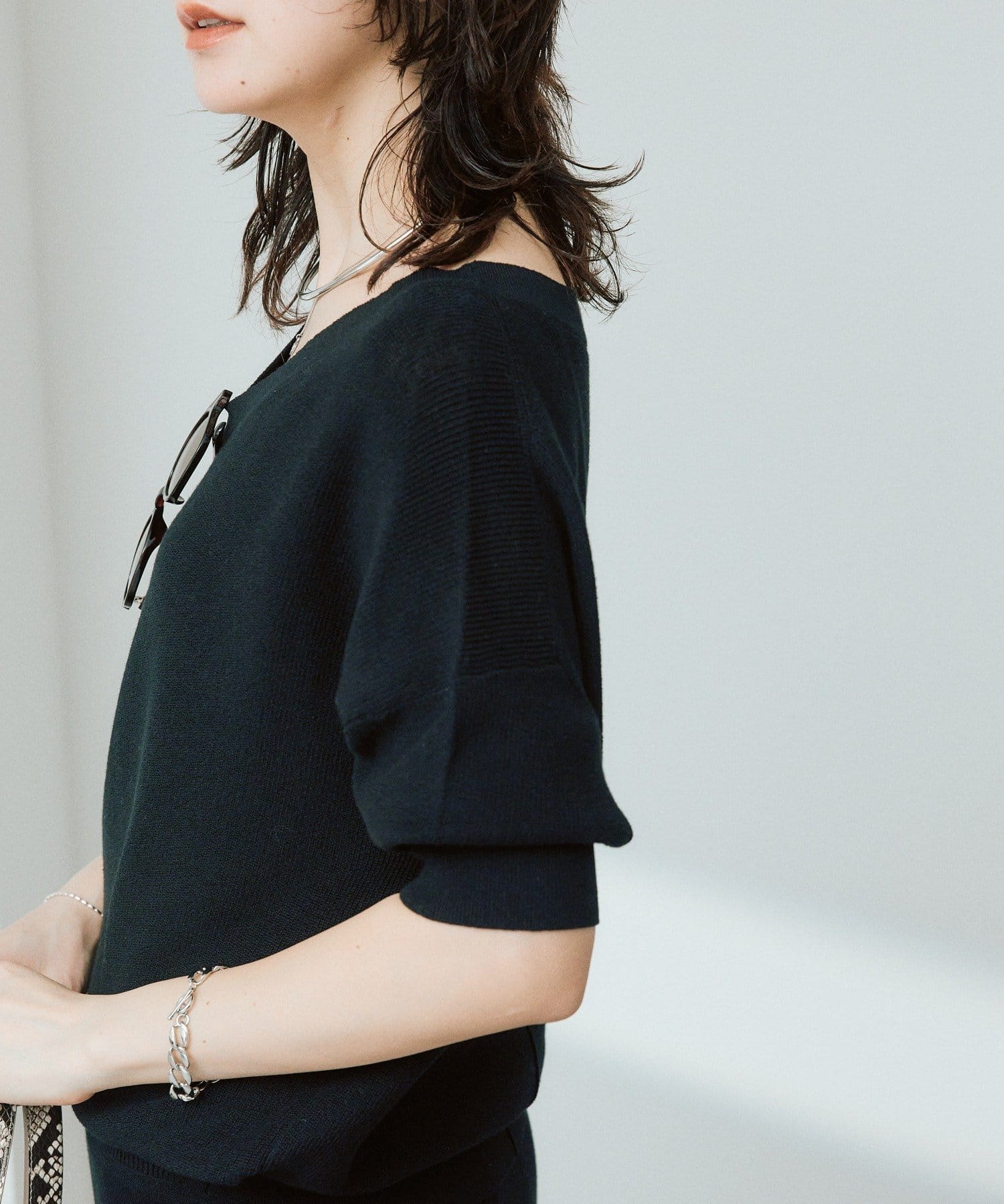 ・安心感のある五分袖は、たくし上げてパフスリーブ風に着こなすのがバランスがキレイでおすすめです。