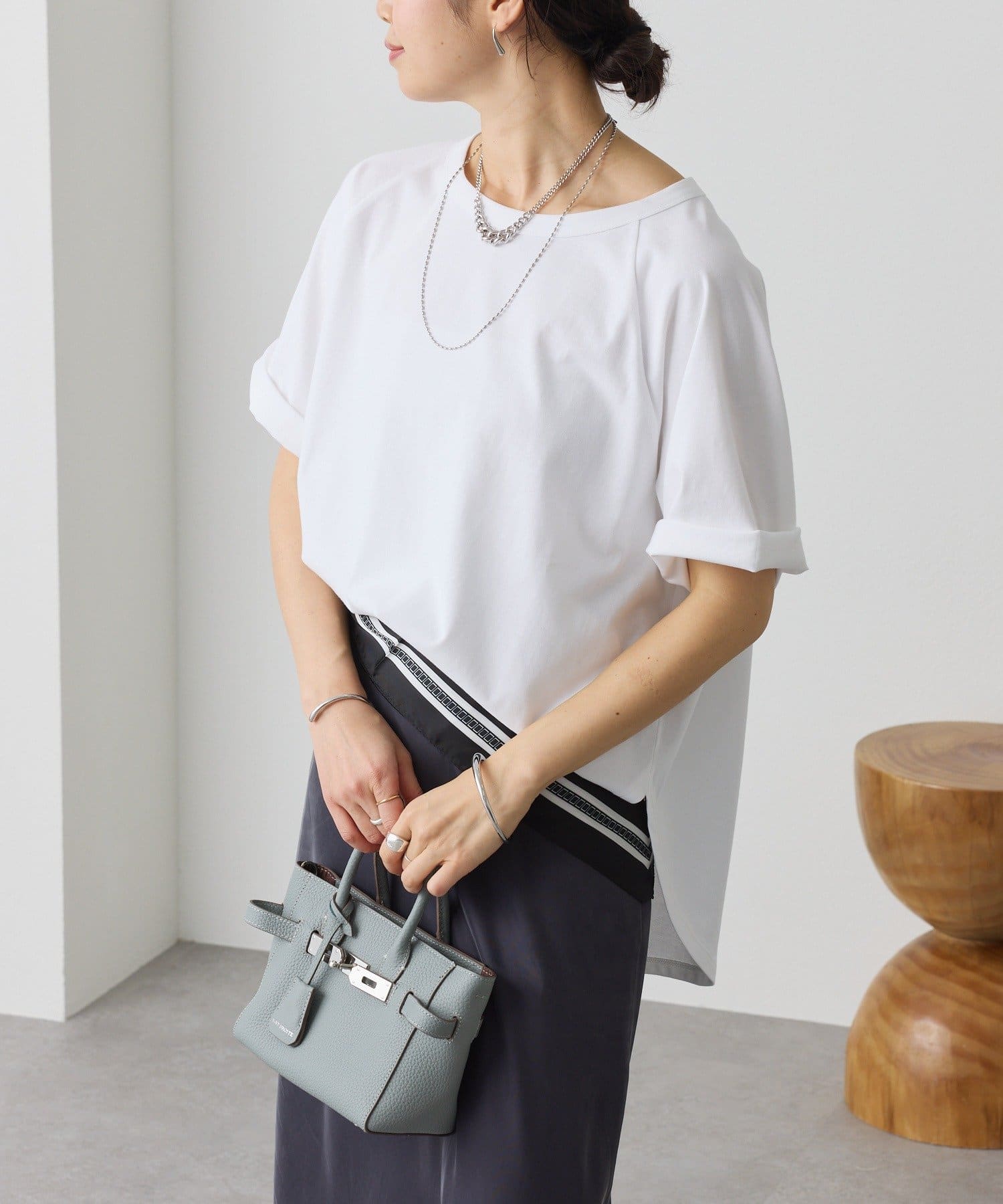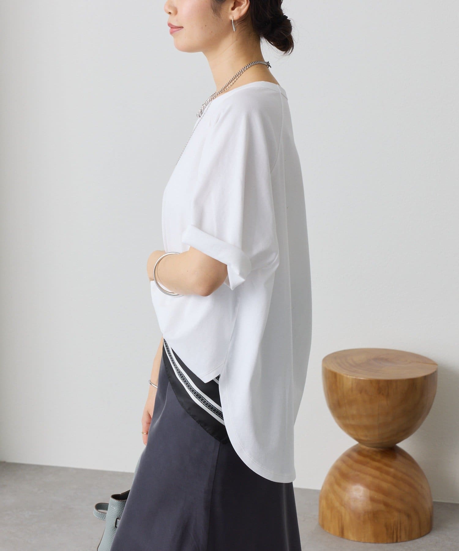 • 肘が隠れる5分袖、ヒップが隠せて抜け感も出せるラウンドヘムのデザイン