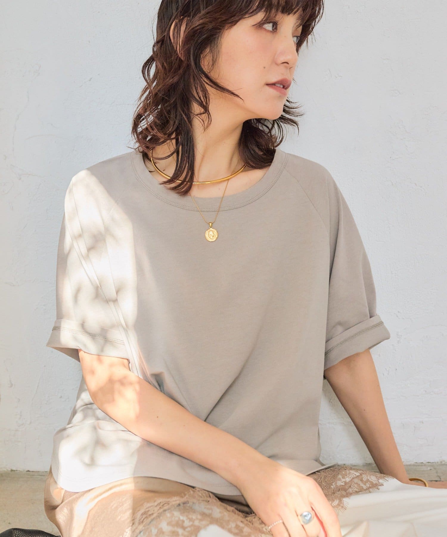 ラグランスリーブで肩まわりのなじみが良いデザイン
