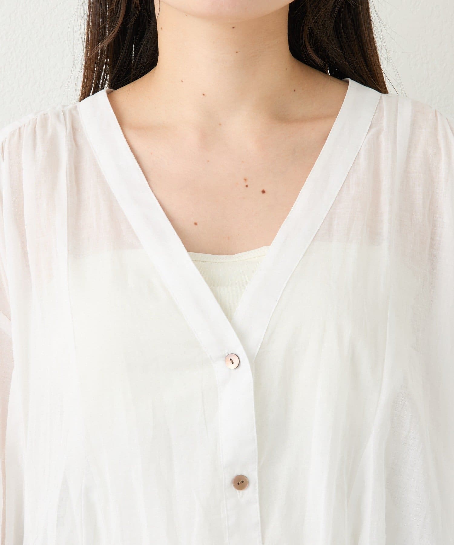 ・深めのVネック開きで甘くなりすぎず、前を開けて羽織としてもお使いいただけます