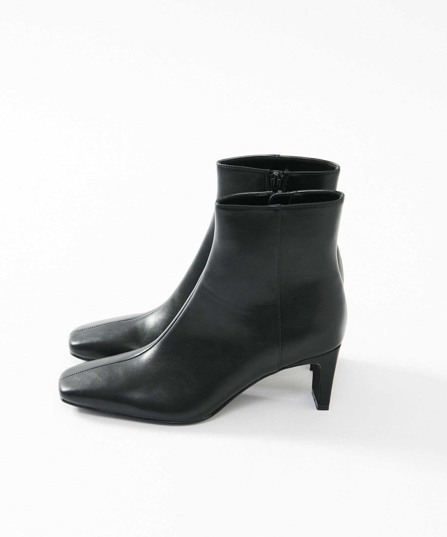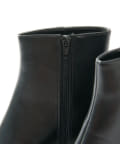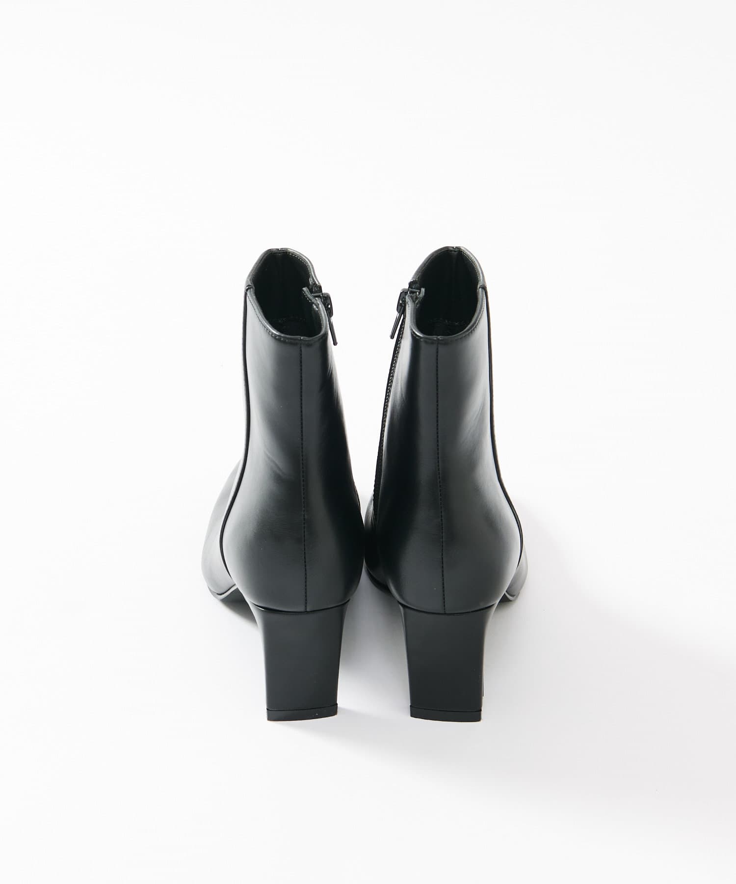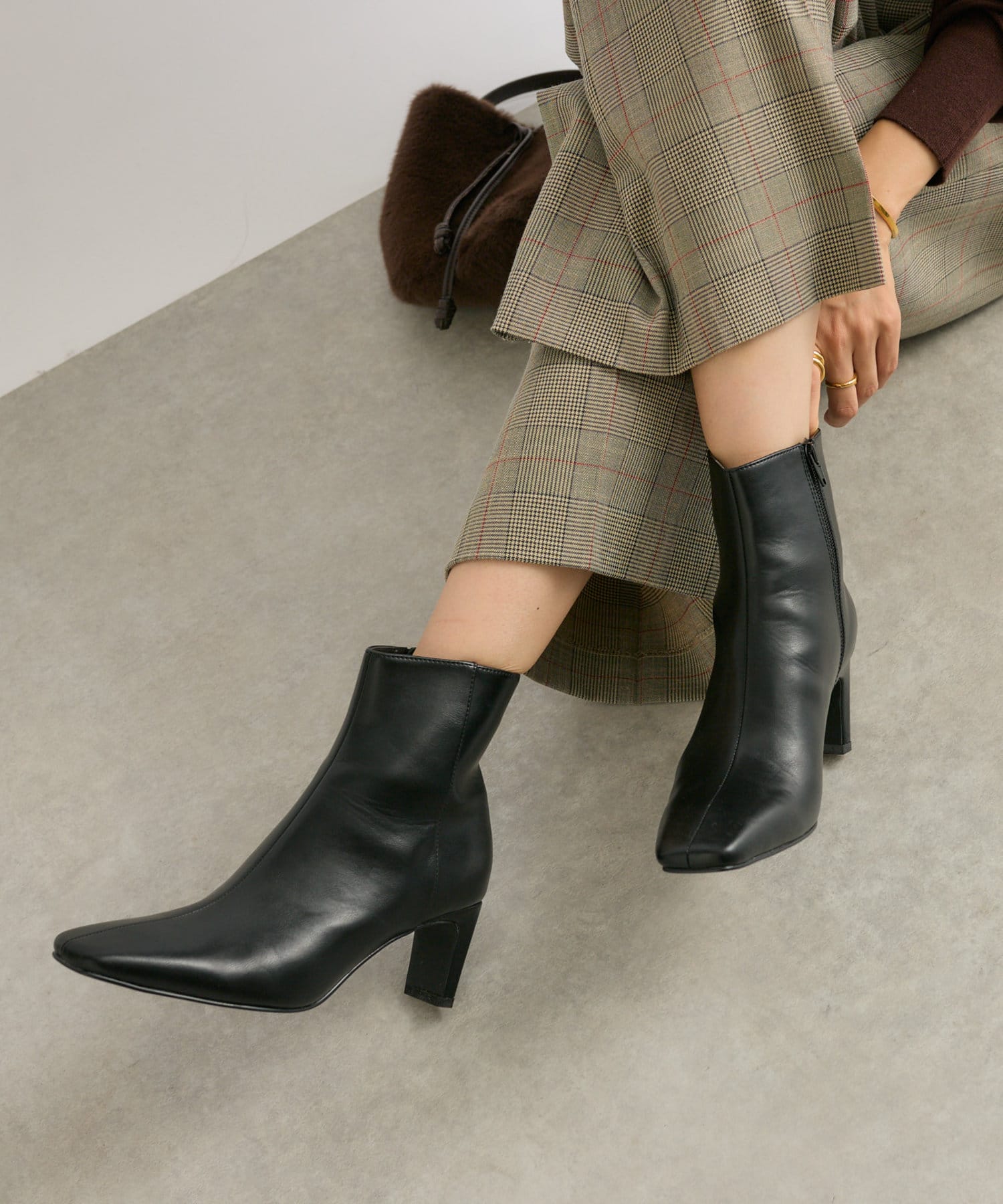 やや丸みのあるつま先のシルエットと、安定感はありつつすっきりと見えるヒールのシルエットがきれいなショートブーツ。