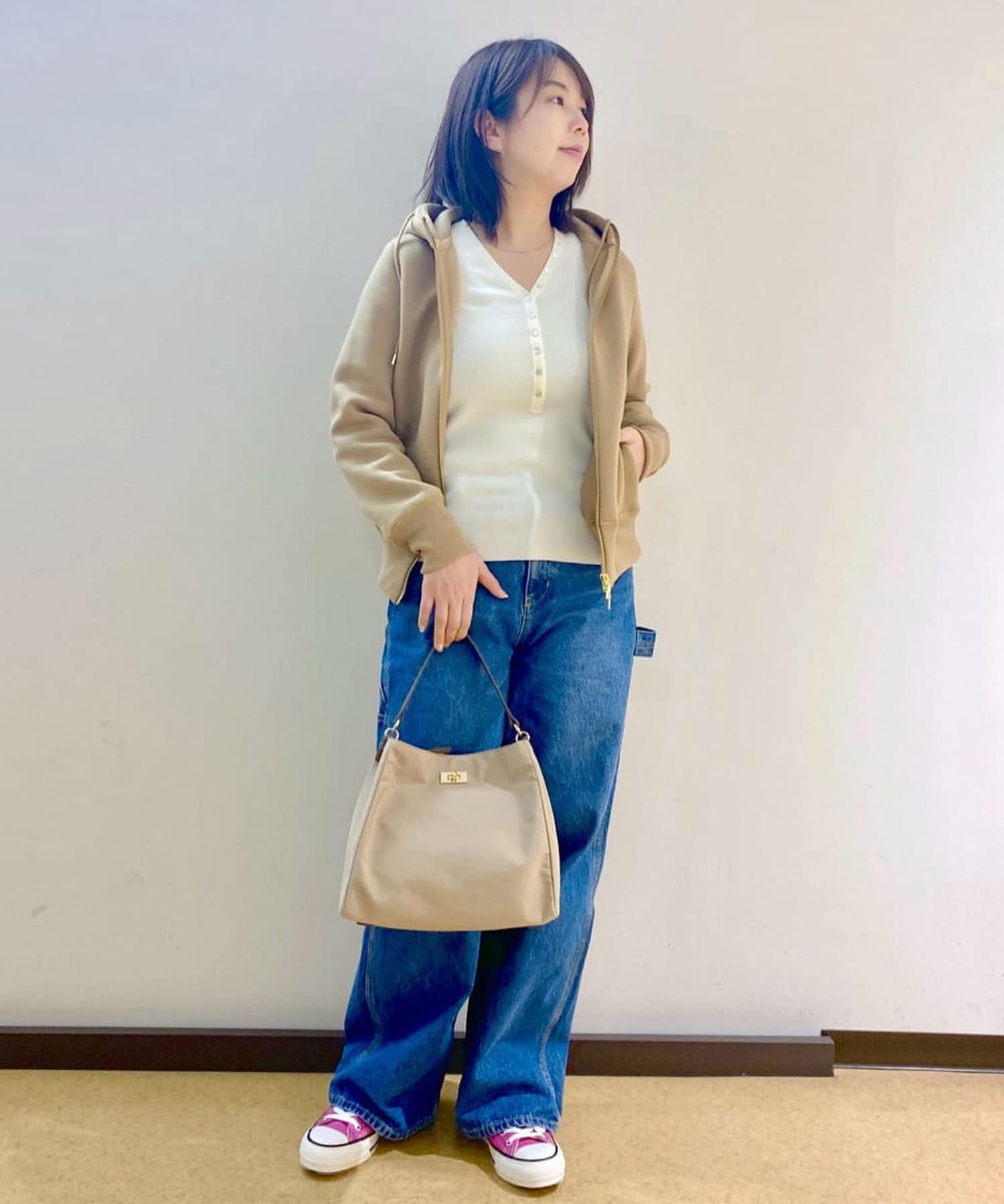 ⇒ゆるやかなフィット感で窮屈感は比較的少ないアイテムのため、薄手のインナーであればごわつきにくいと思われます。襟元の横の開きも広すぎず、一般的なキャミソールでしたらインナーを見せずに着用して頂けます。