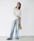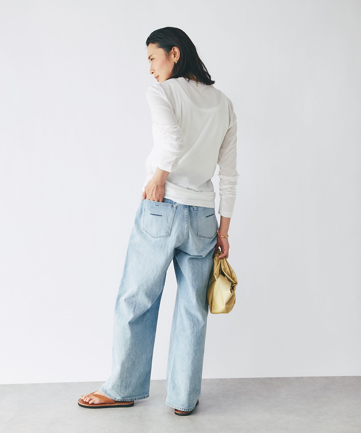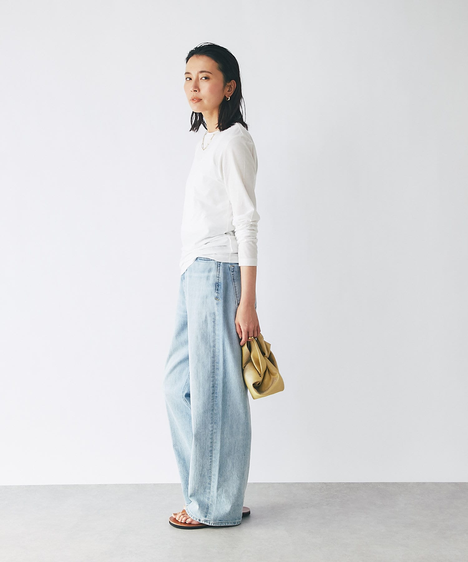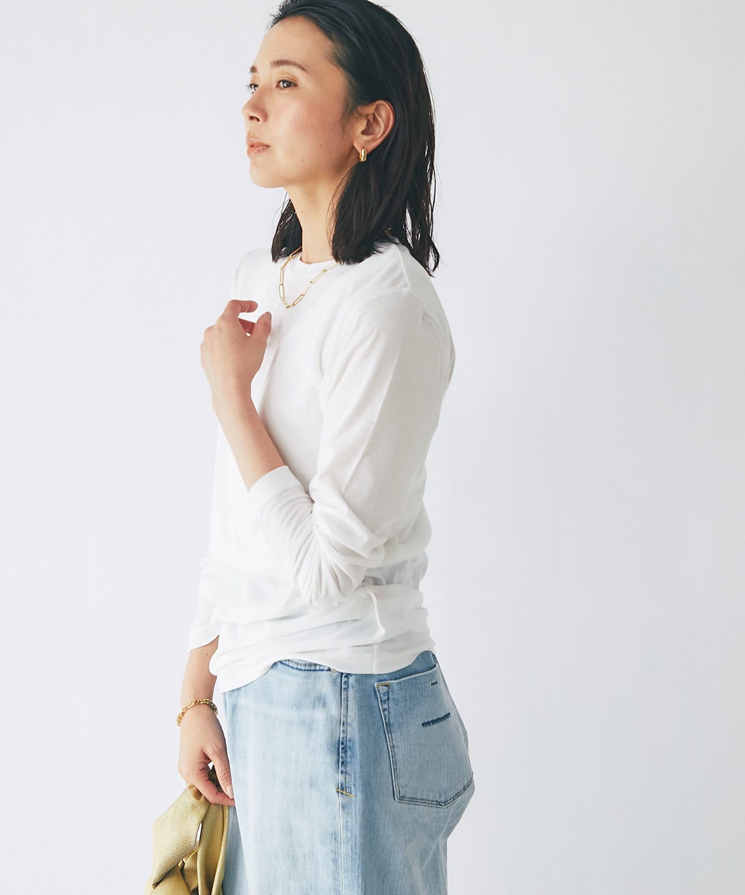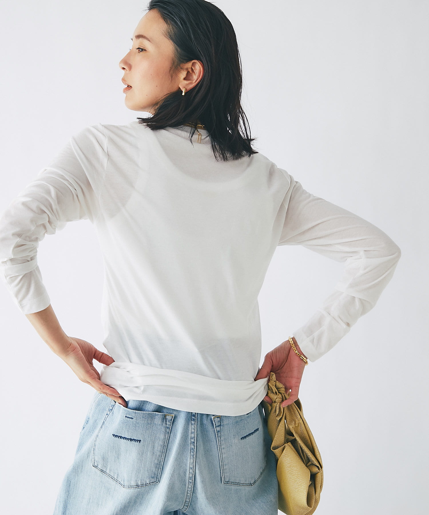 首を詰まり気味のクルーネックにしたり、袖先を長めにすることで、レイヤードの際もちらりと覗くアクセントに。もちろん一枚でも楽しめるこだわりの詰まったアイテム。