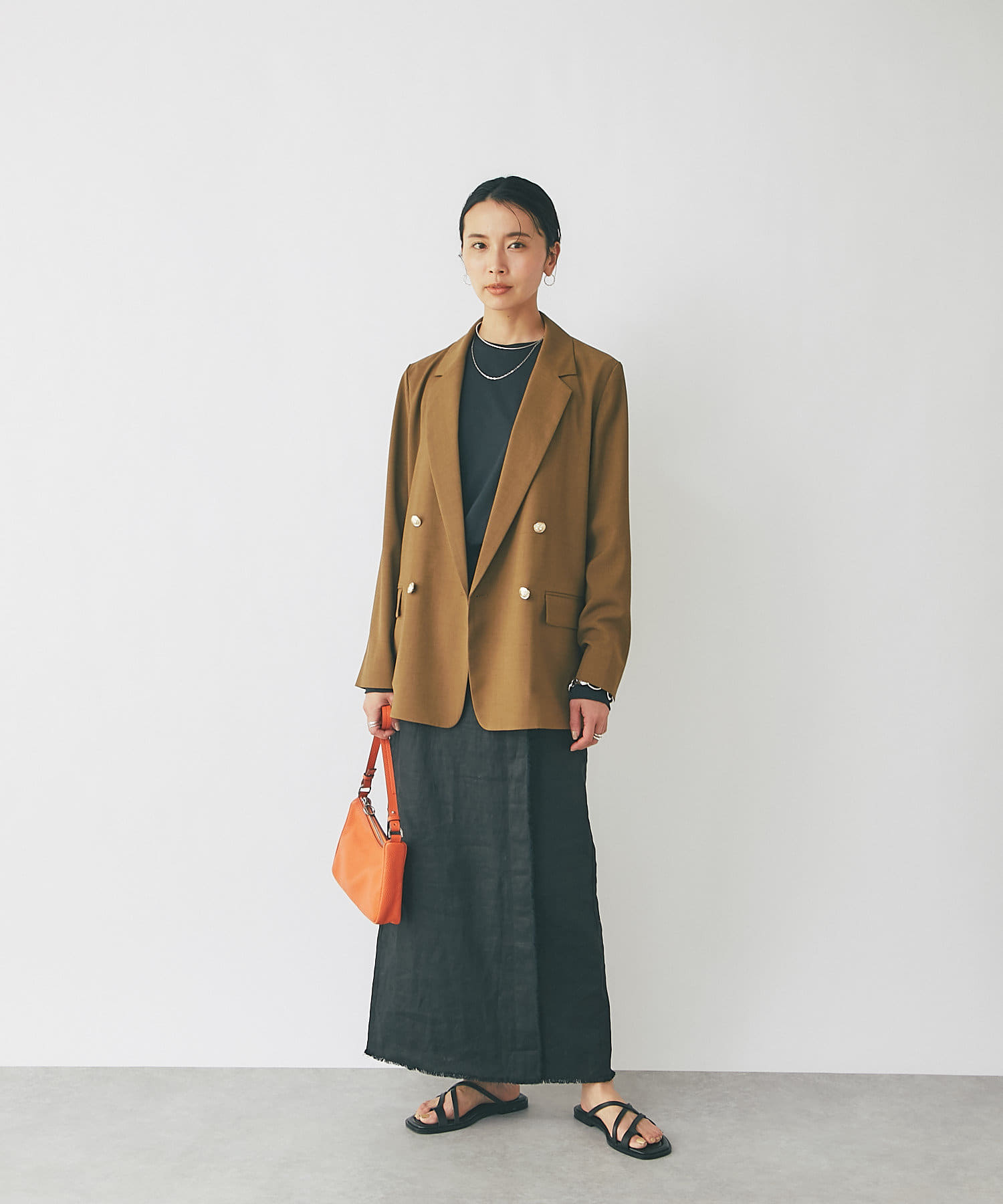 デニムジャケットやオーバーサイズジャケットのINに着るのもおすすめ。ボトムはトレンドのルーズデニムやスラックス、ロングのタイトスカートと合わせて大人カジュアルな着こなしがハマります。