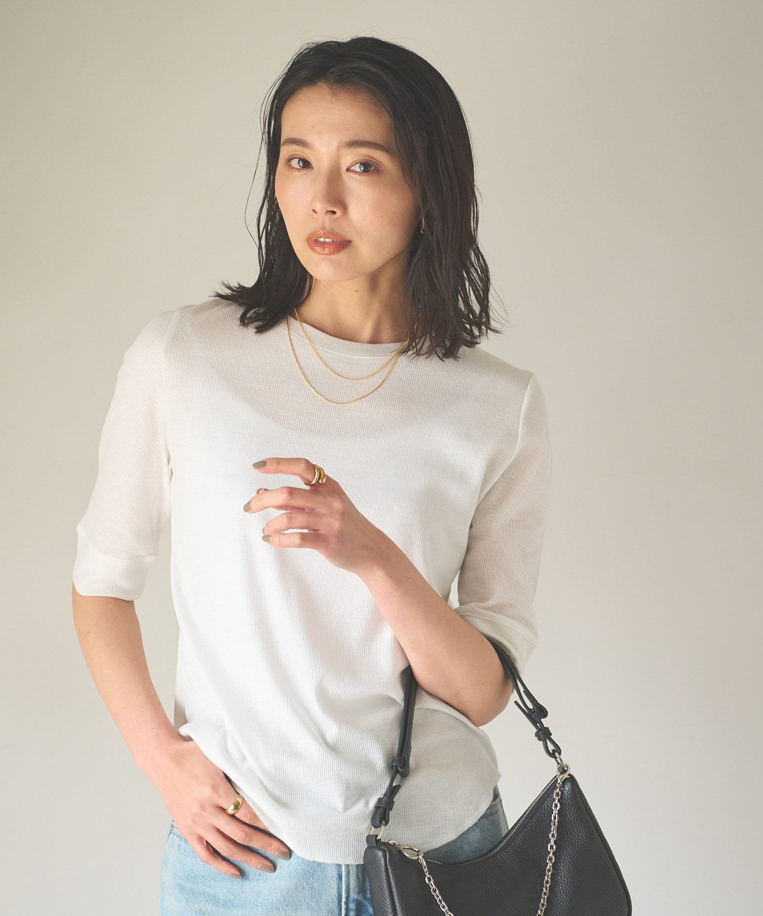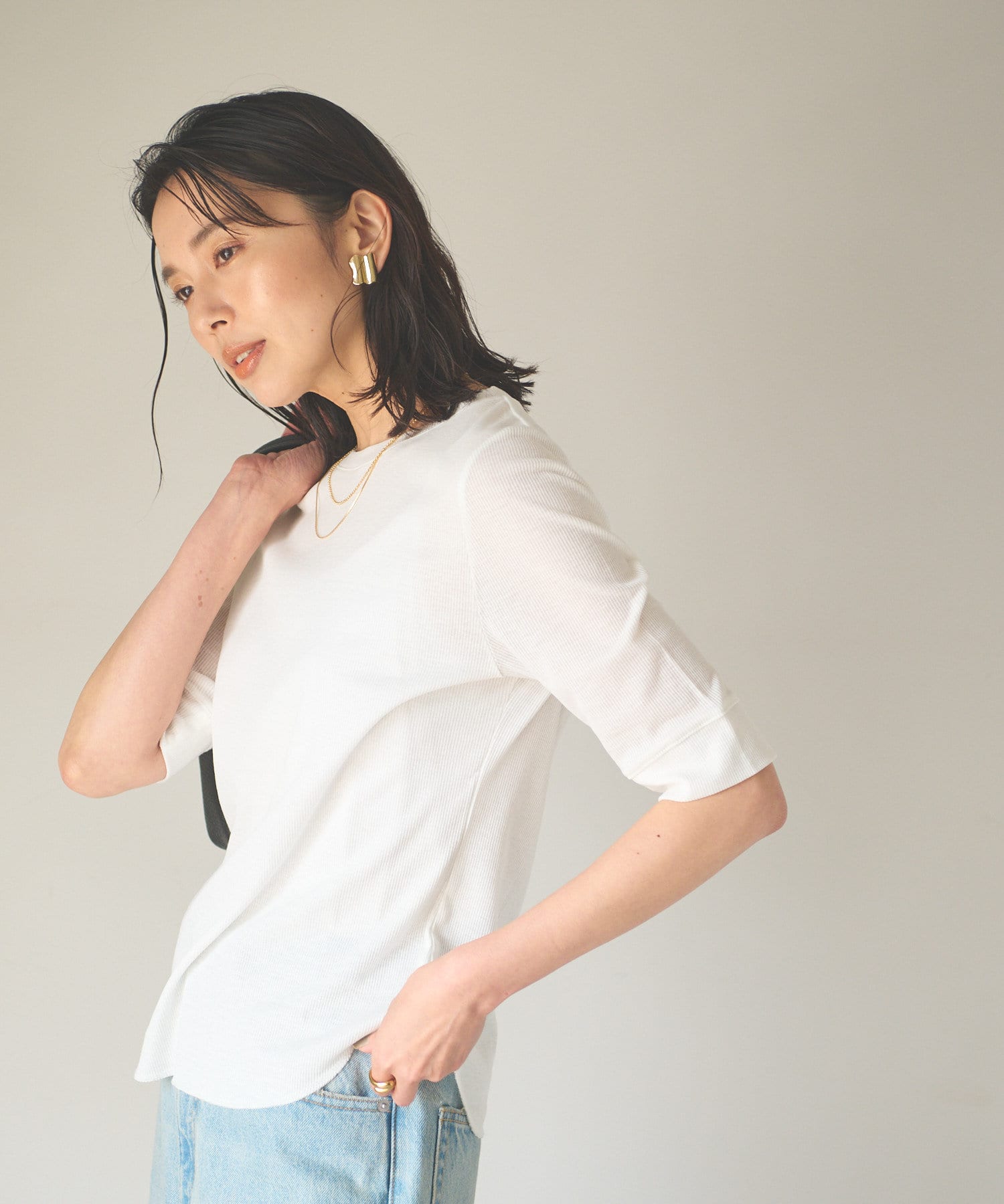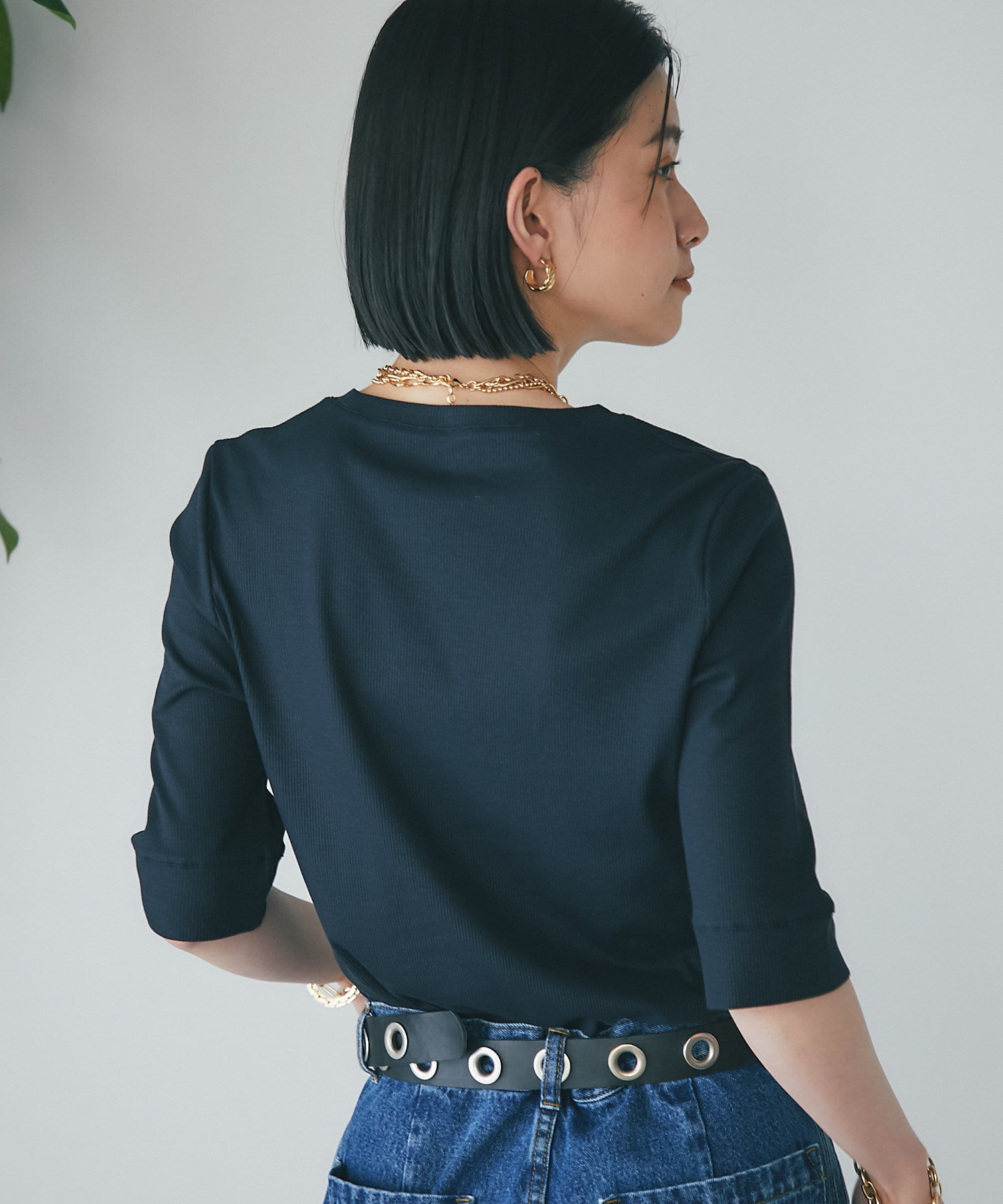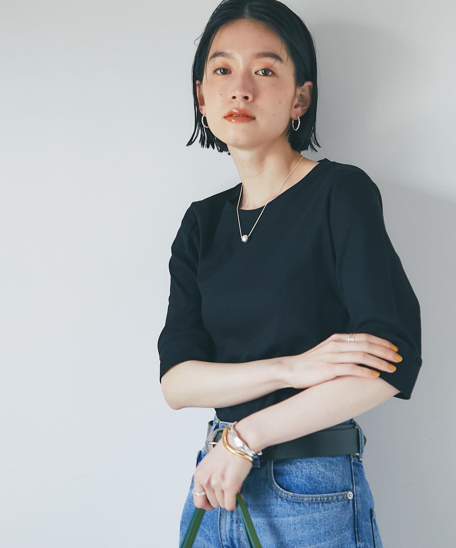 5分袖丈で半袖よりも比較的長い期間着用していただけますので、肌寒い日にはジャケットのインナーに、夏になったら1枚でシンプルな合わせと、様々なスタイルに活用していただけます。
