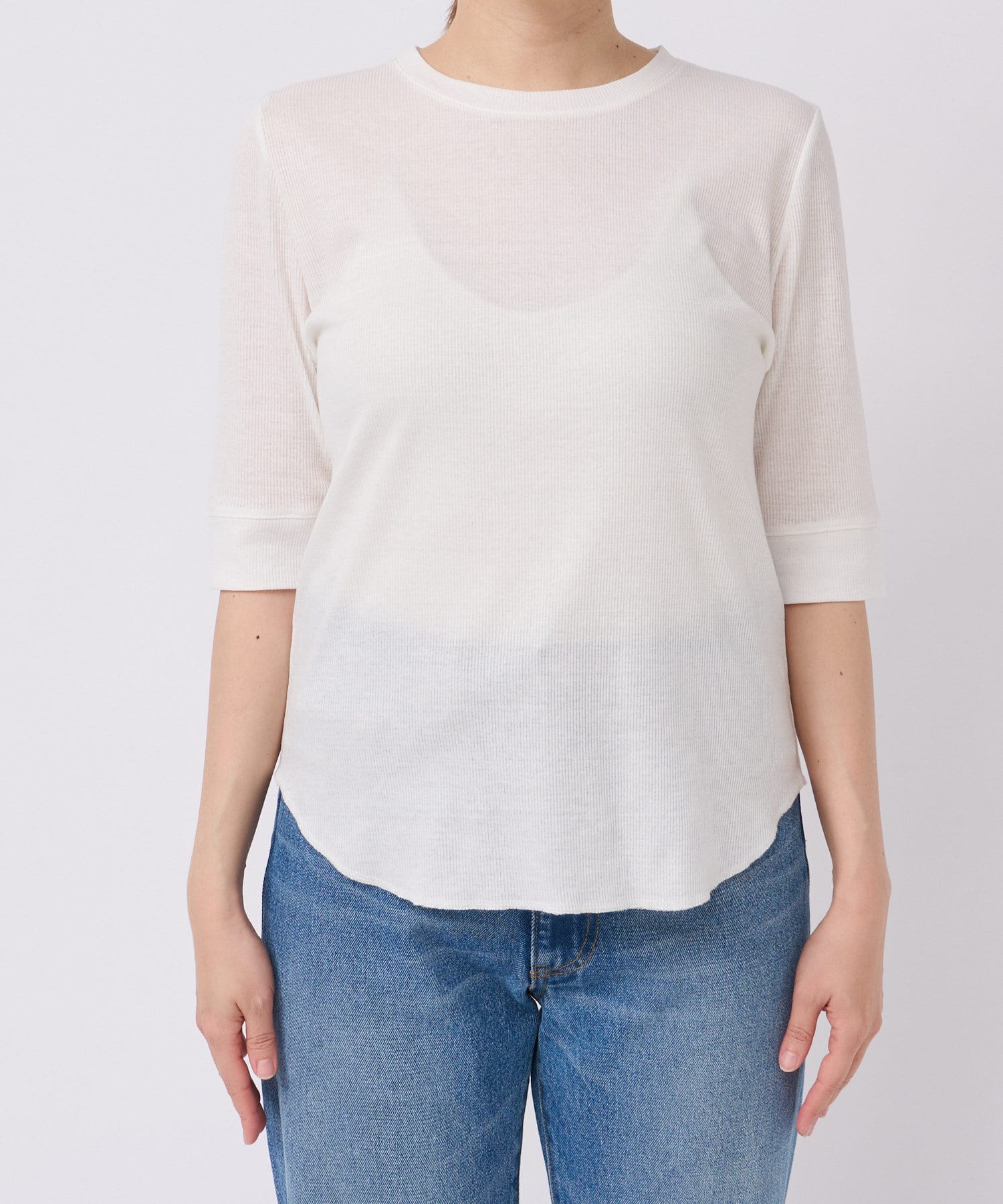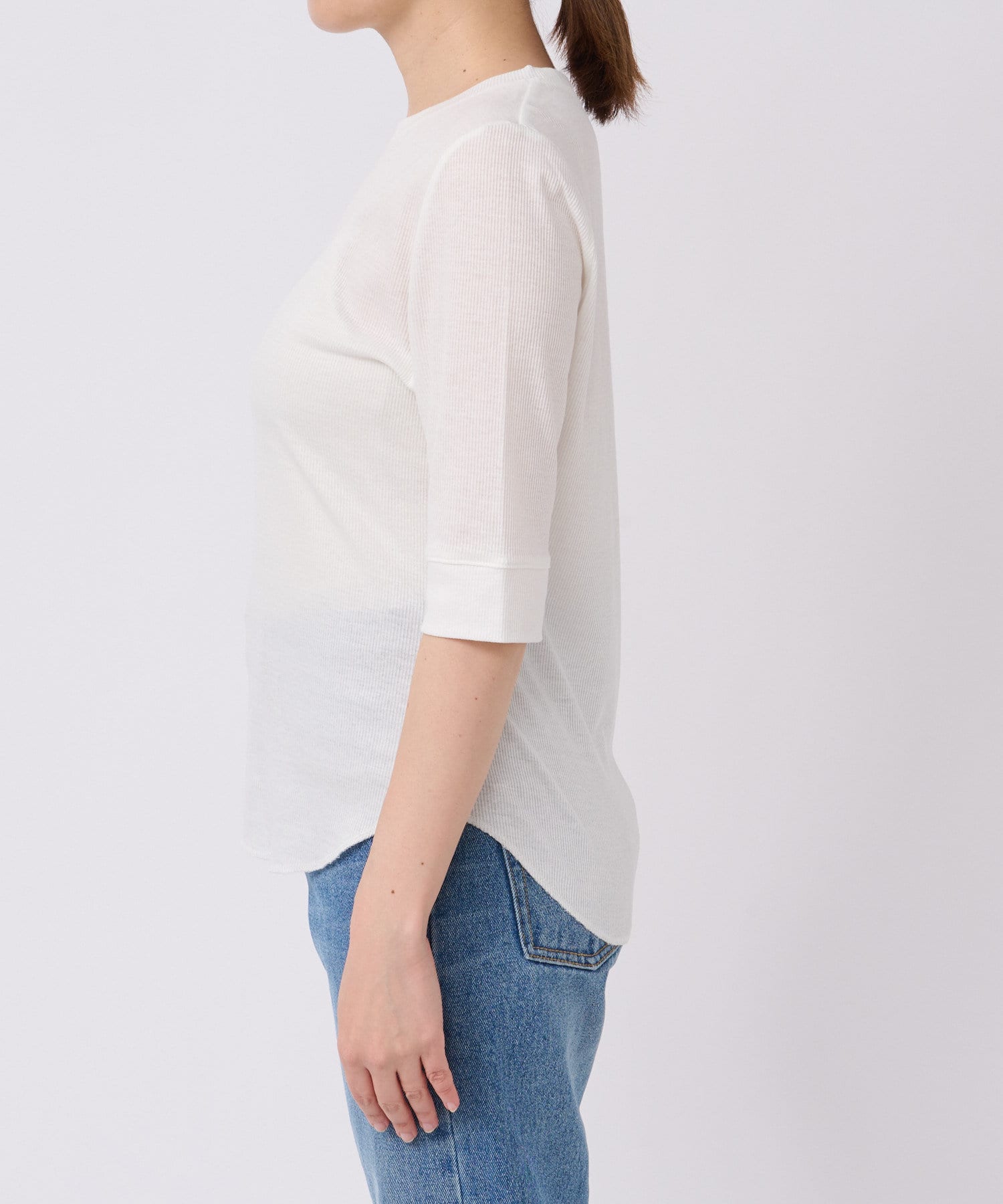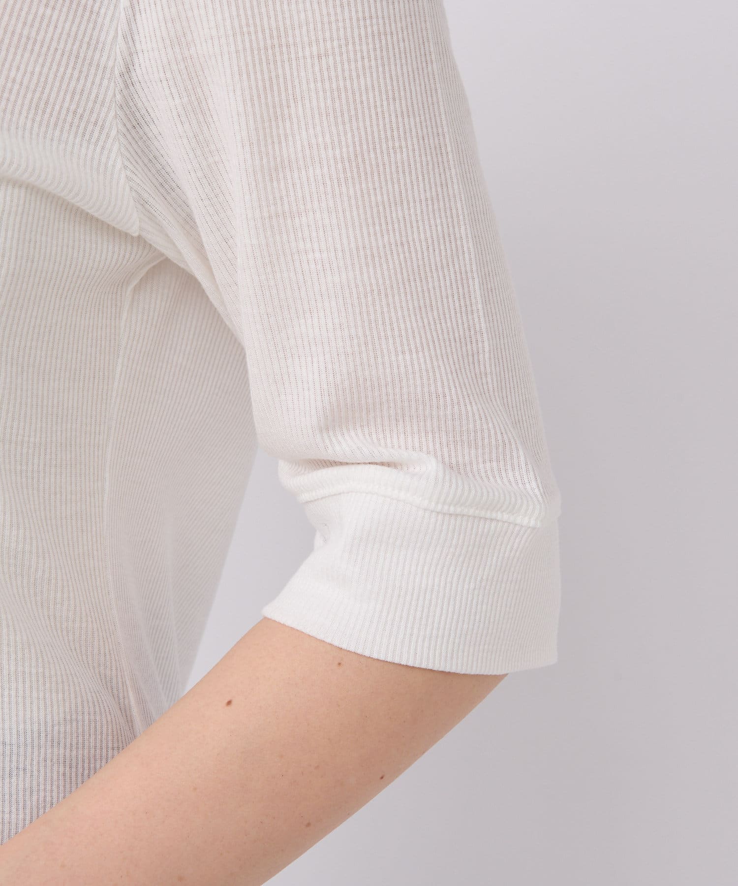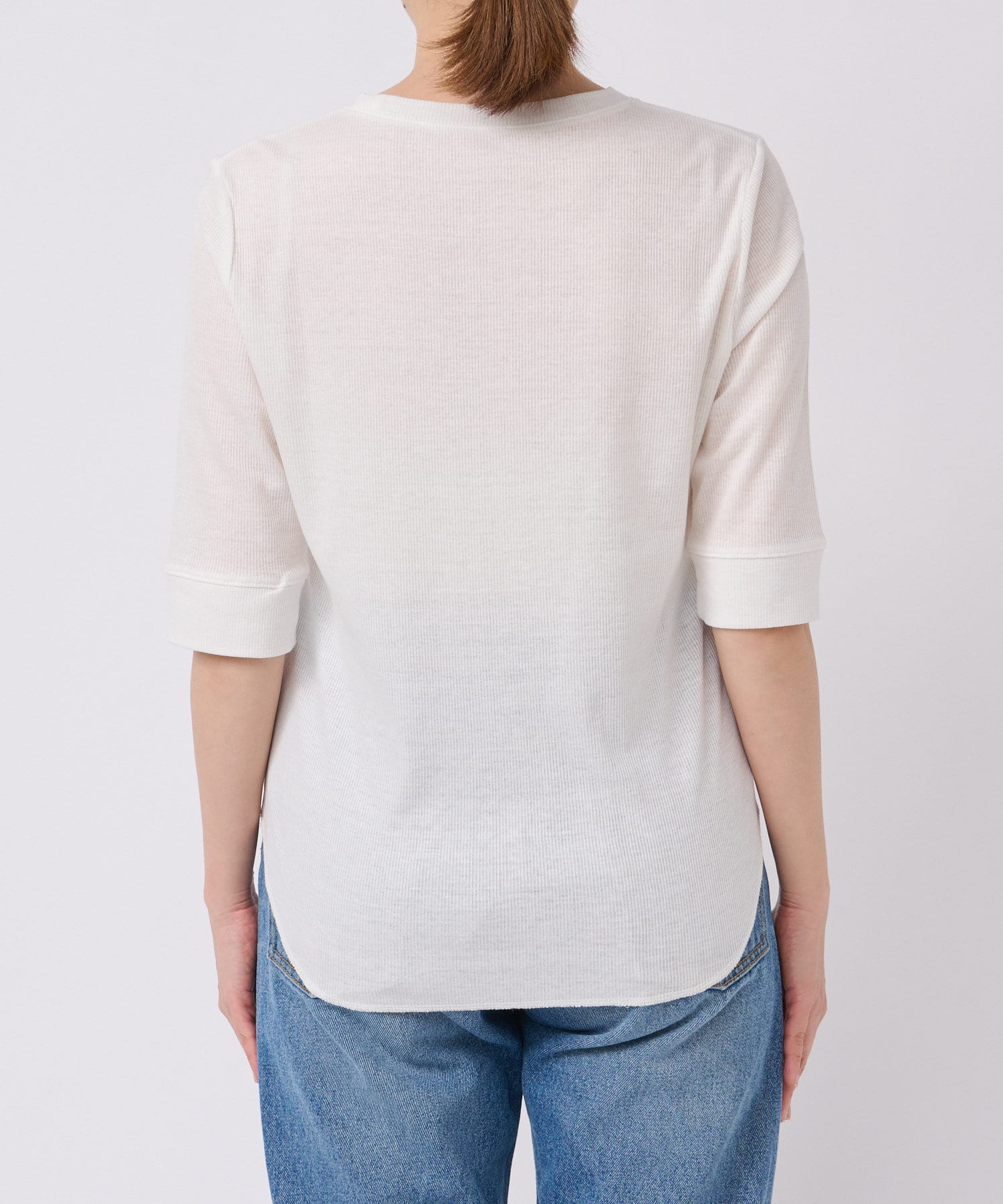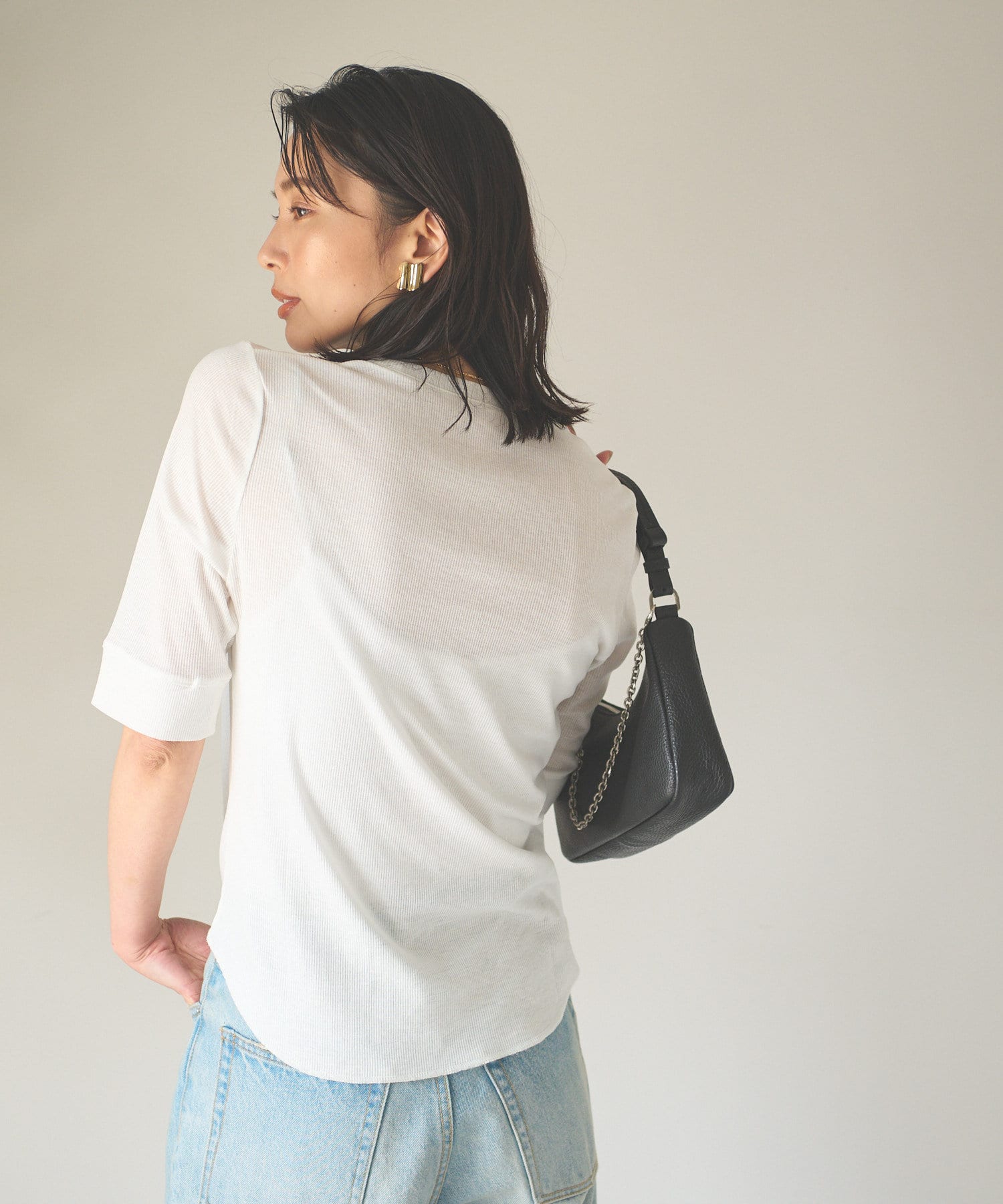 5分袖丈で半袖よりも比較的長い期間着用していただけますので、肌寒い日にはジャケットのインナーに、夏になったら1枚でシンプルな合わせと、様々なスタイルに活用していただけます。
