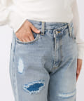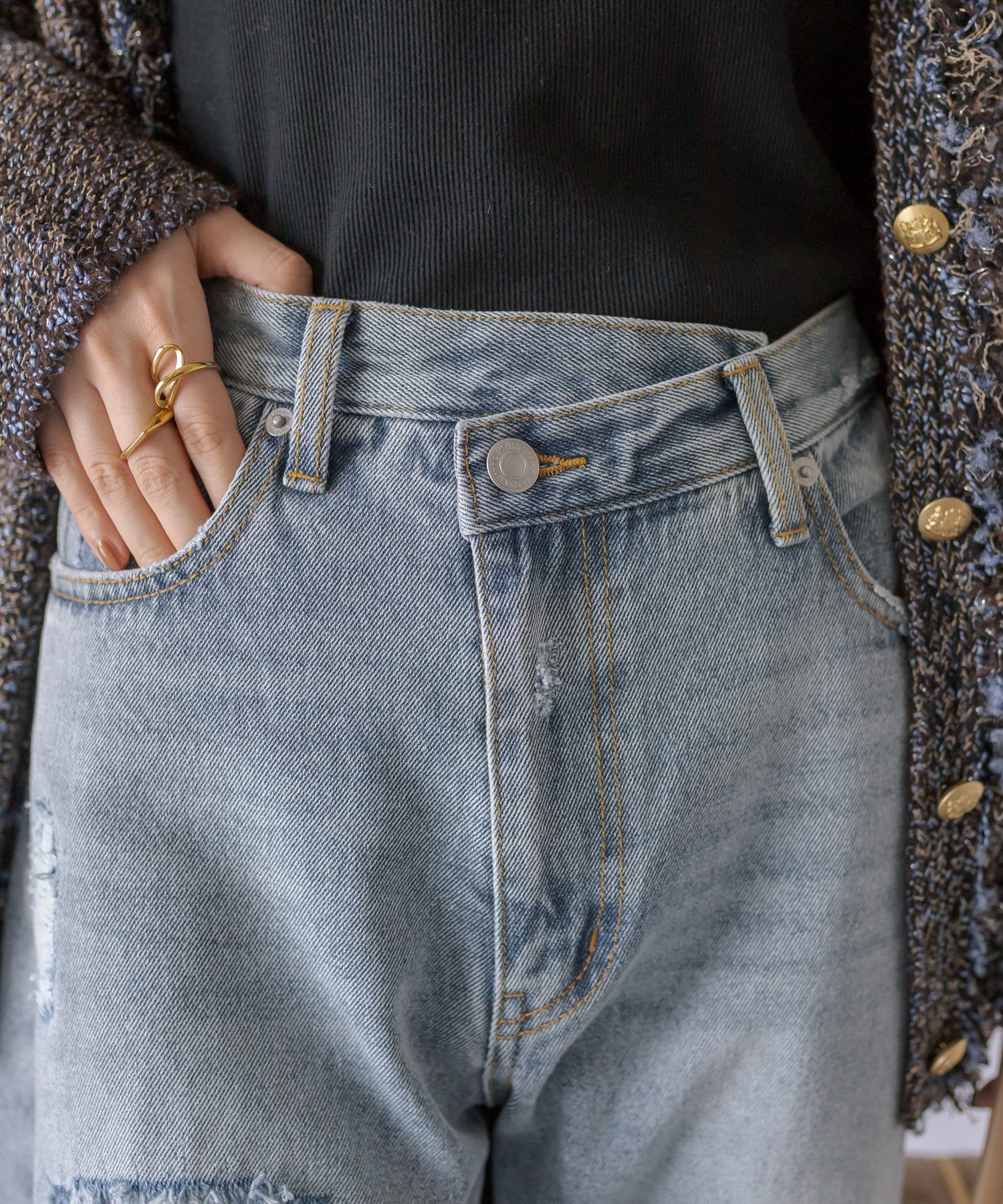リペアデザインを思い切り生かしてシンプルにTシャツやニットなどと合わせると素敵です。