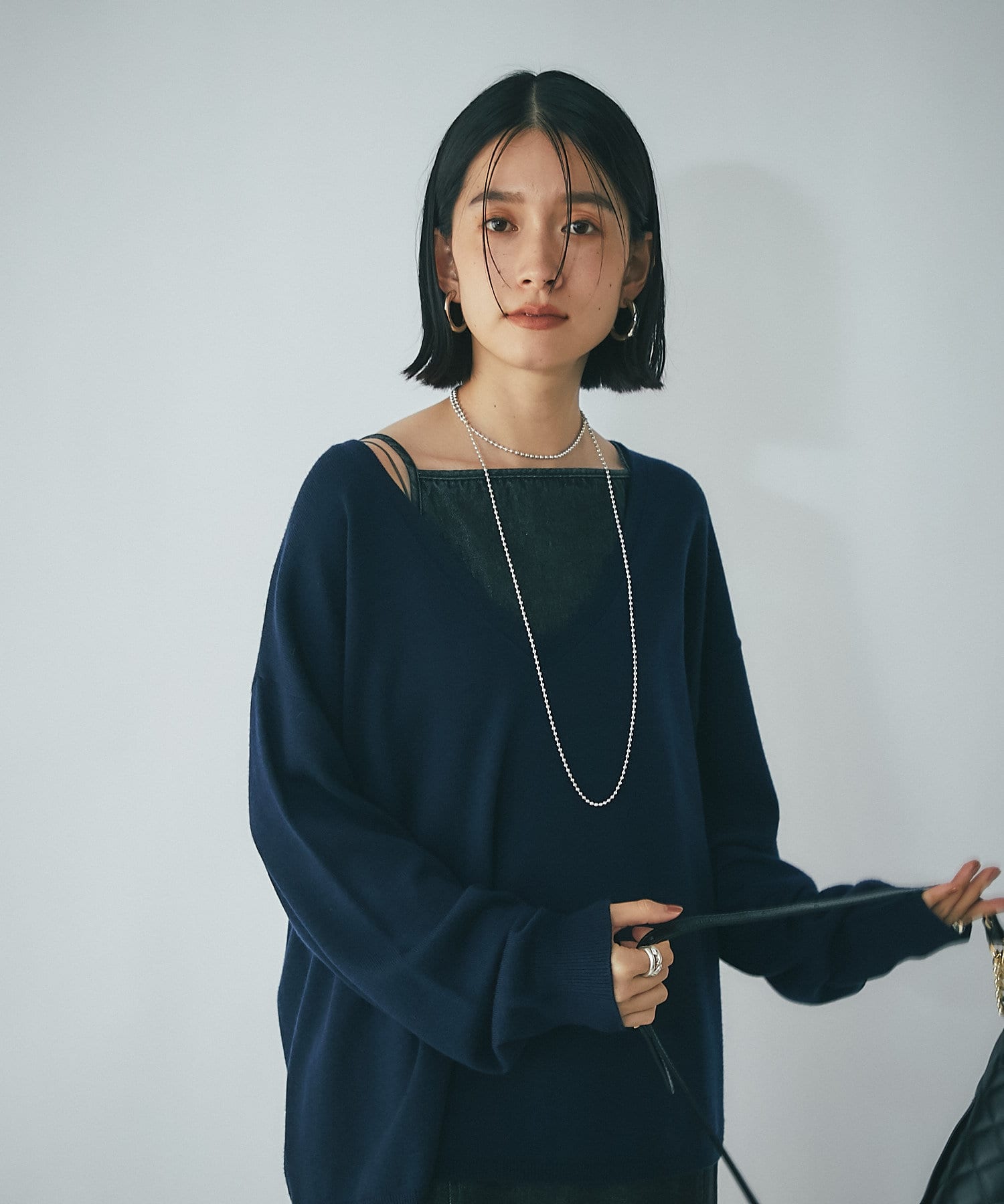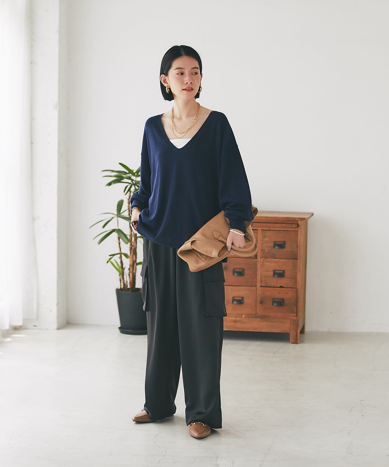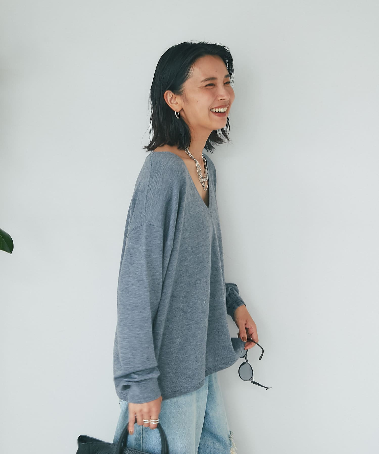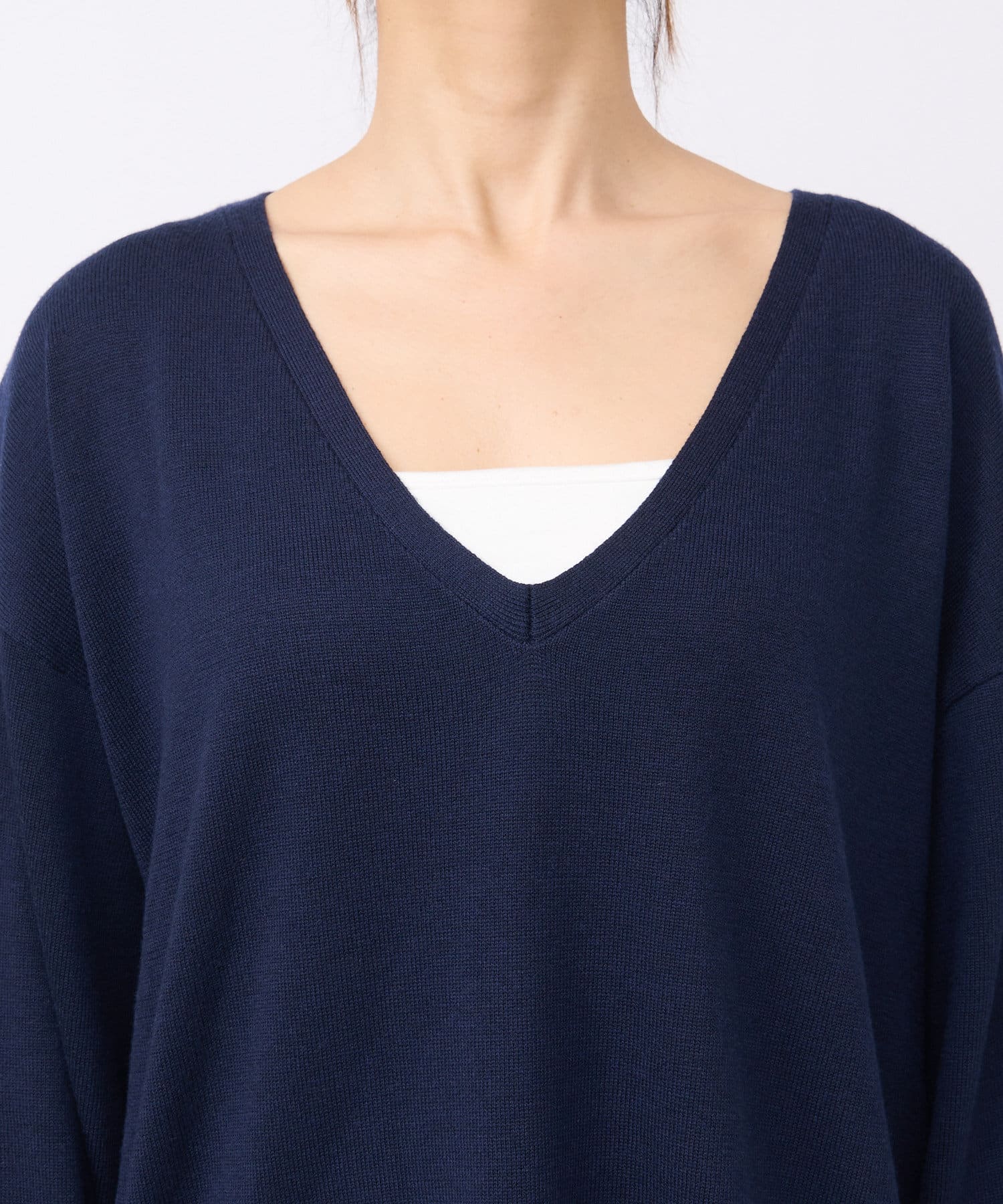 ・深めのVネックですっきりした印象