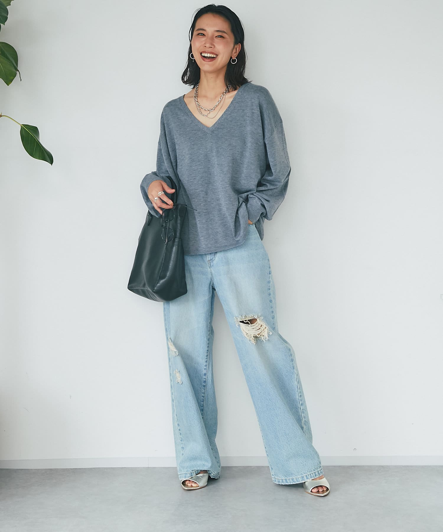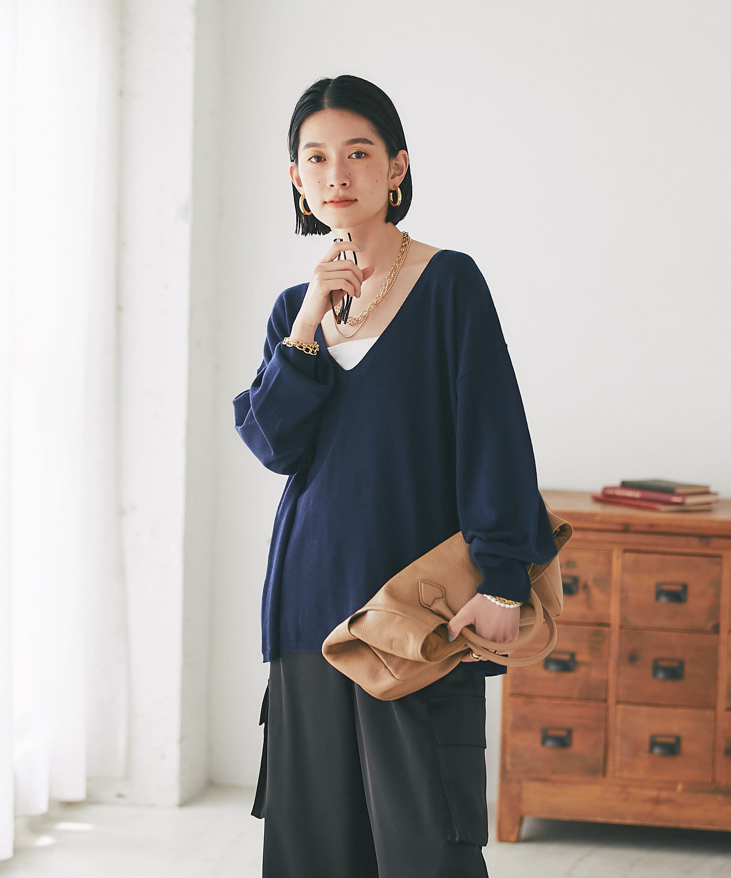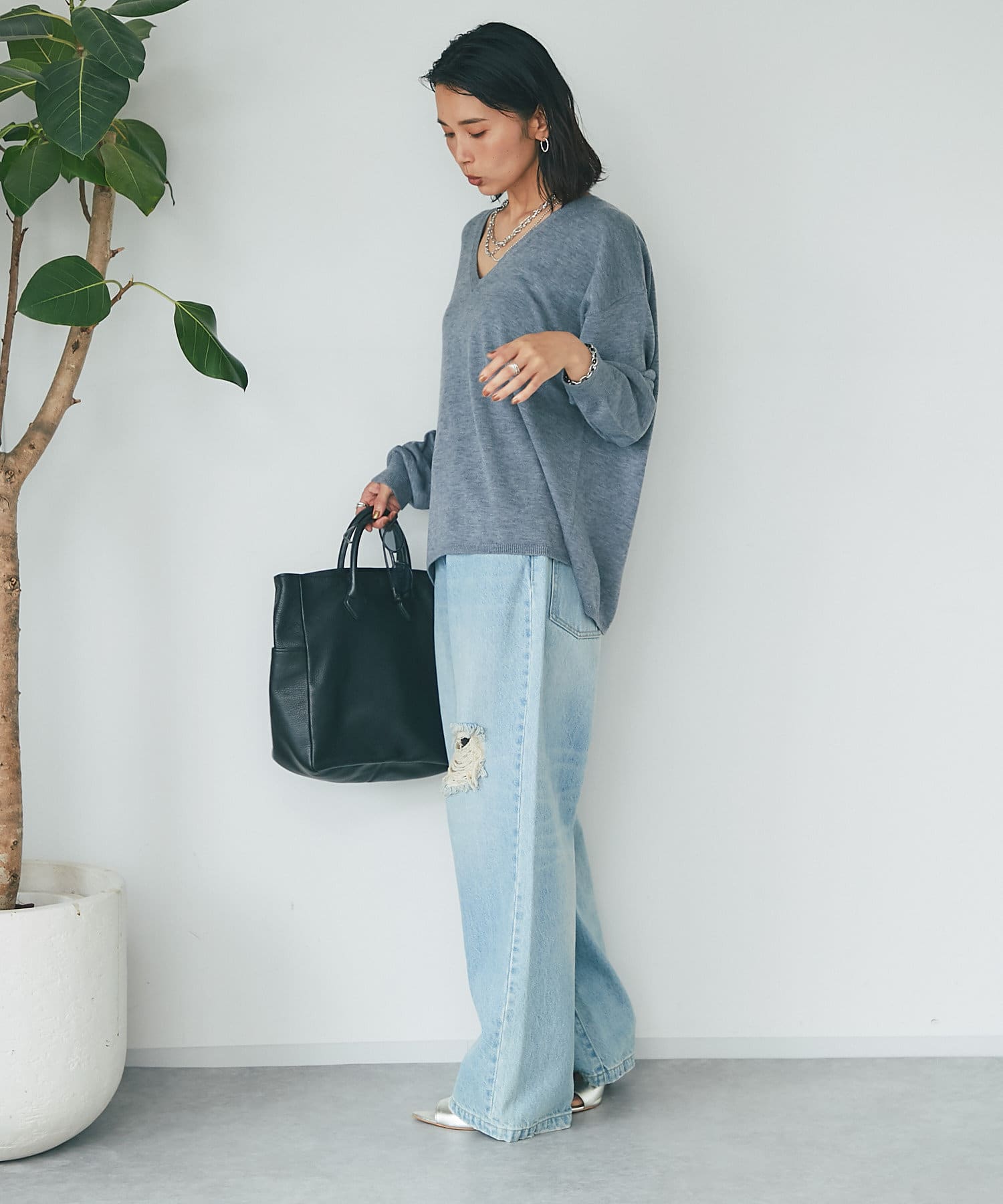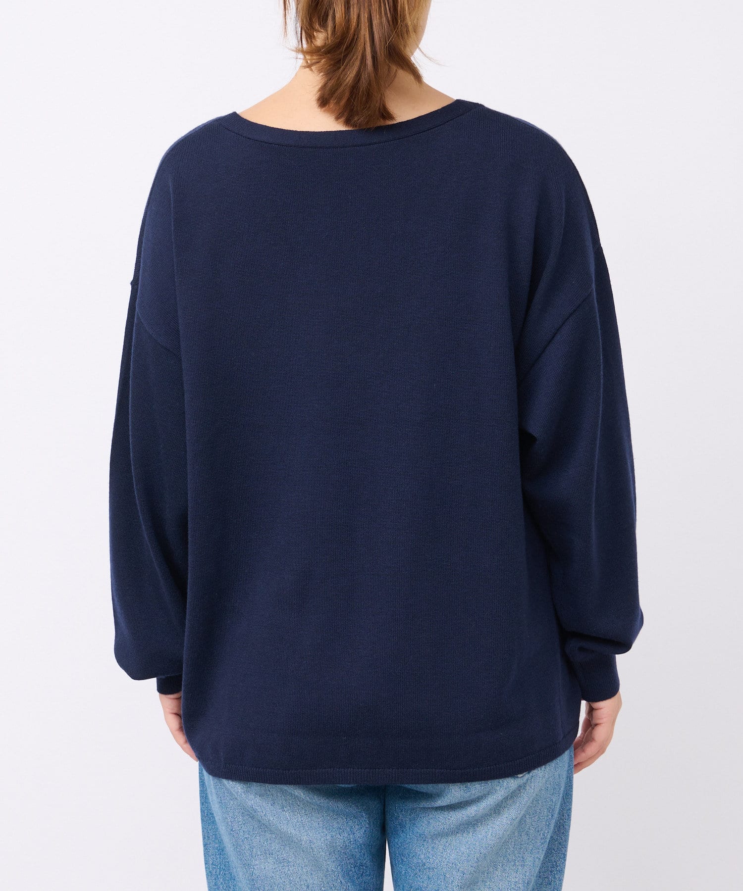 ・深めのVネックですっきりした印象
