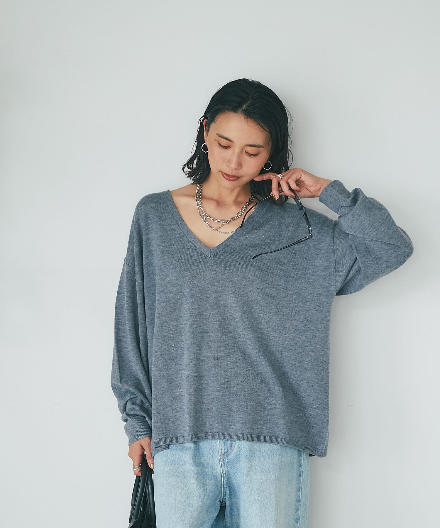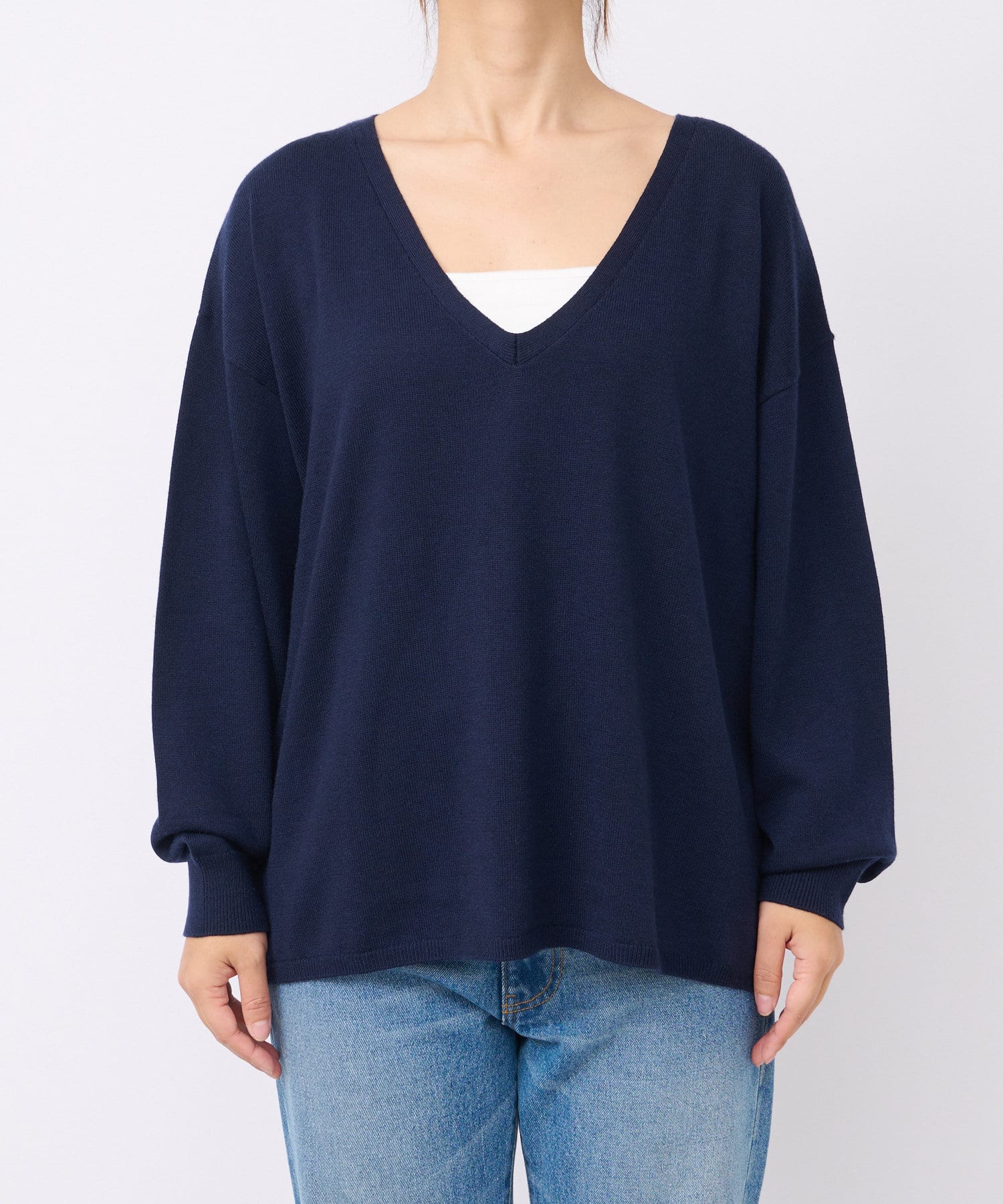 深めのVネックがポイントのシンプルなニット。