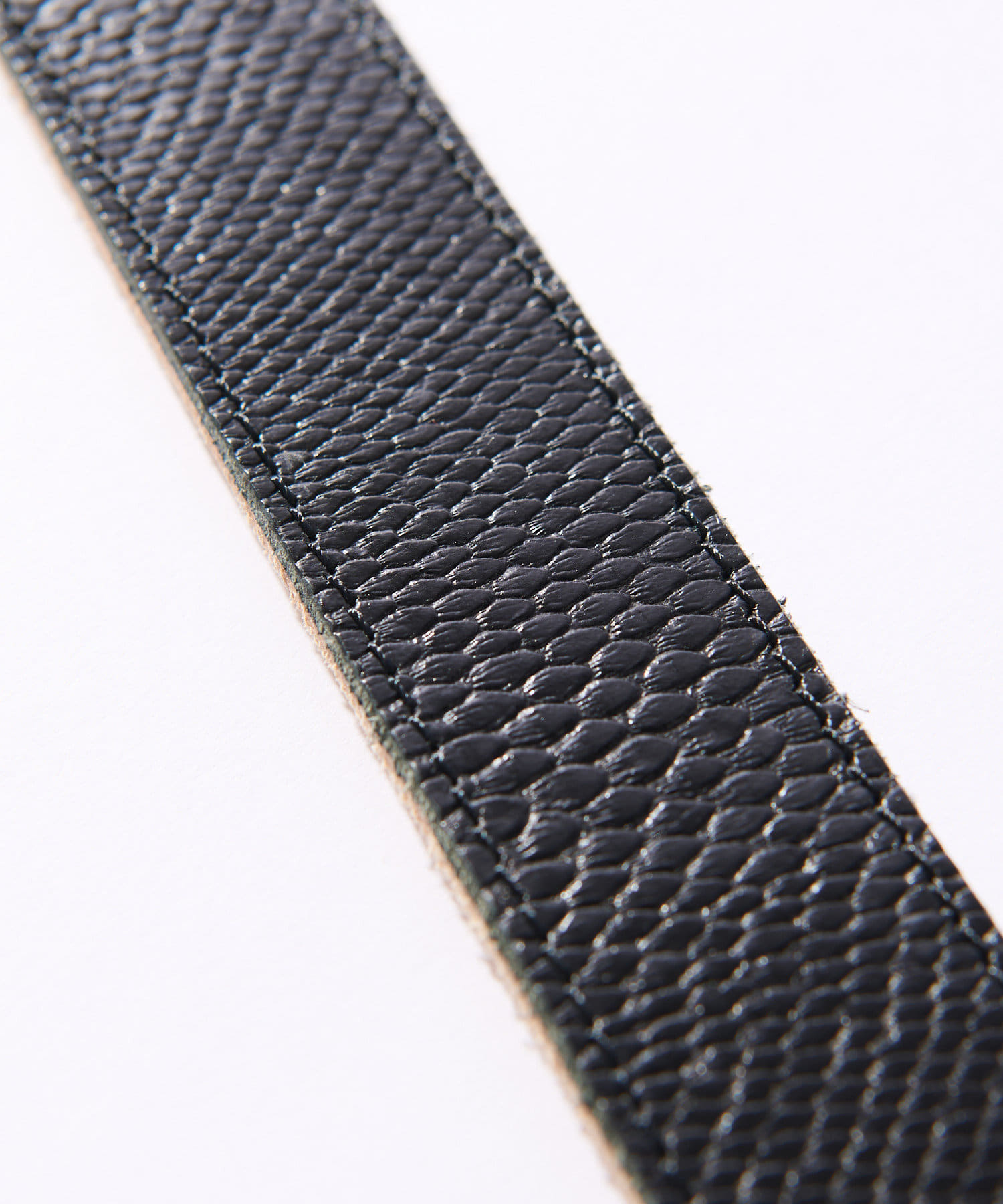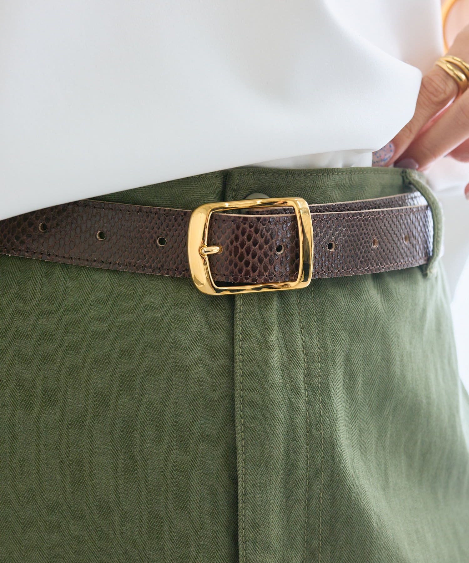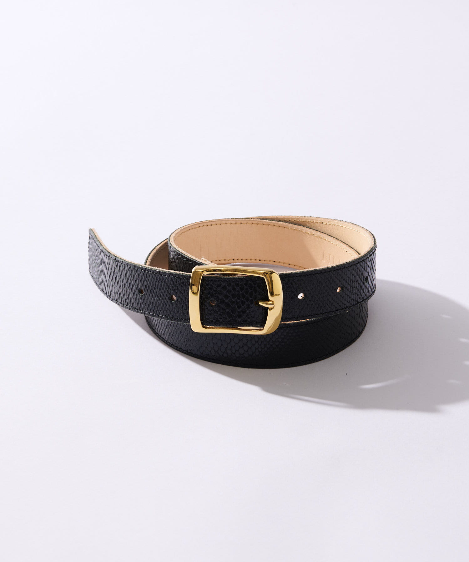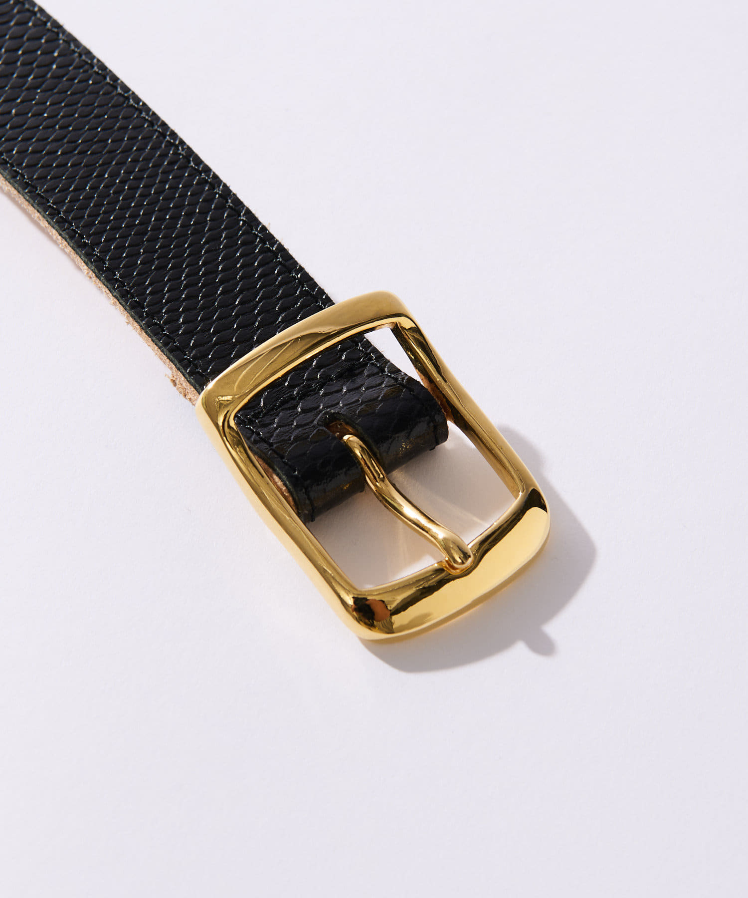 型押しレザーとゴールドバックルが目を引くデザイン。