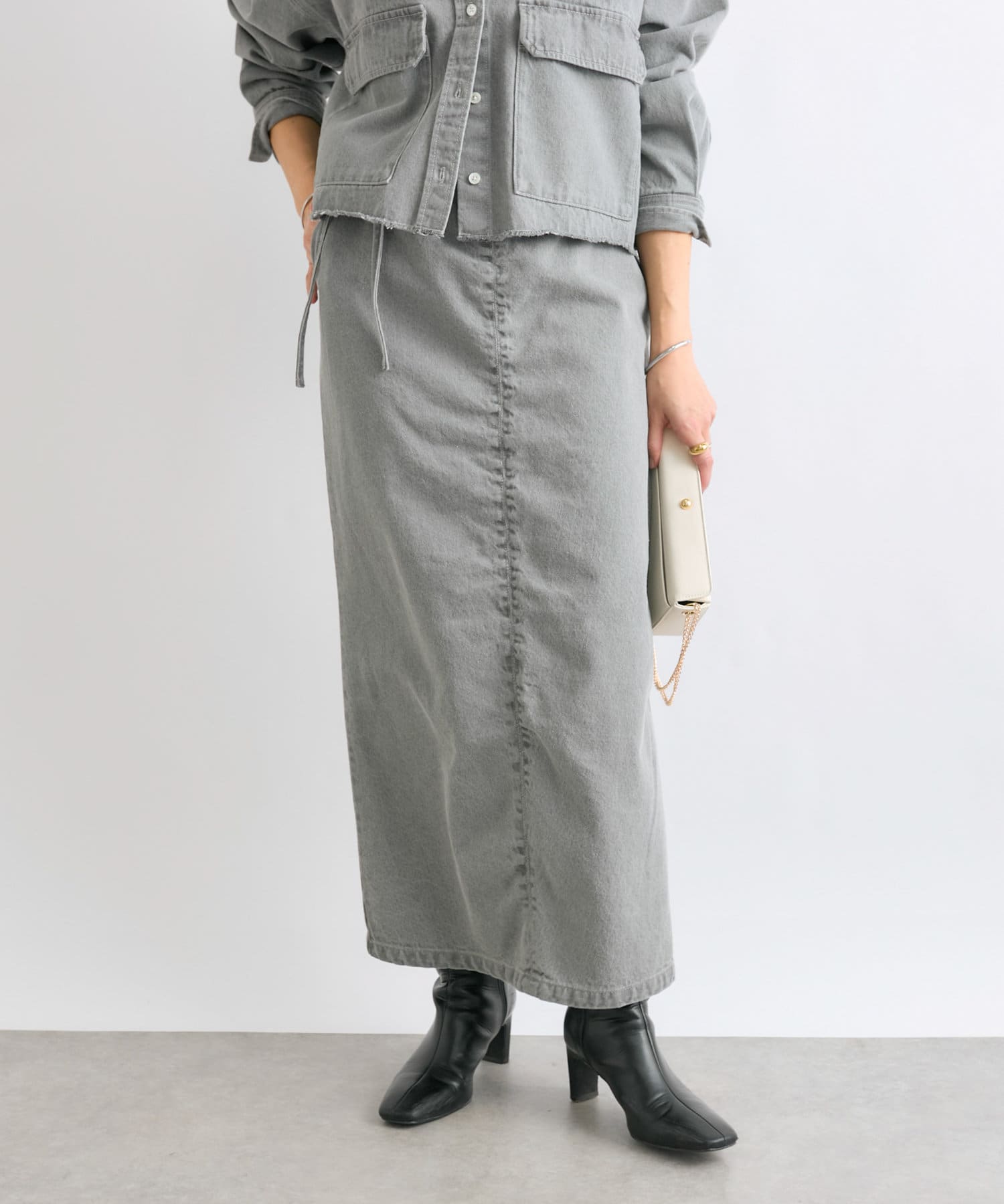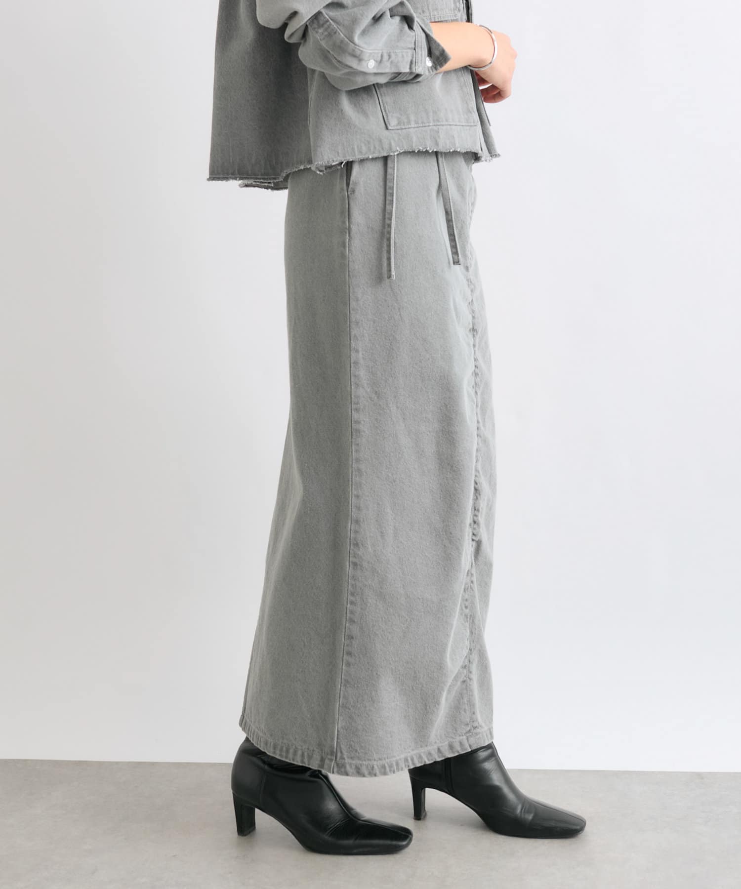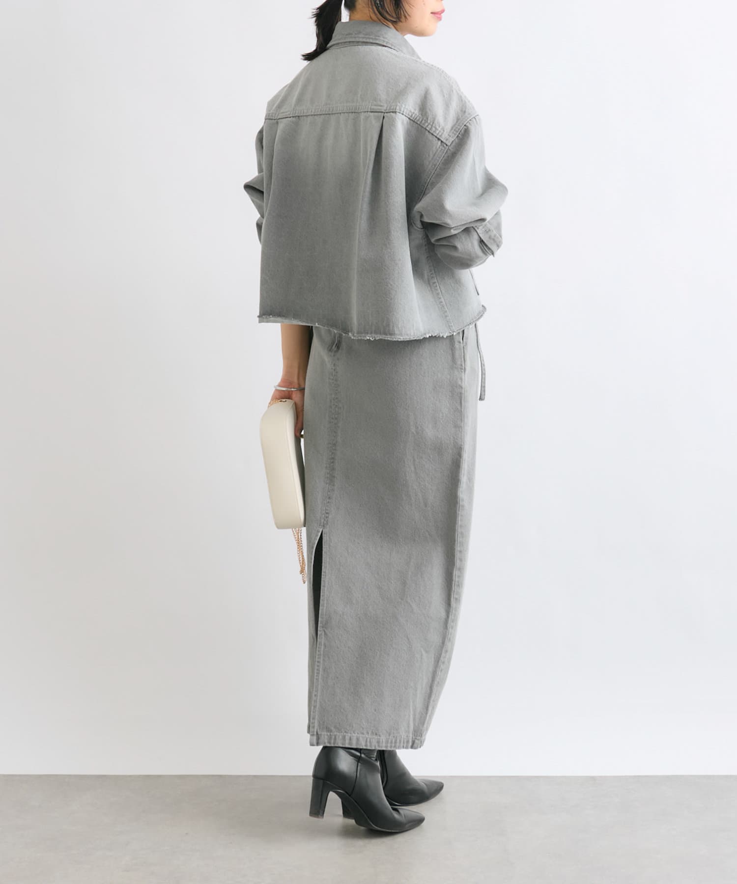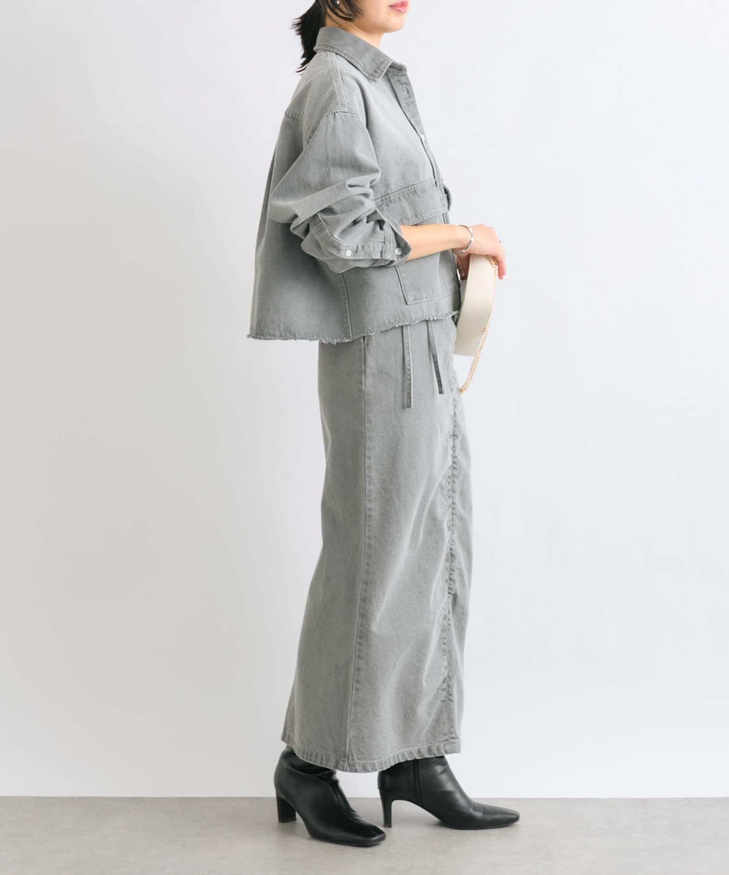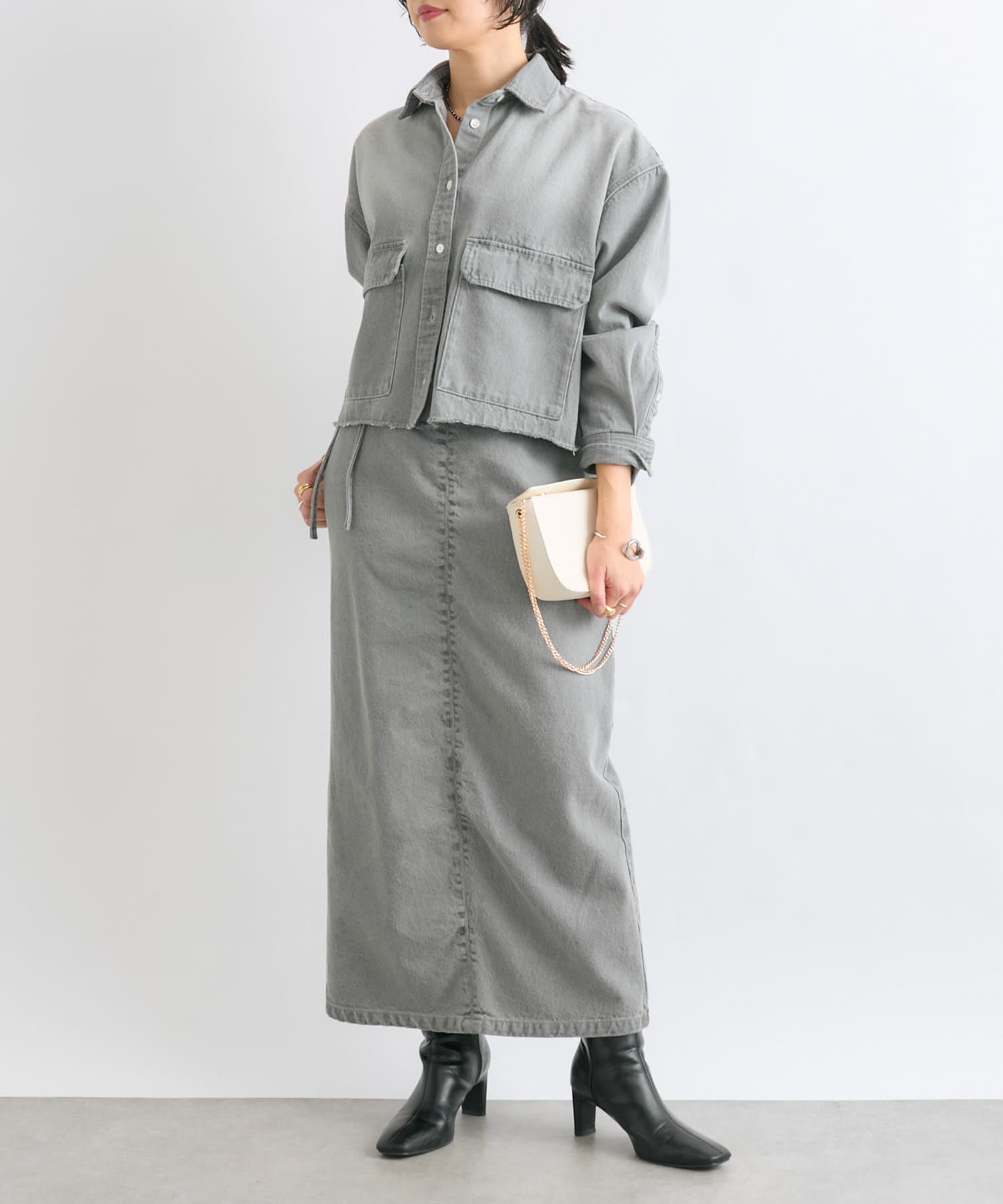 同素材のオーバーショートデニムシャツとセットアップでの着用もおすすめです。
