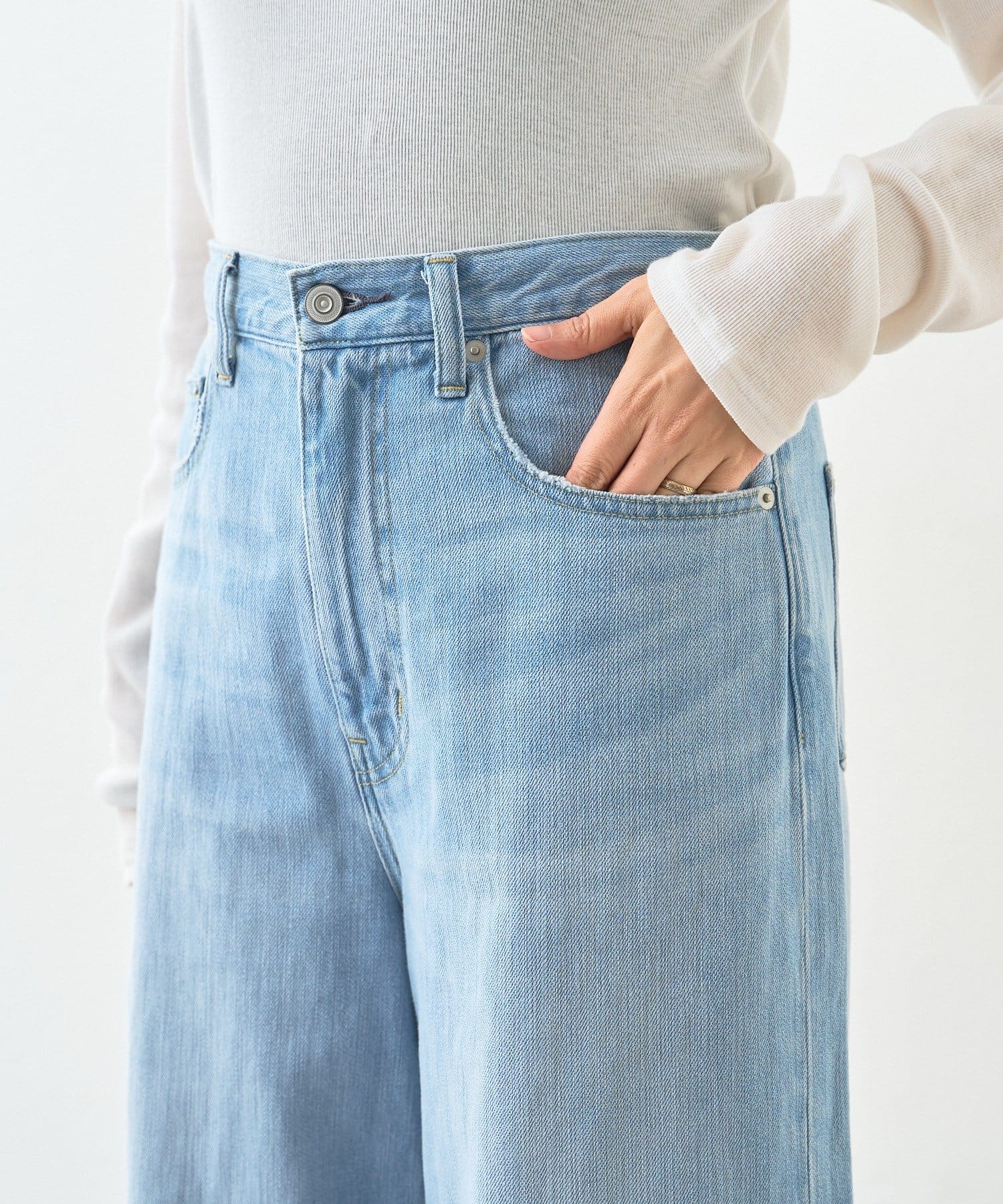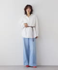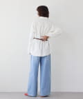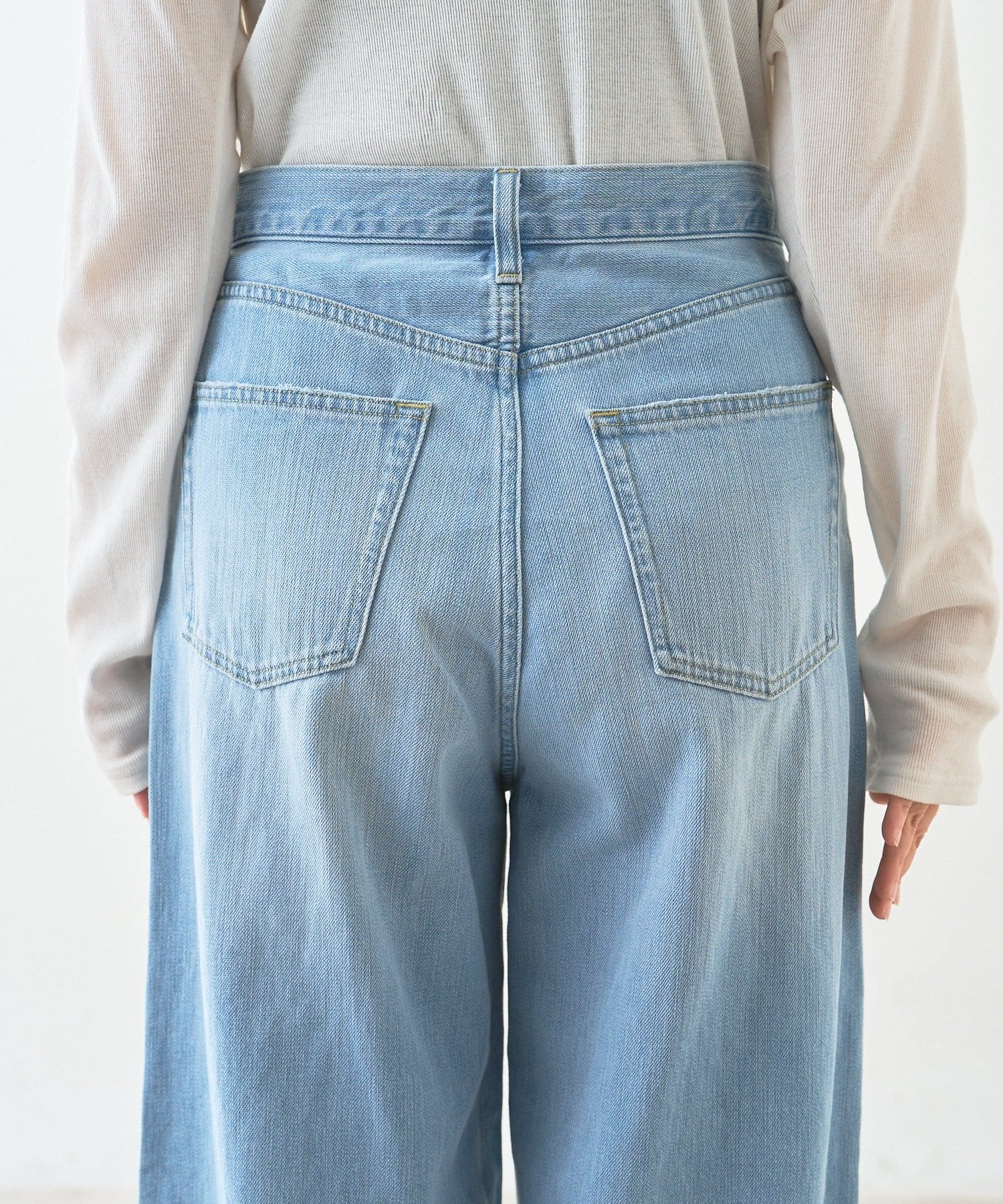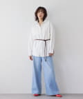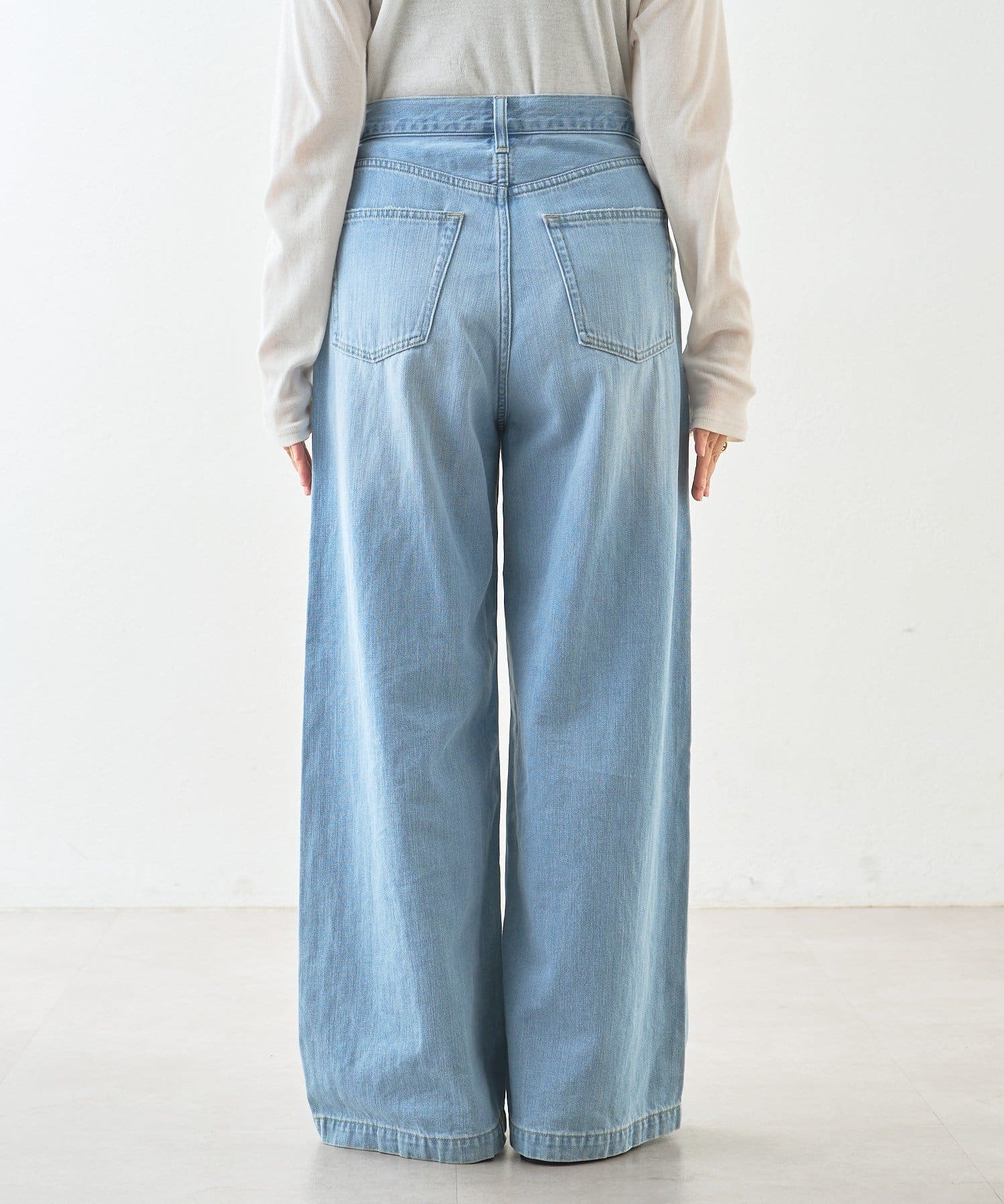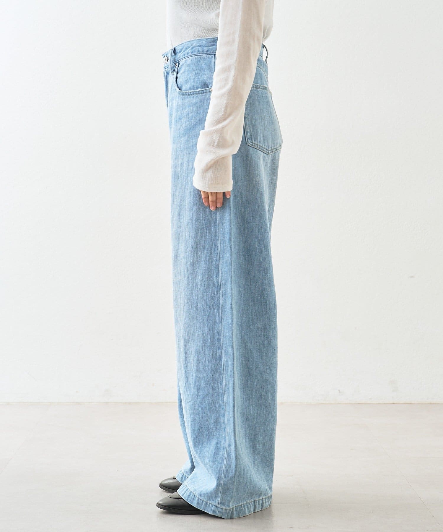・柔らかく縦に目が走っているような表面感のデニム生地ですっきりと落ち感のあるシルエット