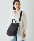 短めのハンドル、ナイロンショルダーベルト、マチ薄のデザインですっきりとしたシルエットのバッグです。