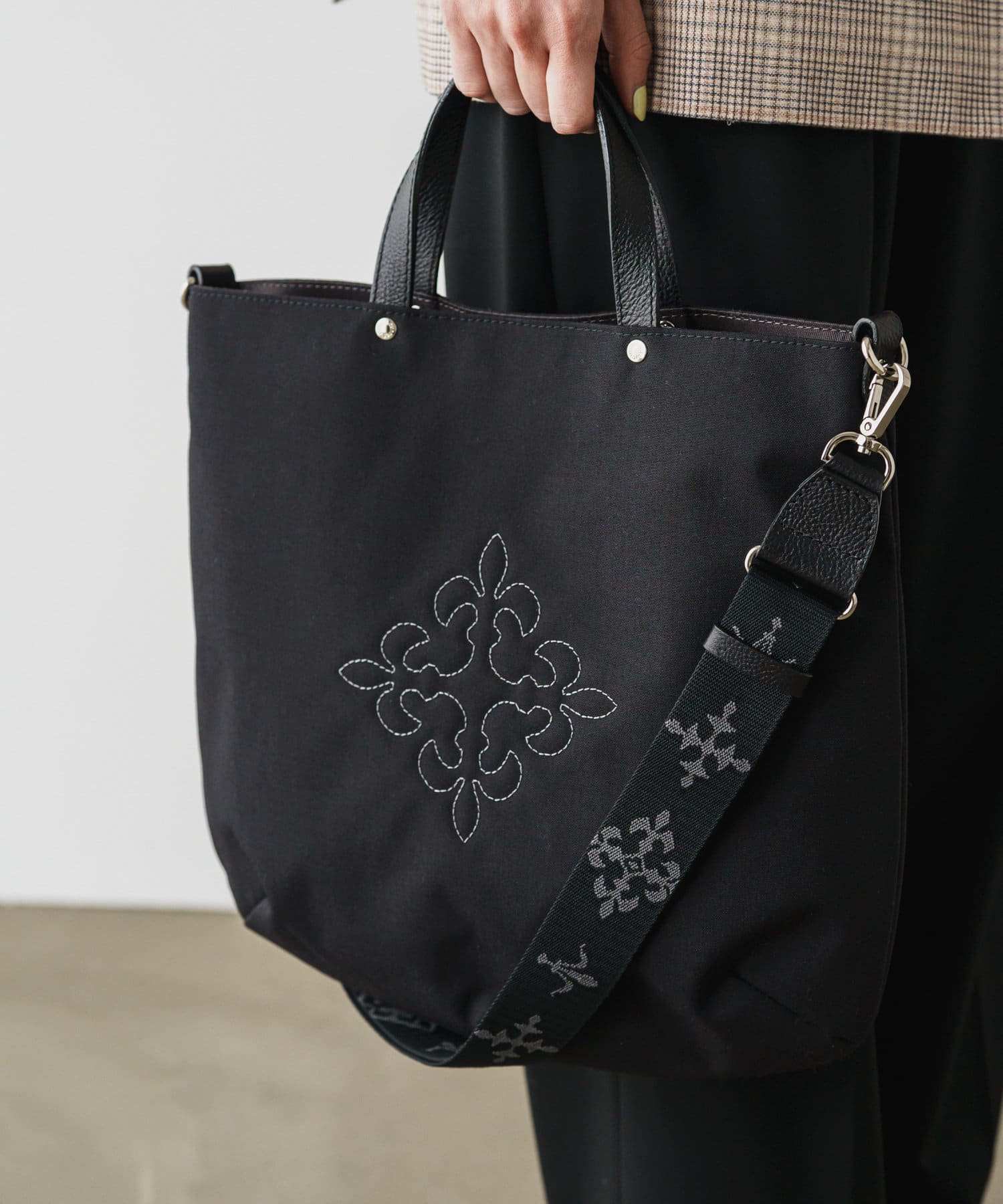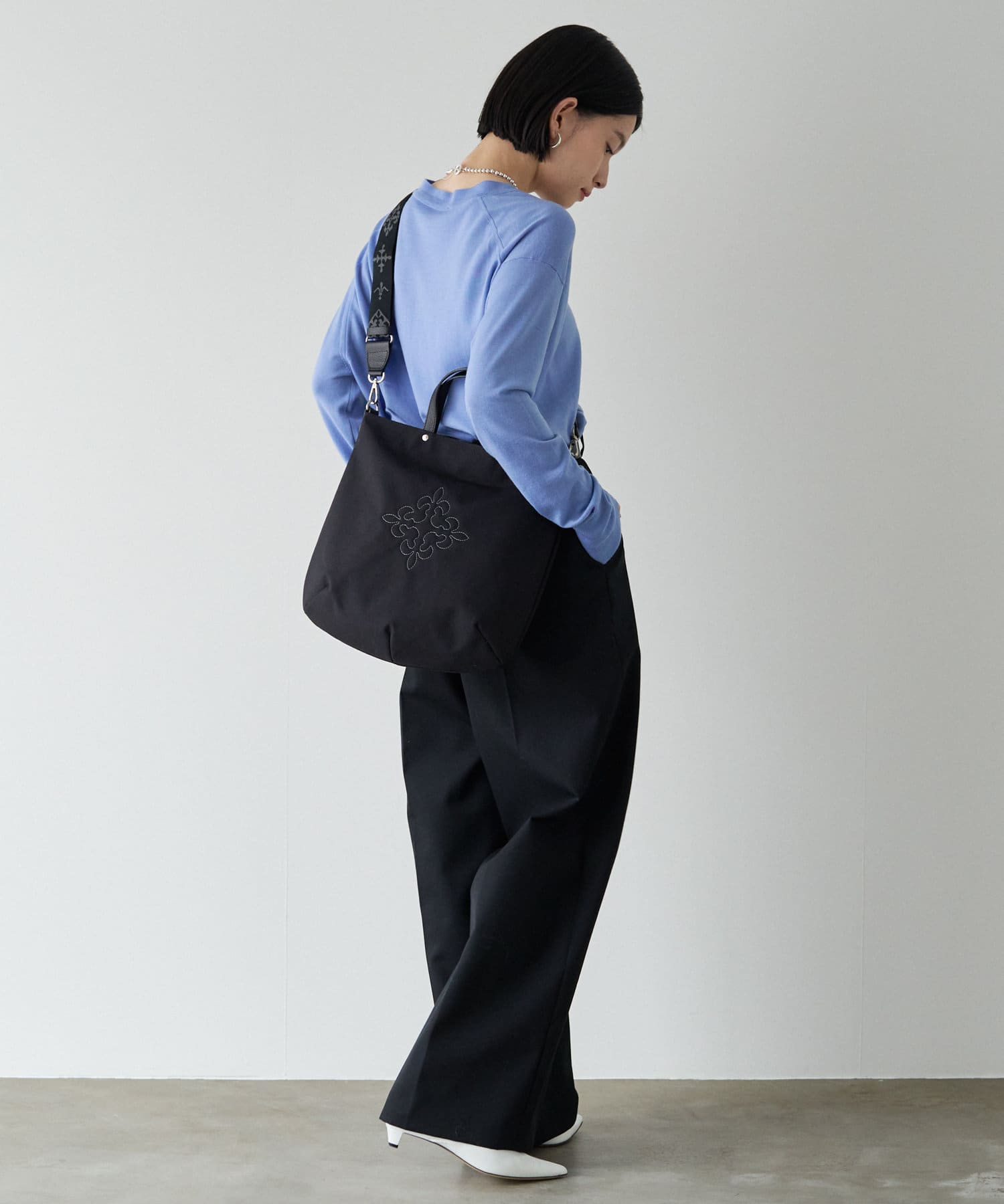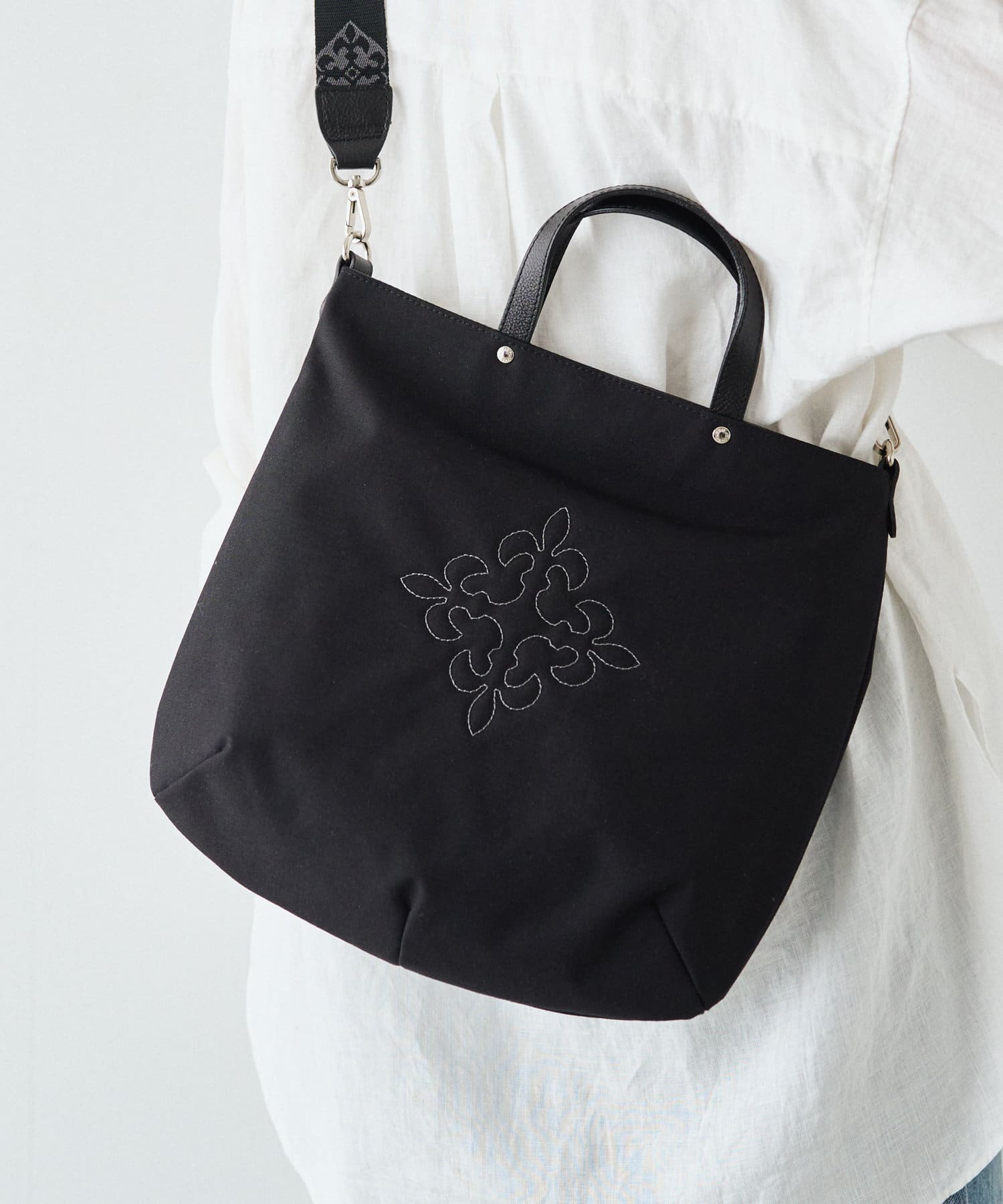 コーデを引き締める定番カラー。バッグ中央の刺繍がホワイトなので、重くなりすぎず抜け感を演出します。