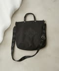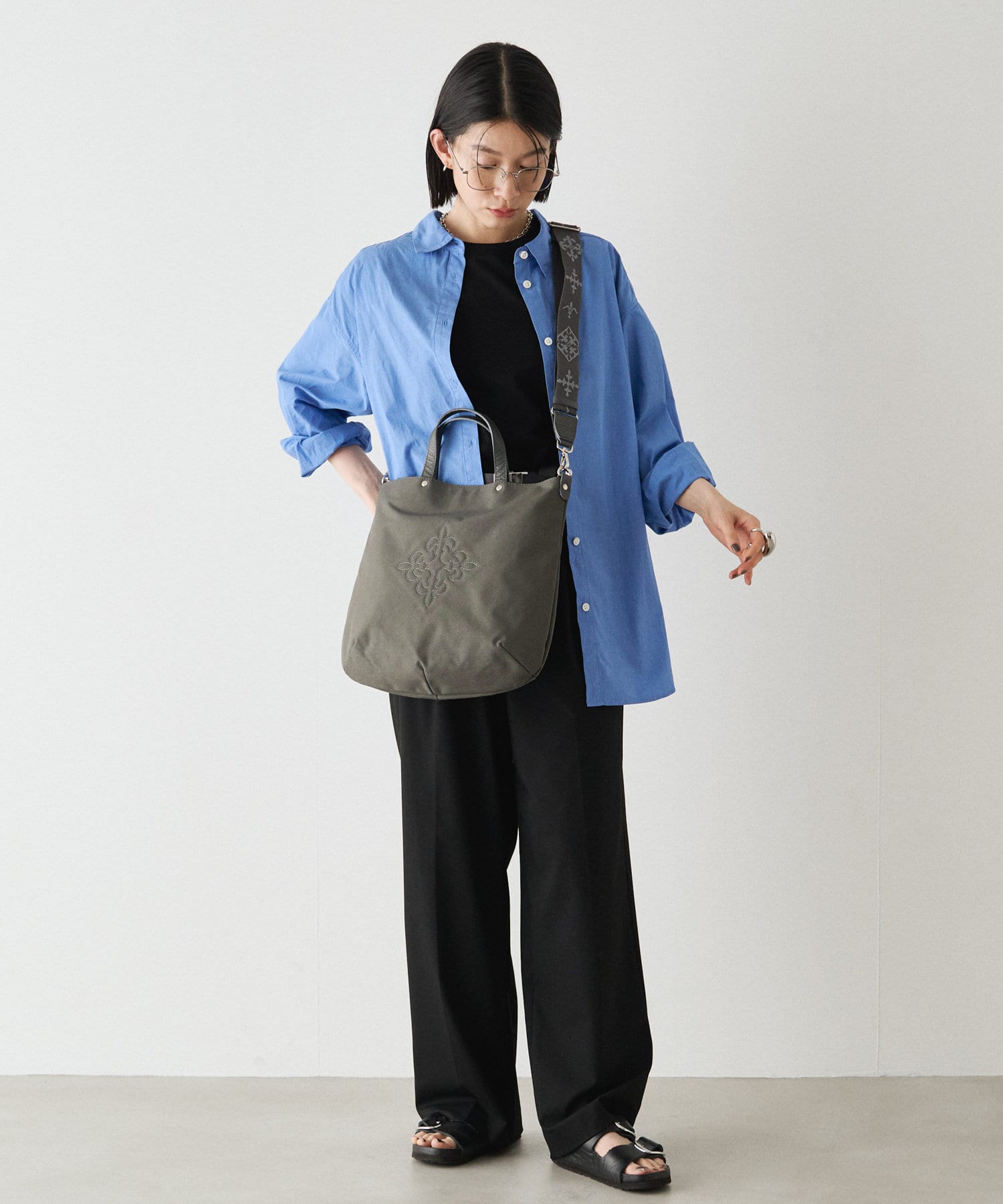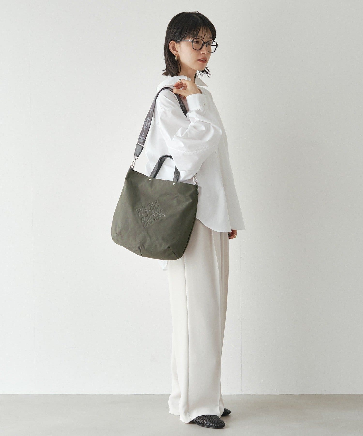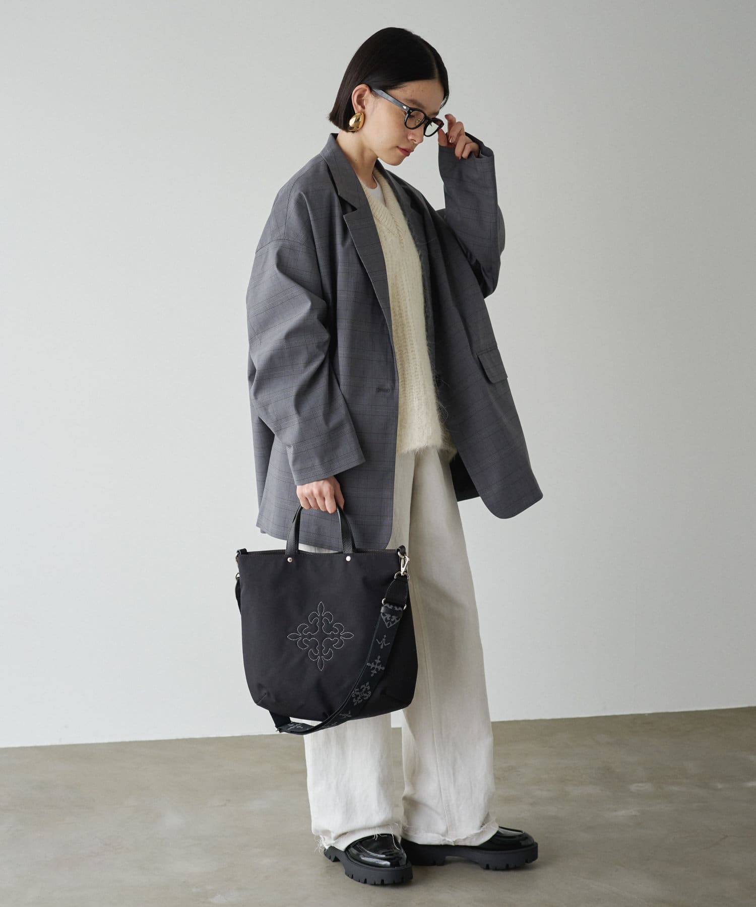 コーデを引き締める定番カラー。バッグ中央の刺繍がホワイトなので、重くなりすぎず抜け感を演出します。