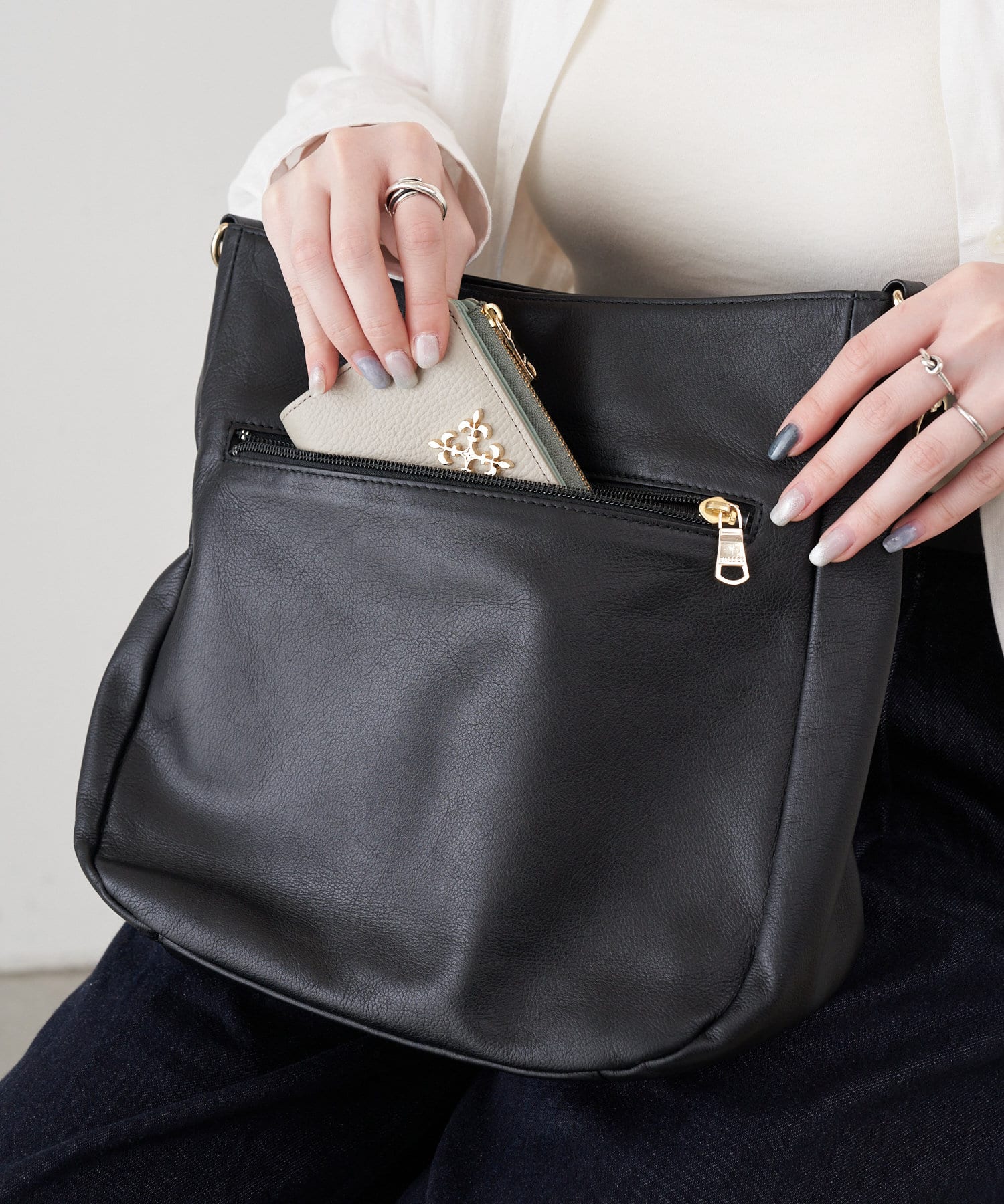 中央にはお財布など貴重品をしっかり収納できるファスナーポケットを配置し安全面にも気を配りました。