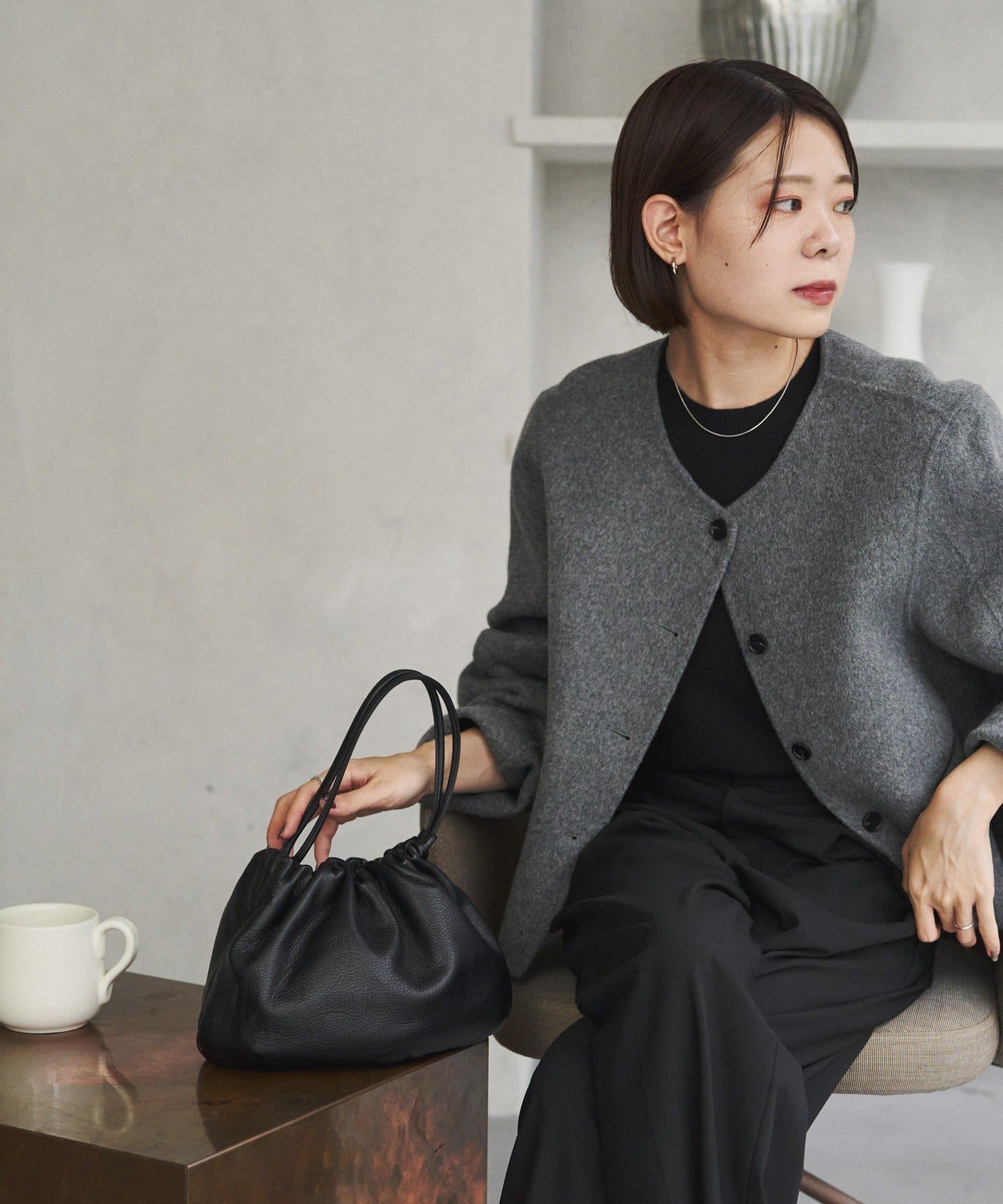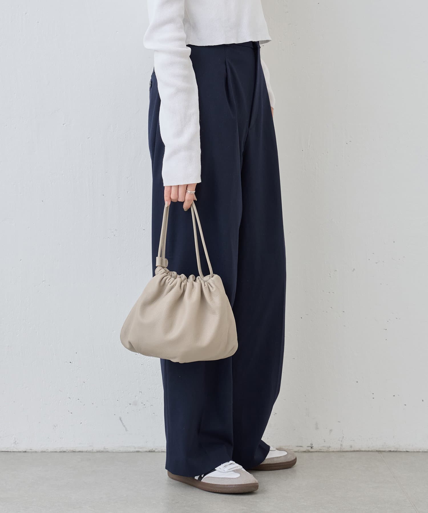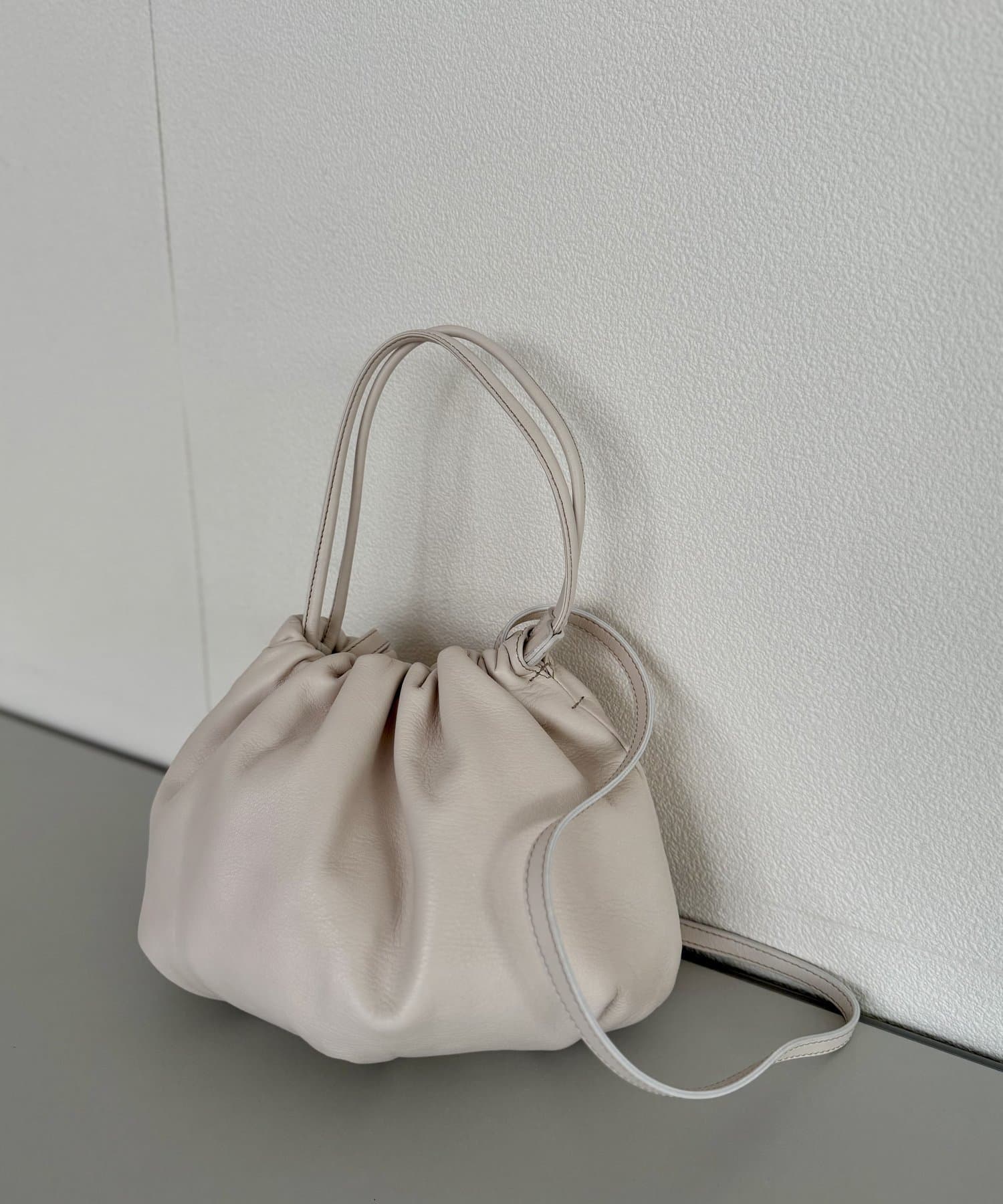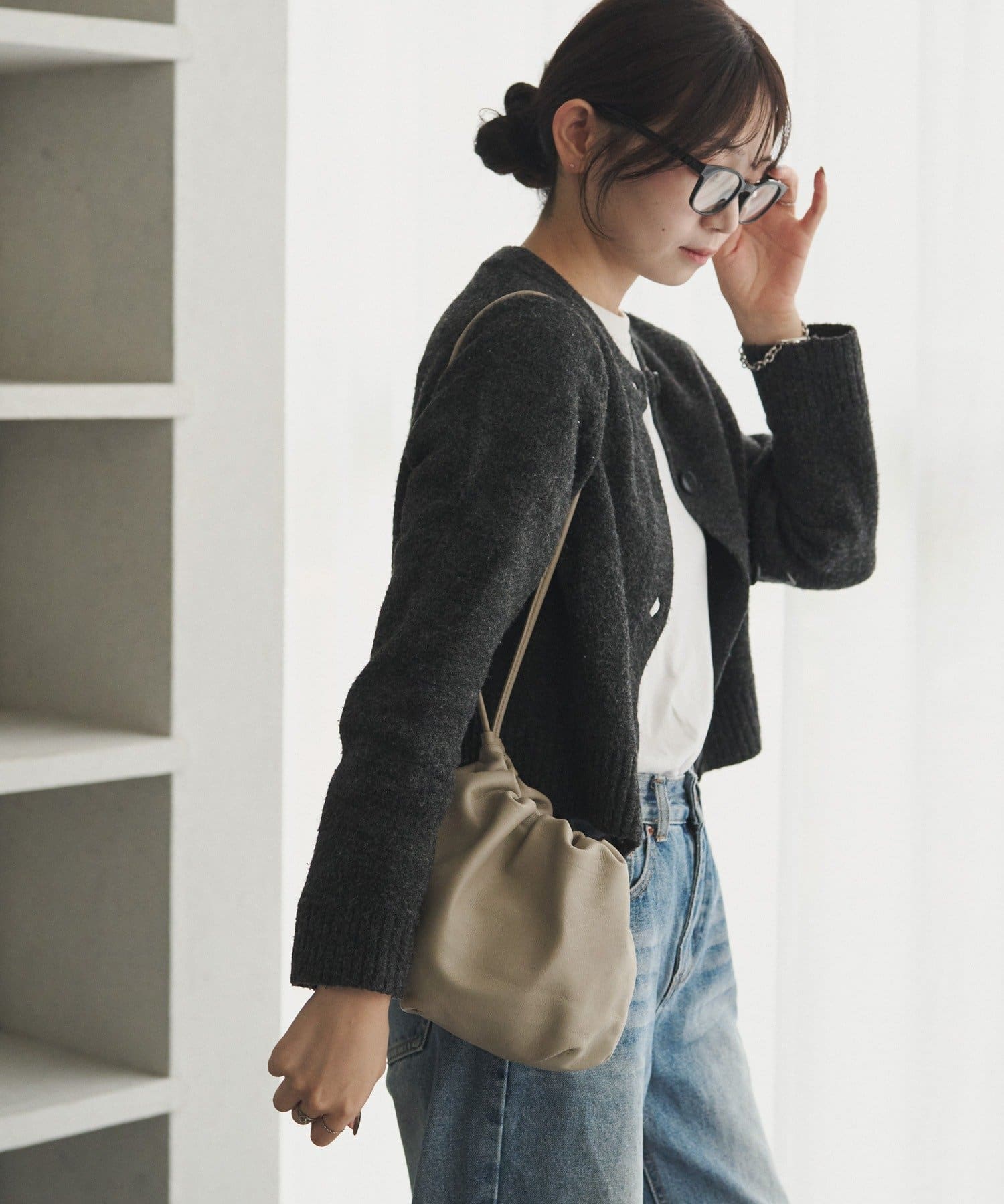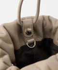 購入場所:パルクローゼット最初ブラックを予約したのですが、インスタライブなどをみているうちにグレージュにも惹かれ色違いで購入しました。グレージュ、巾着を絞ってくしゃっとさせるととてもかわいいです、思い切って色違い購入してよかったです!使っていくうちに柔らかくなって馴染んでいくのが楽しみです。