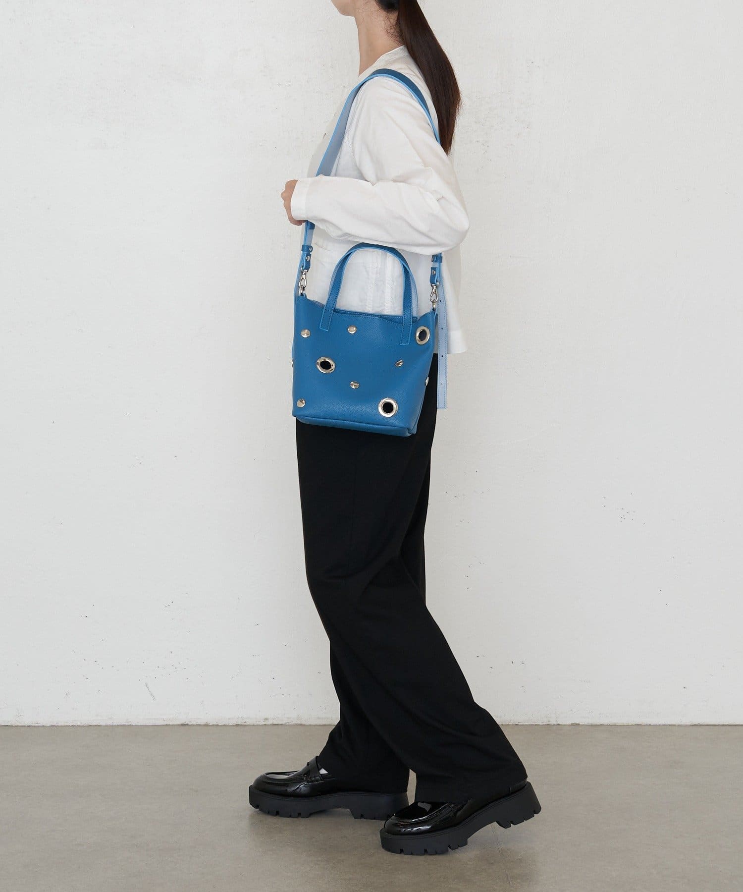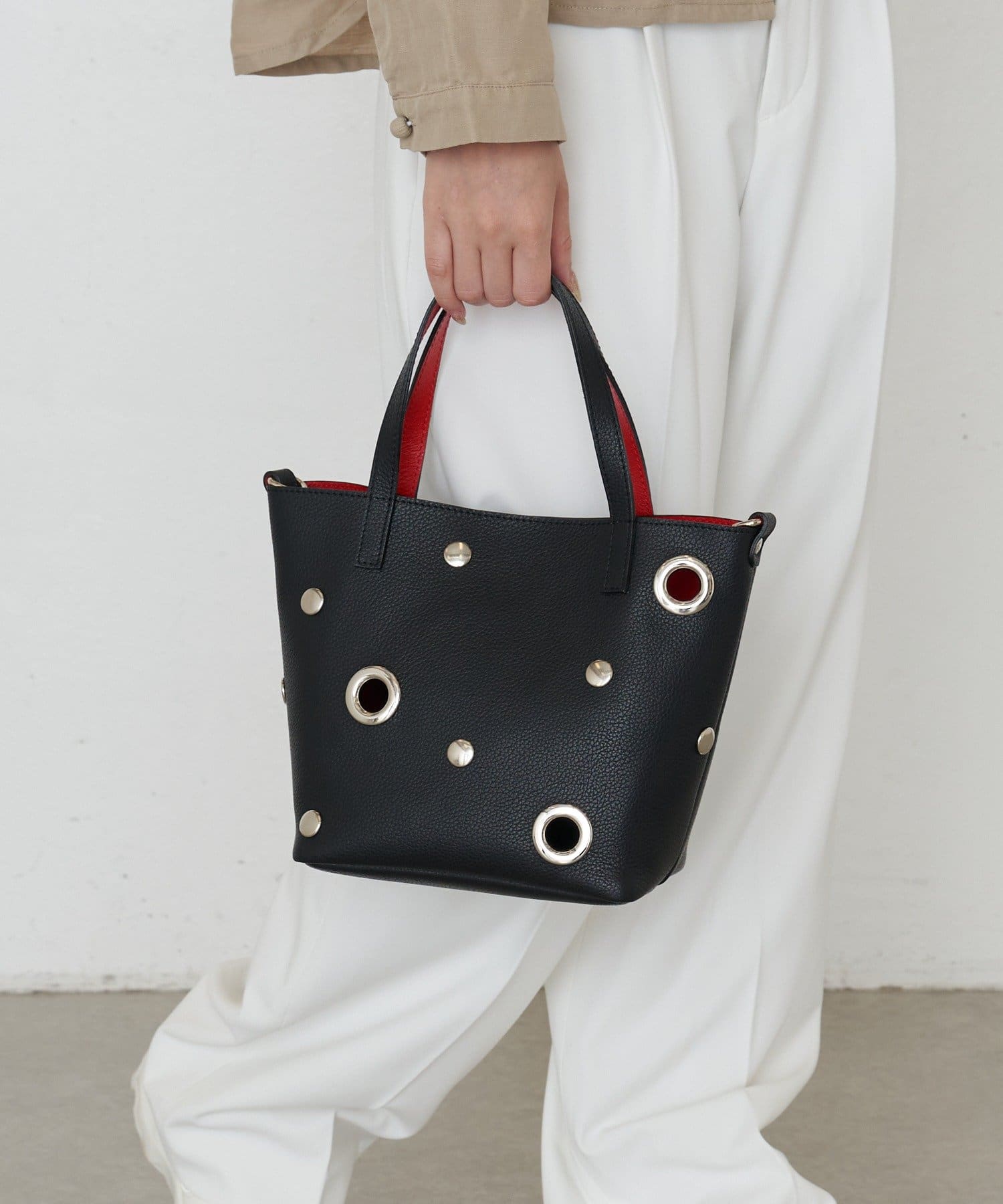 ・メタルホールを散りばめたデザインで、モード感と遊び心を両立