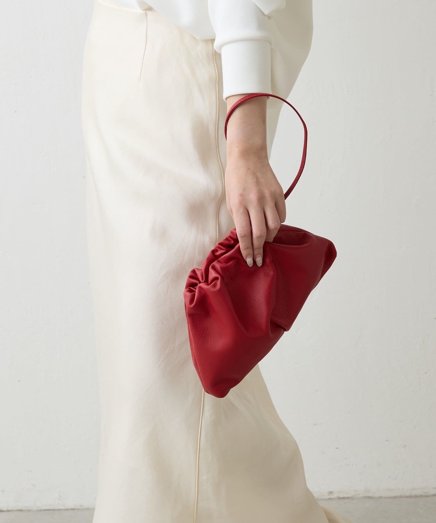 くったりとしたレザーの風合いと、巾着ならではの柔らかなフォルムが特徴。