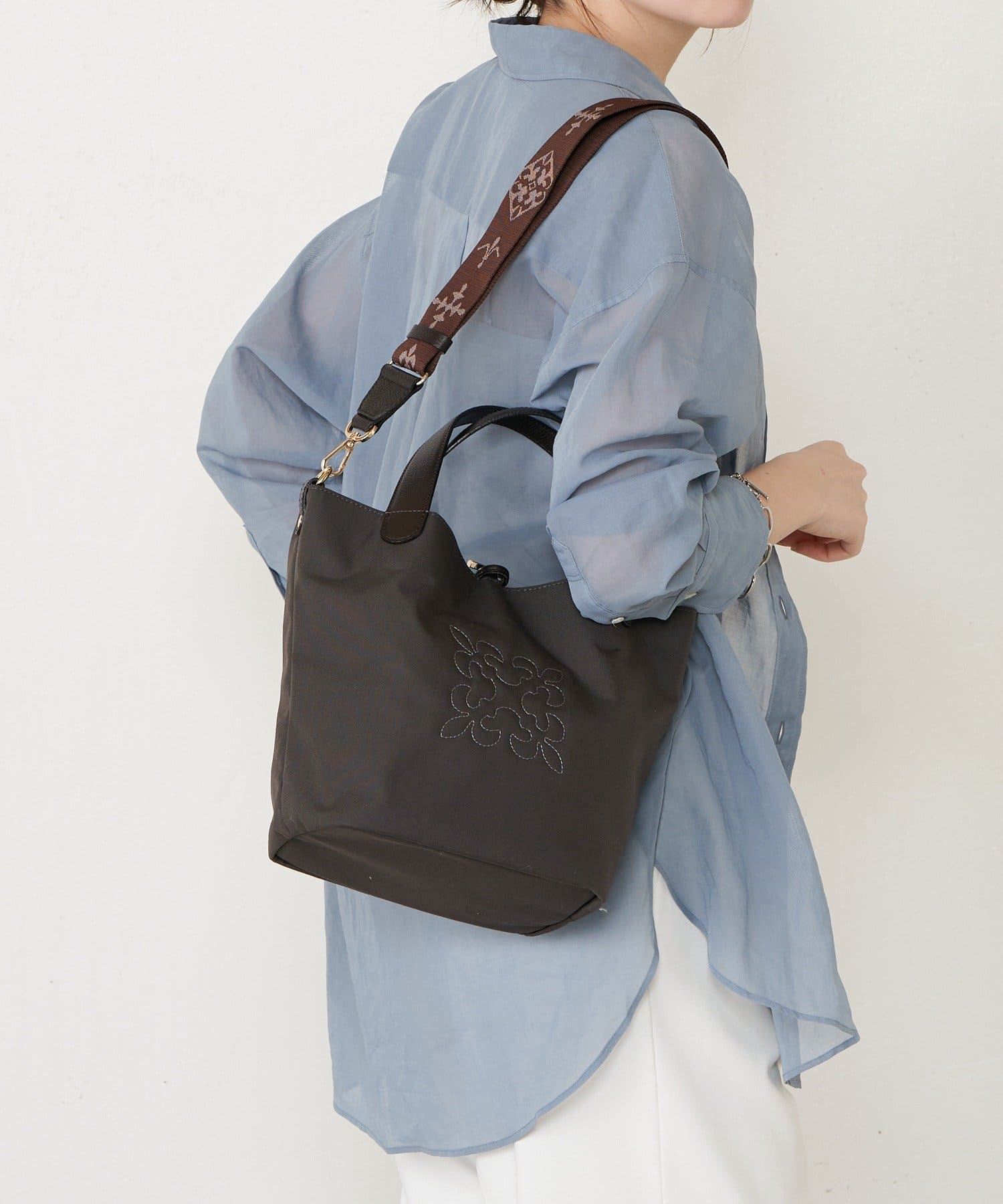 ショルダーベルトを付けてカジュアルに、ハンドル持ちで上品にと、
