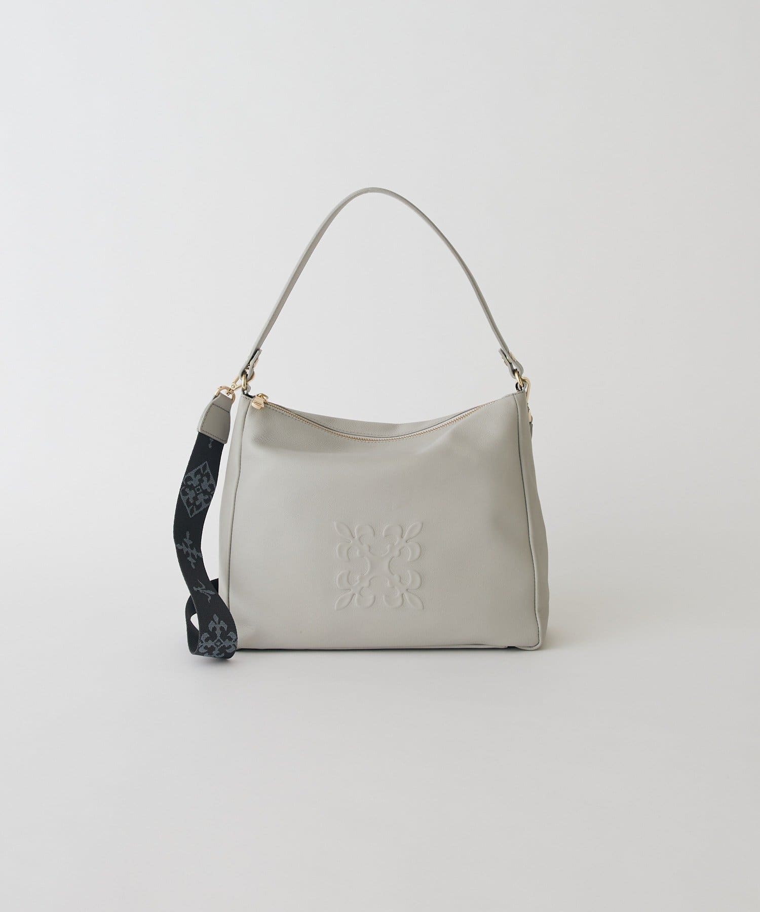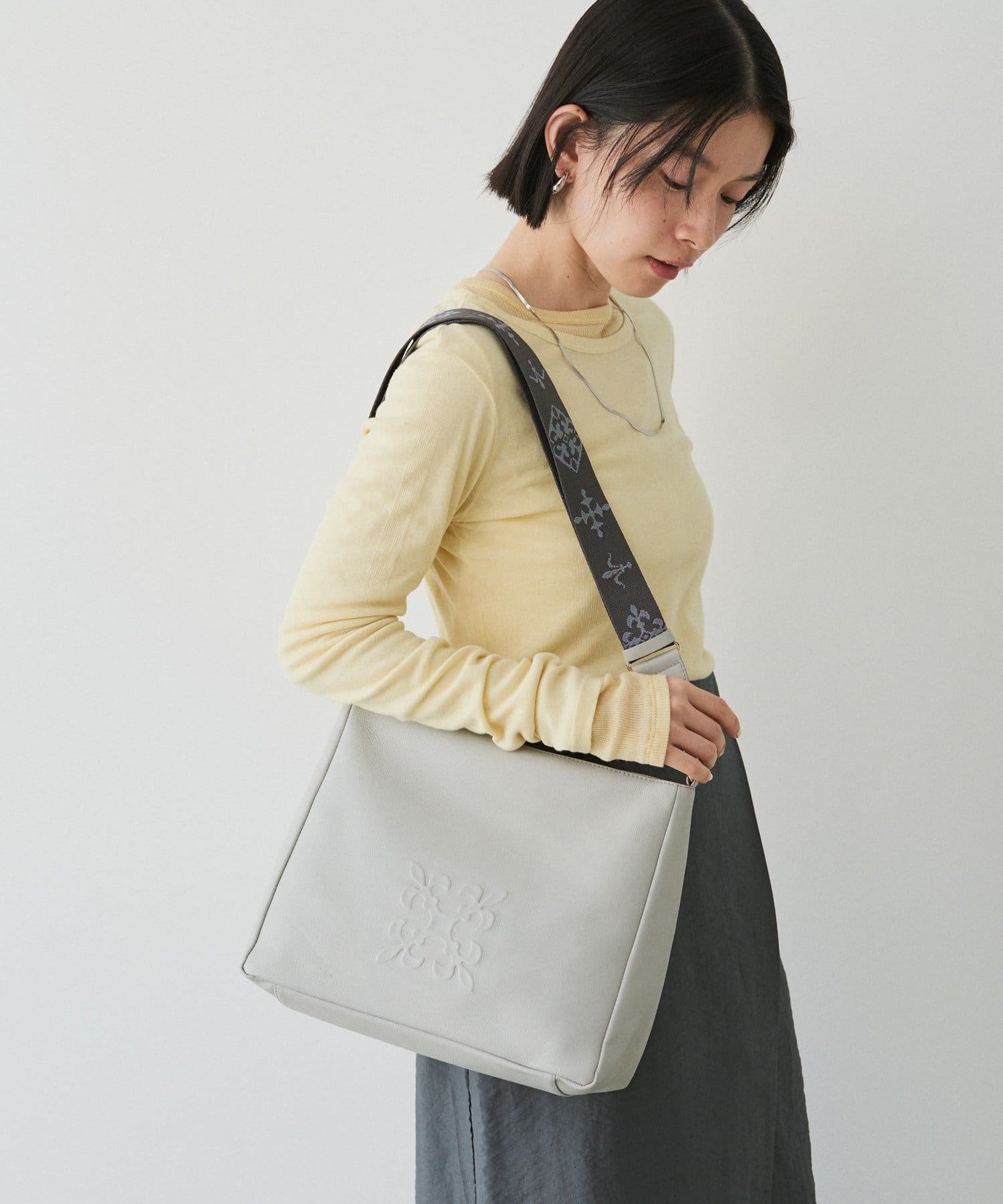 立体的なエンボスモノグラムが、シンプルコーデにさりげない華やかさを添えてくれる一品です。