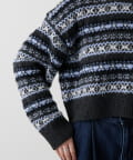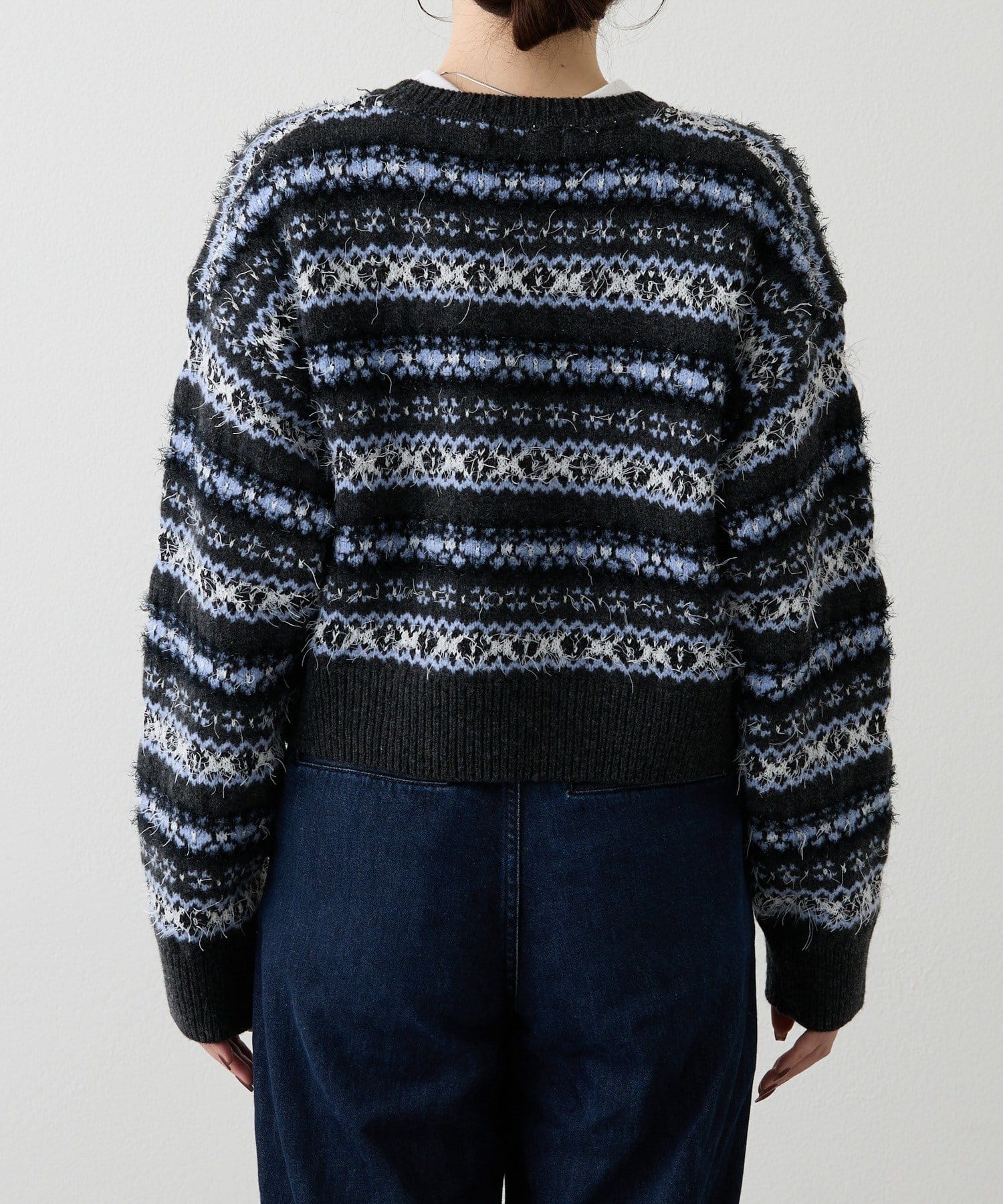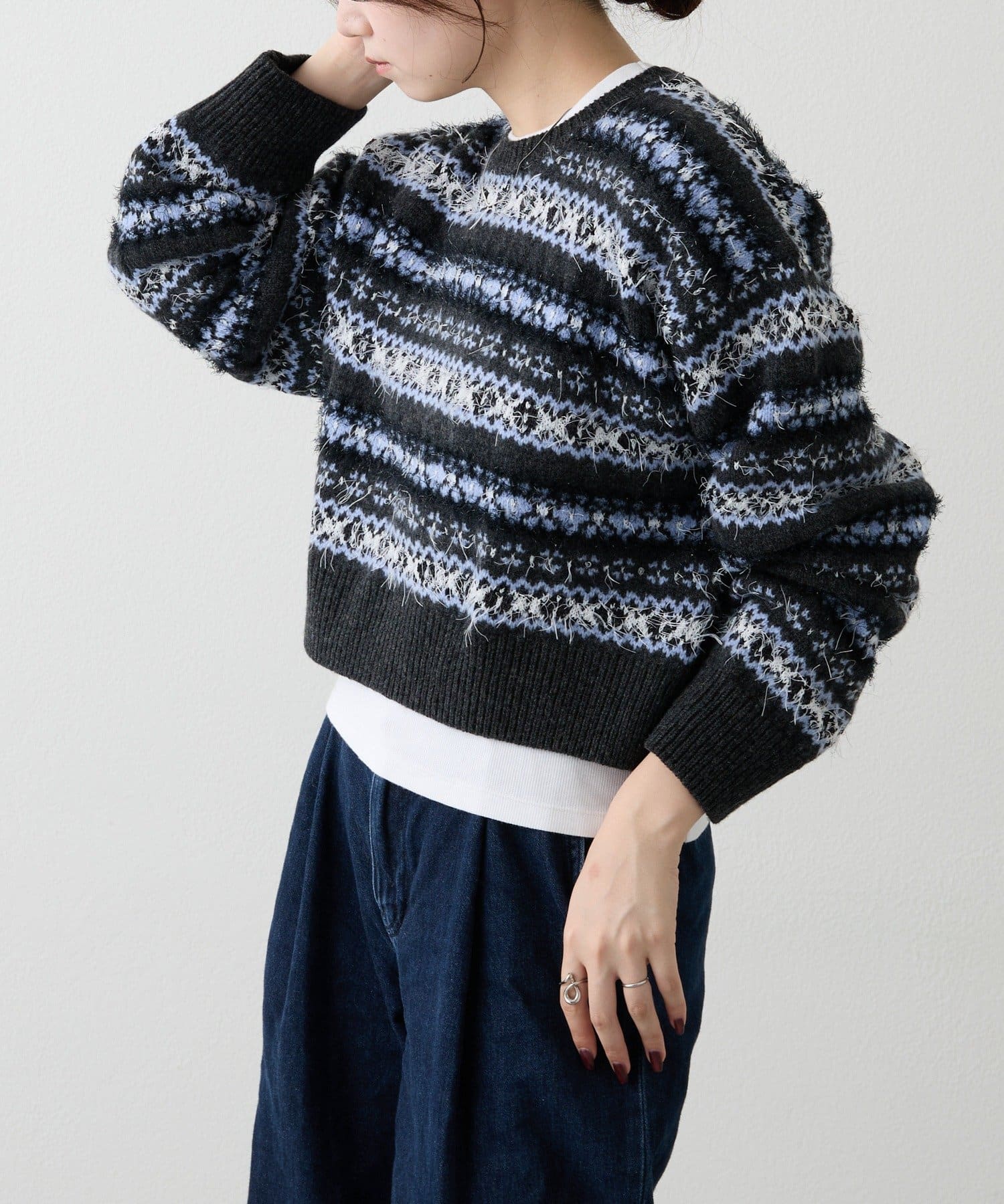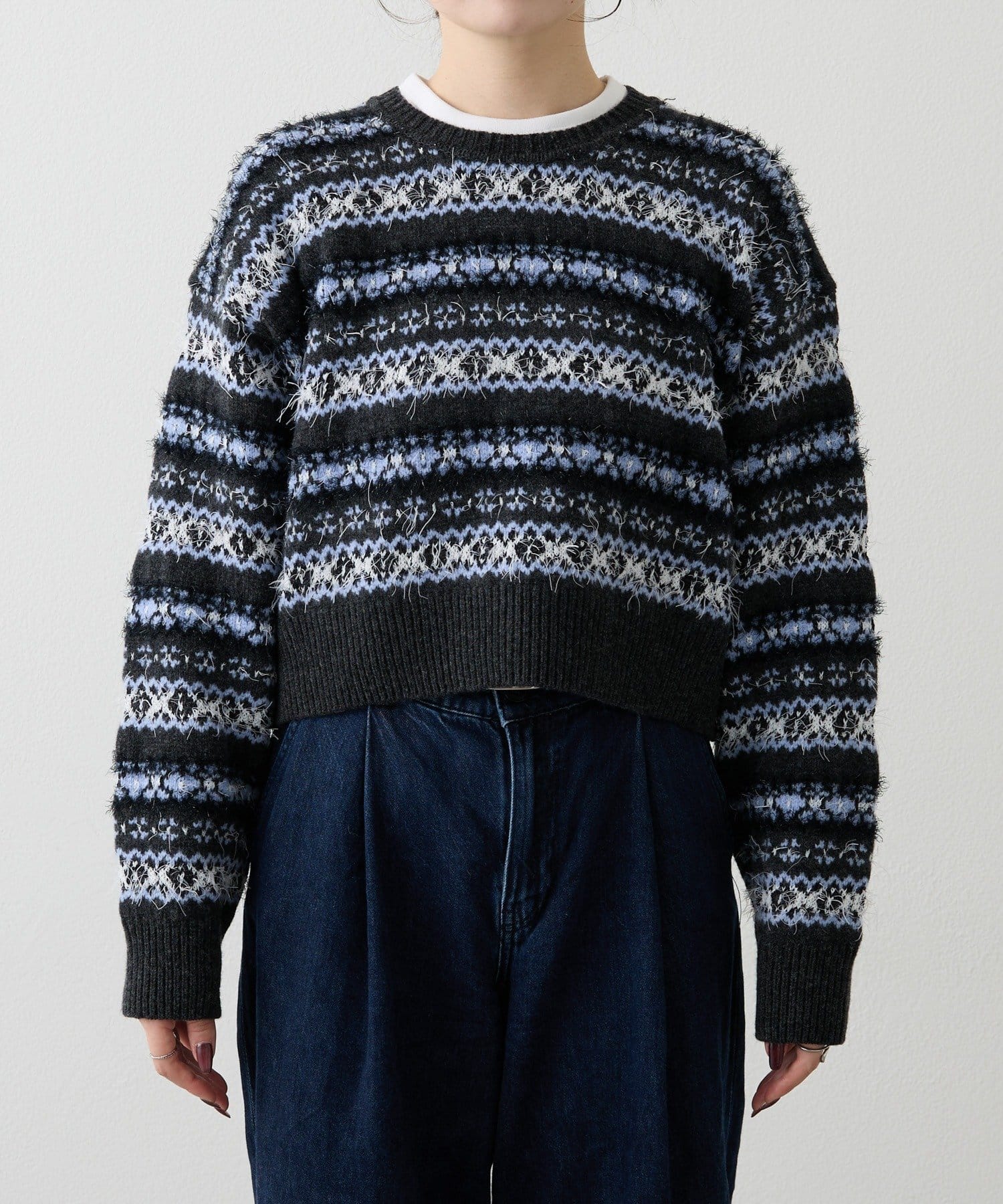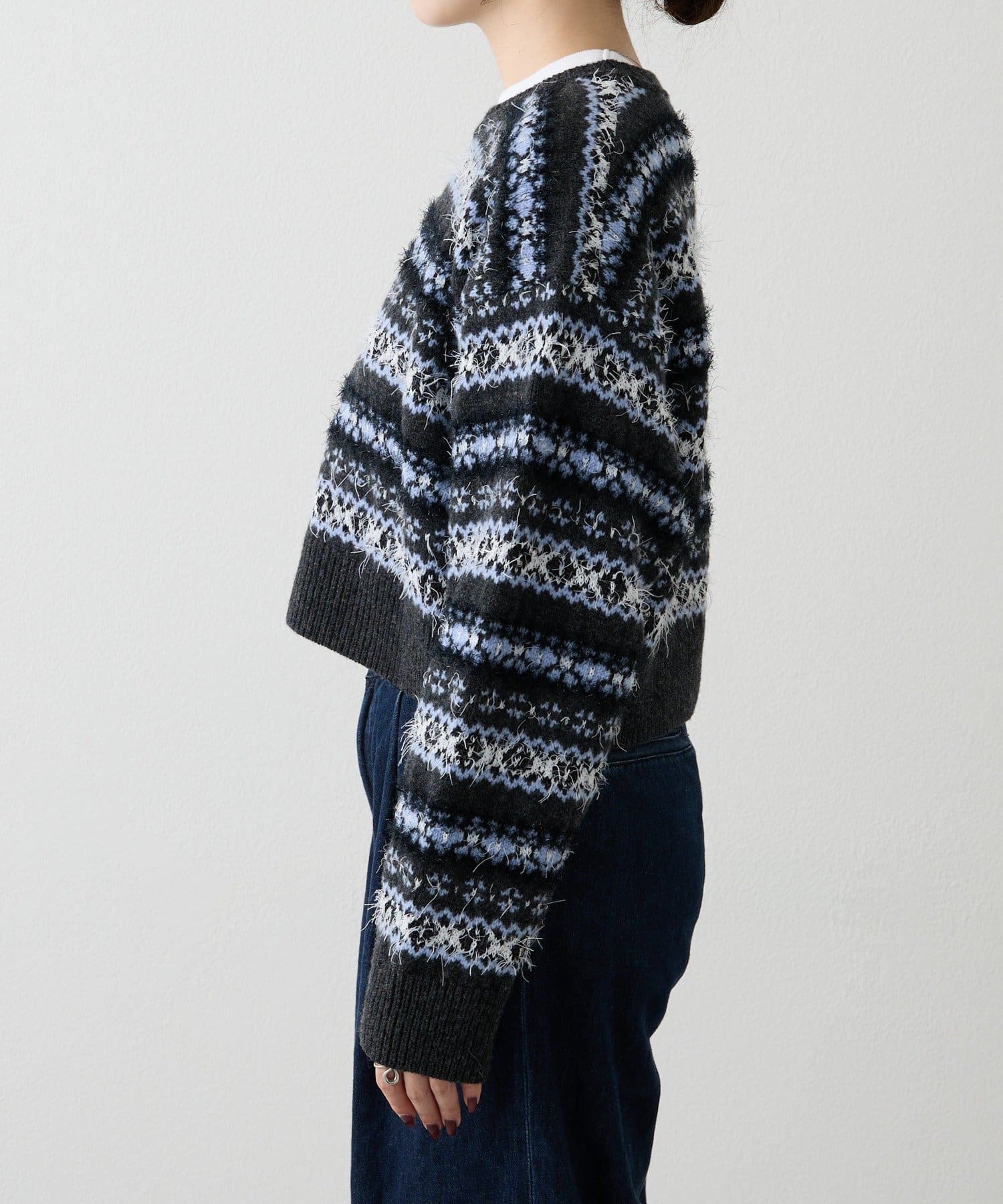 メリノウールをベースに、フェザーヤーンや和紙ヤーンなど異素材を組み合わせて編み上げたフェアアイル柄のクロップドニット。
