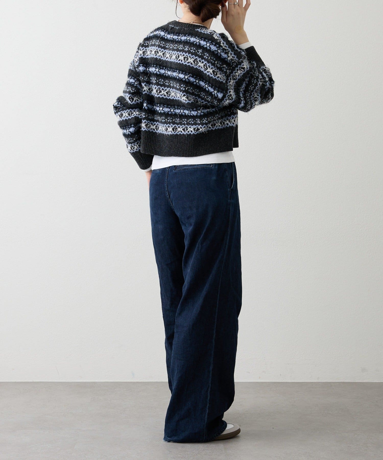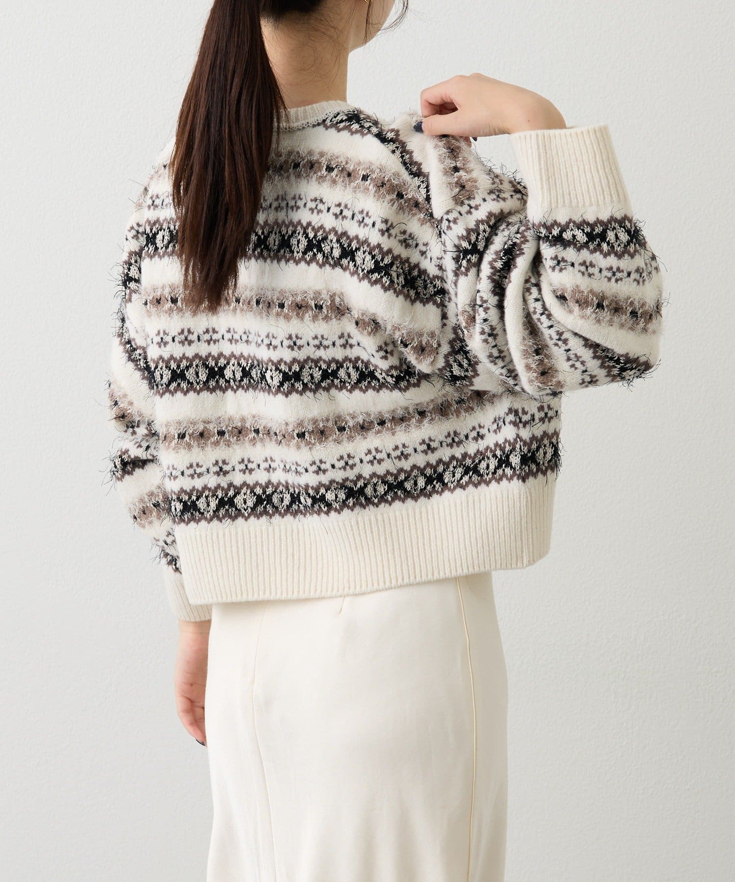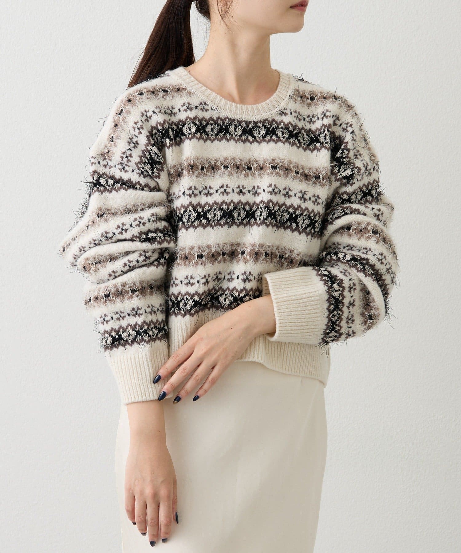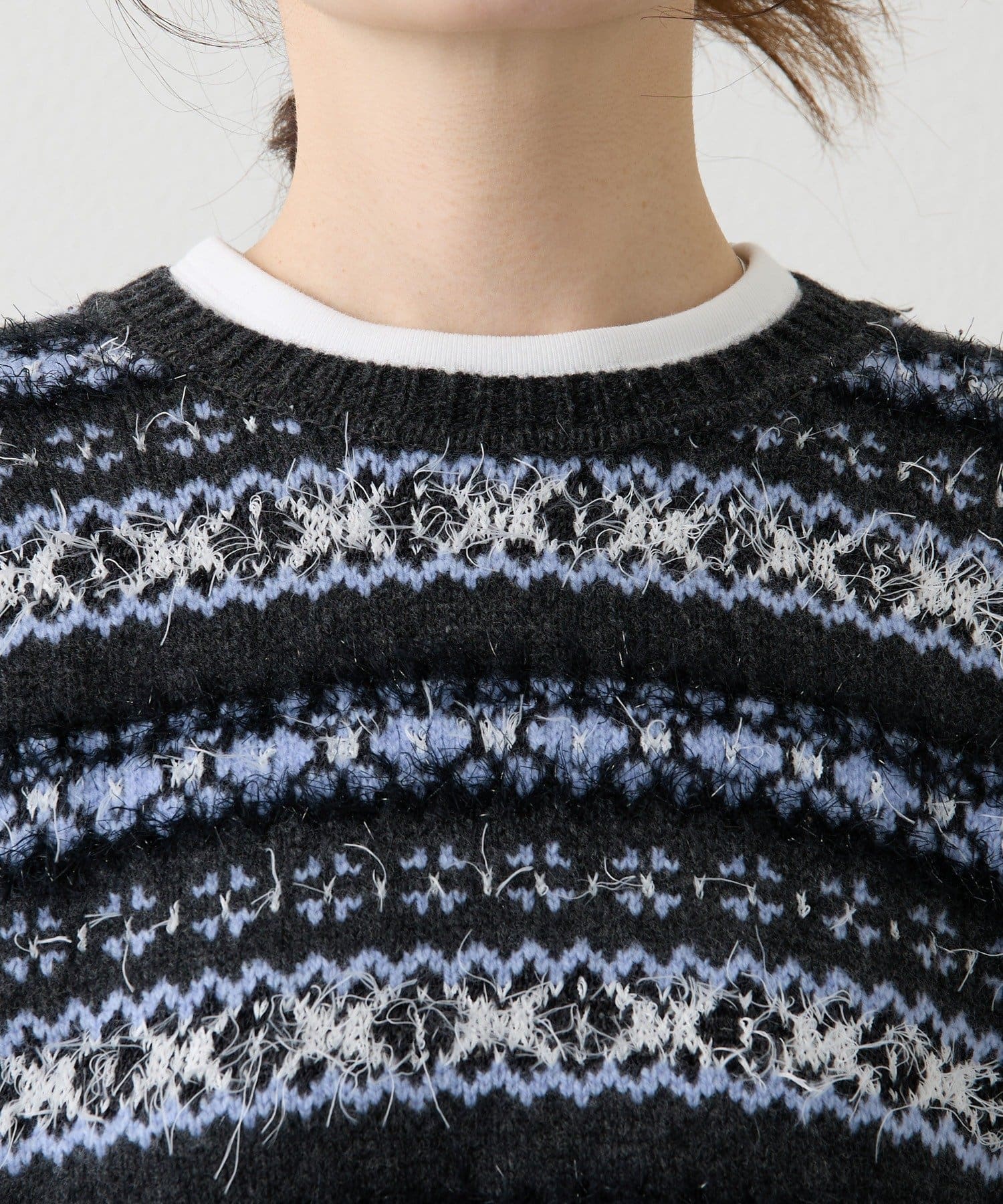 メリノウールをベースに、フェザーヤーンや和紙ヤーンなど異素材を組み合わせて編み上げたフェアアイル柄のクロップドニット。
