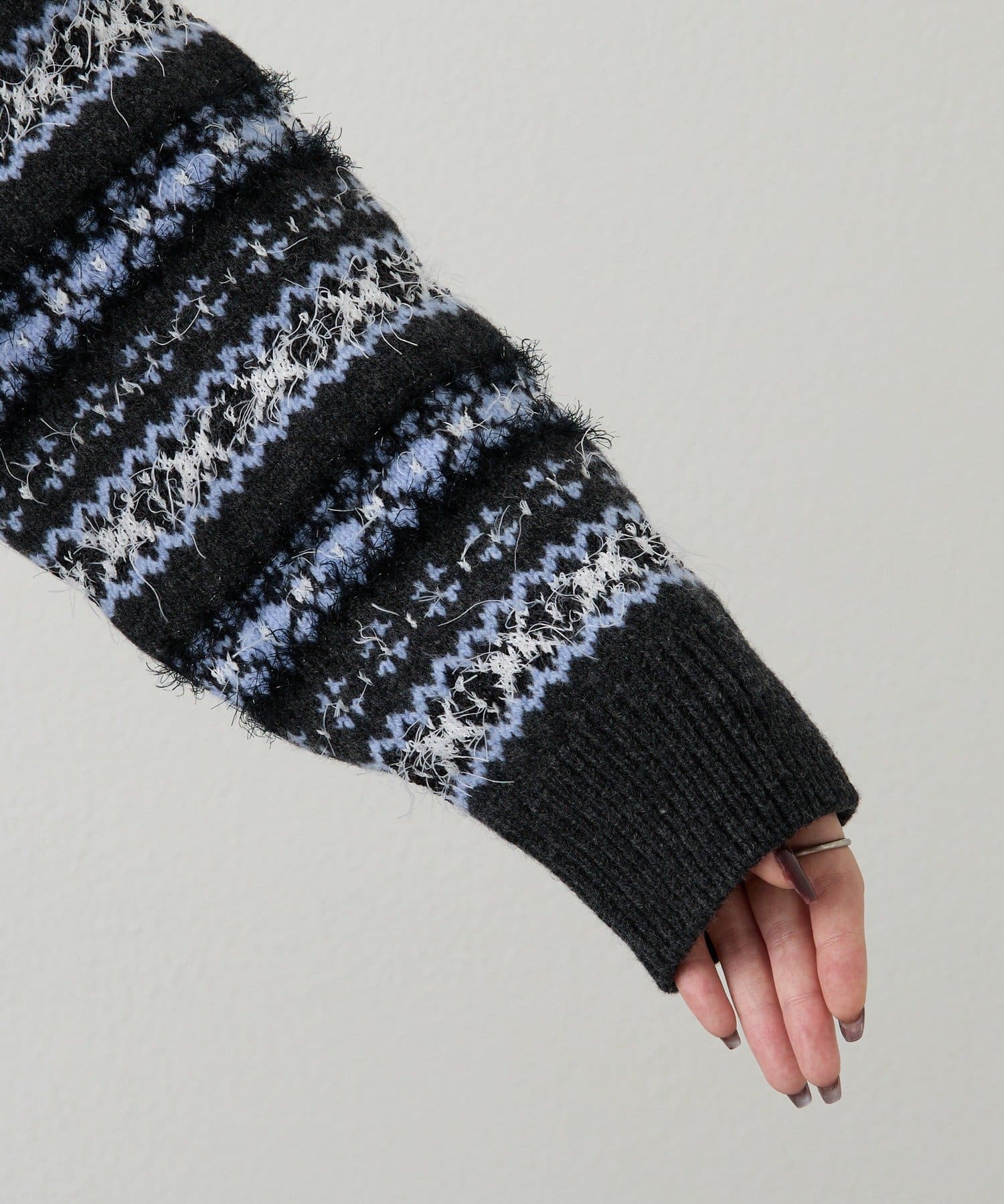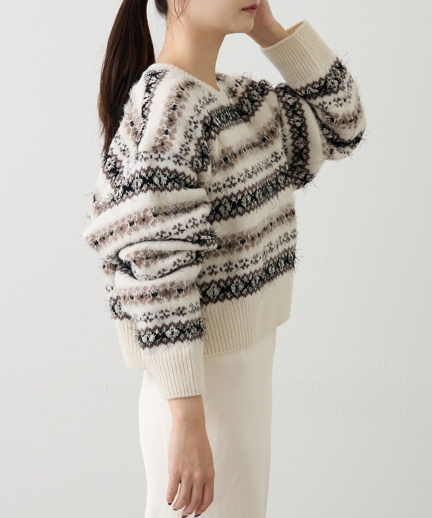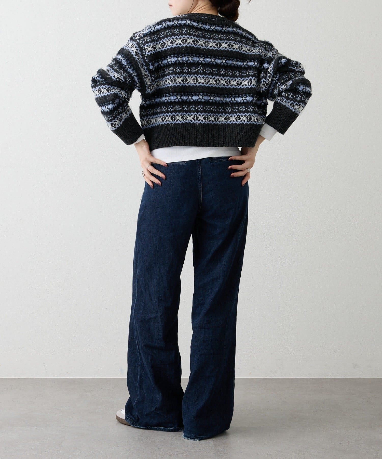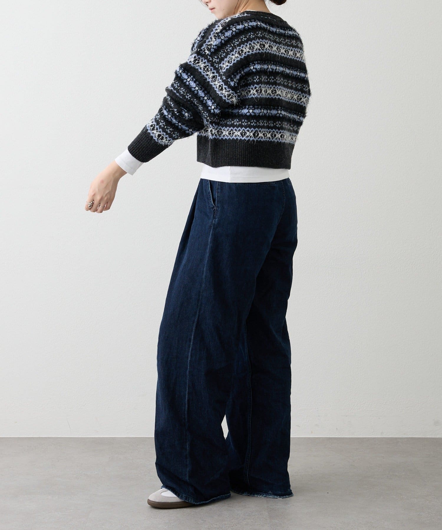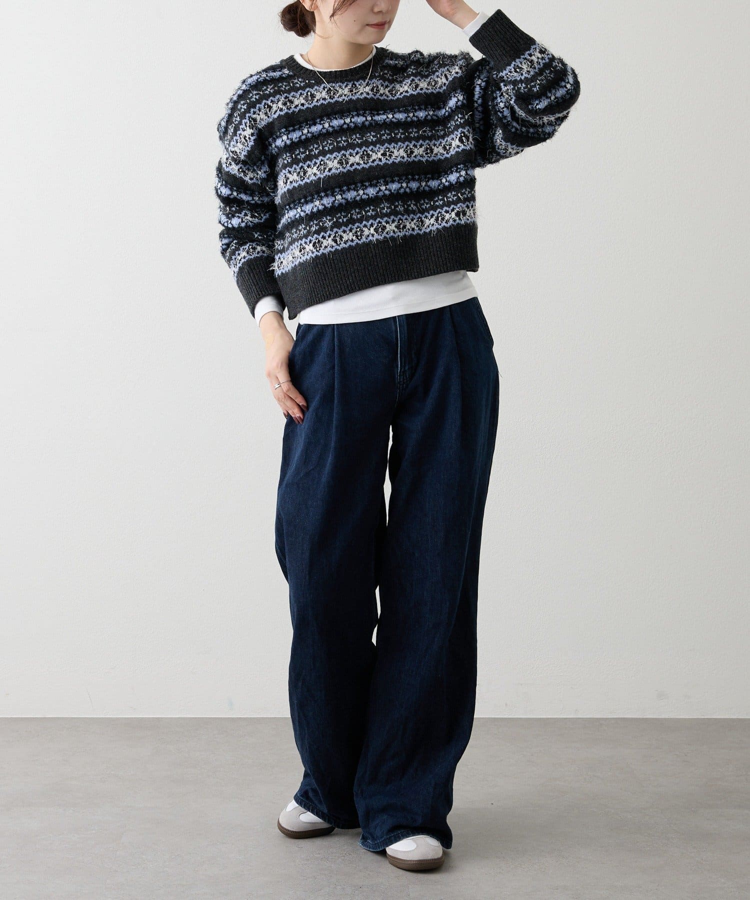 メリノウールをベースに、フェザーヤーンや和紙ヤーンなど異素材を組み合わせて編み上げたフェアアイル柄のクロップドニット。