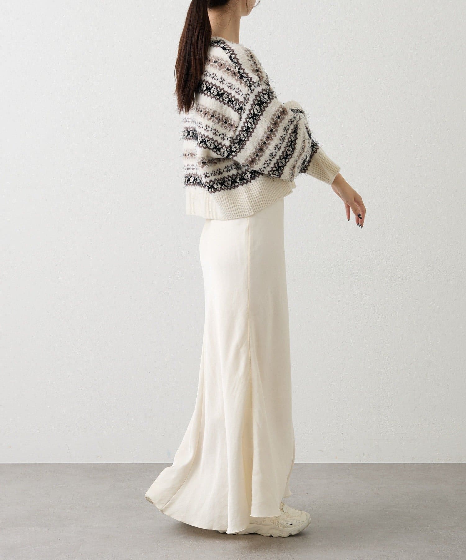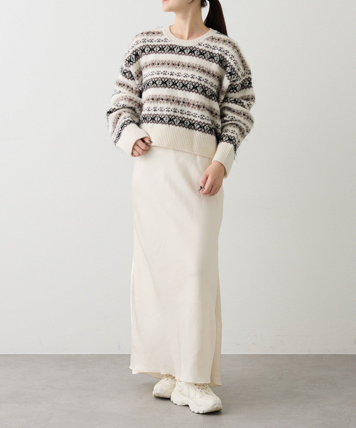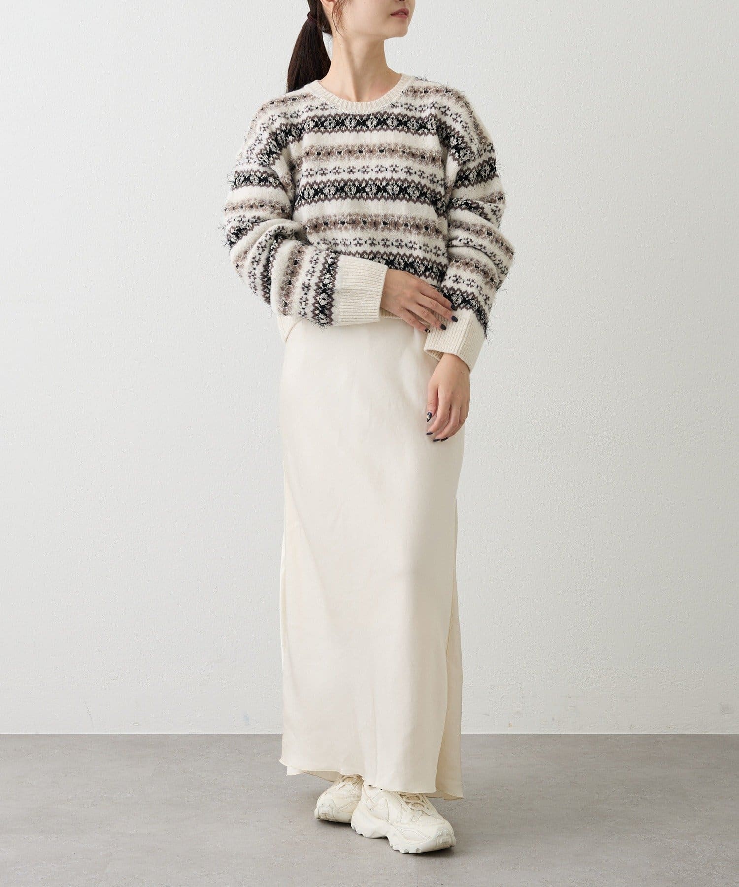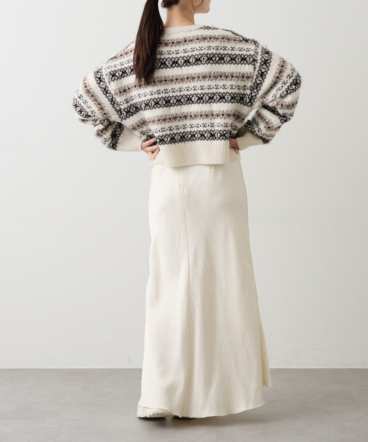 メリノウールをベースに、フェザーヤーンや和紙ヤーンなど異素材を組み合わせて編み上げたフェアアイル柄のクロップドニット。