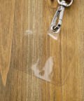 シートの上からケースにスマートフォンをはめ込みます。シート先の穴にストラップを取りつけます。