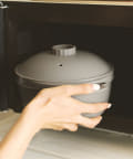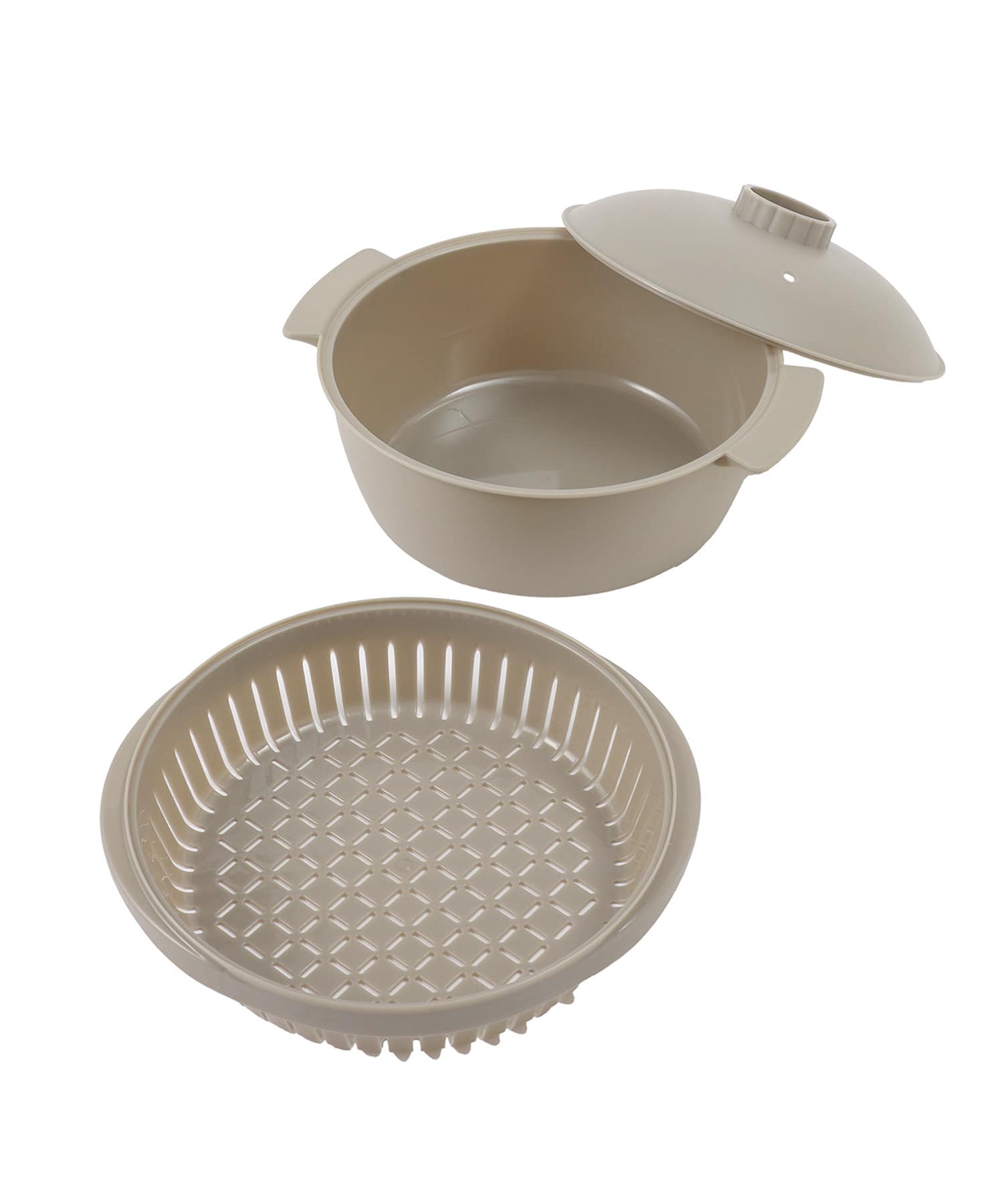 ●加熱調理後は本体・ザル・フタ共に大変熱くなっています。また、フタの内側に付着した湯滴が垂れ落ちることもあります。特にレンジからの取り出しの際には、やけどに十分ご注意ください。