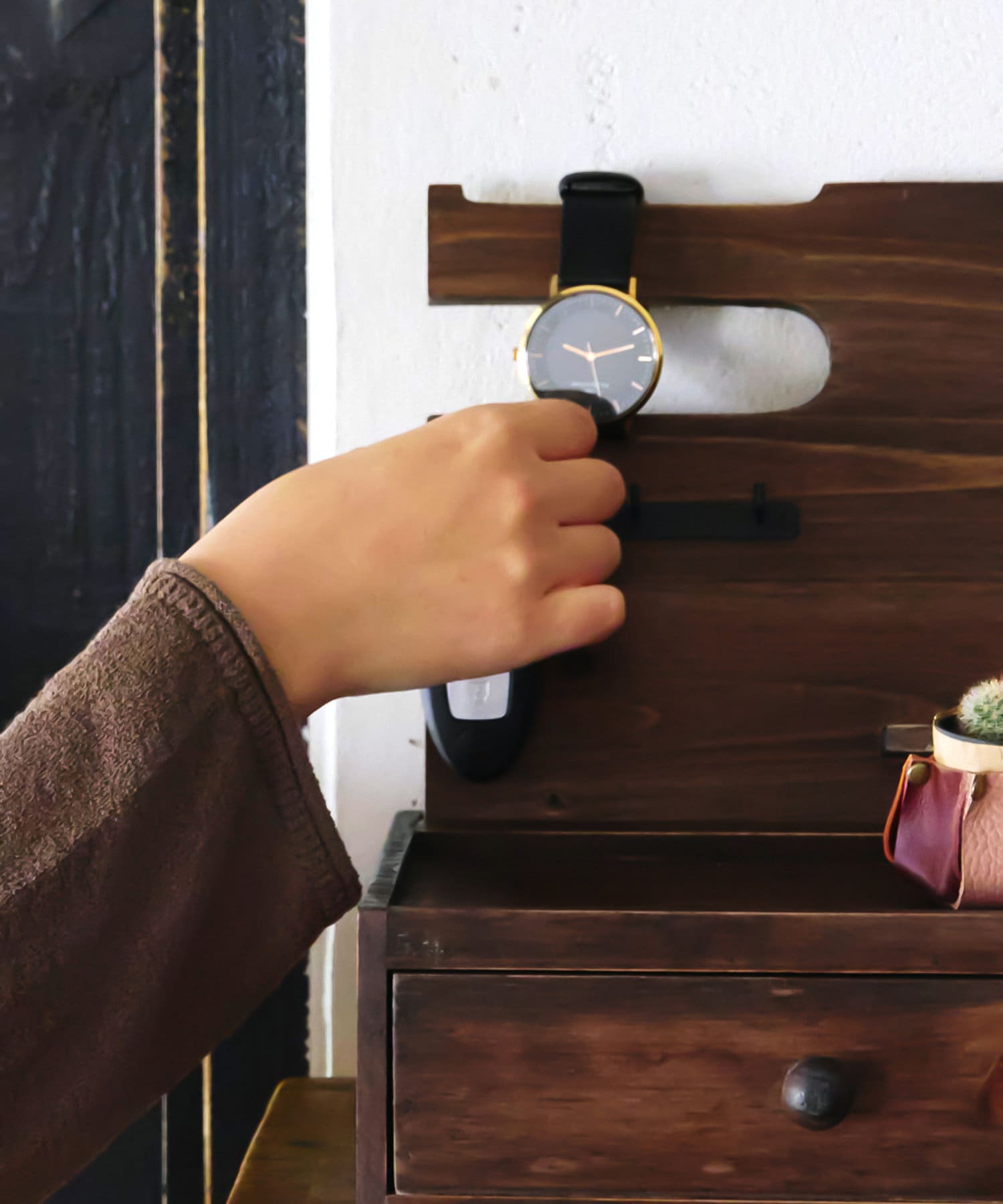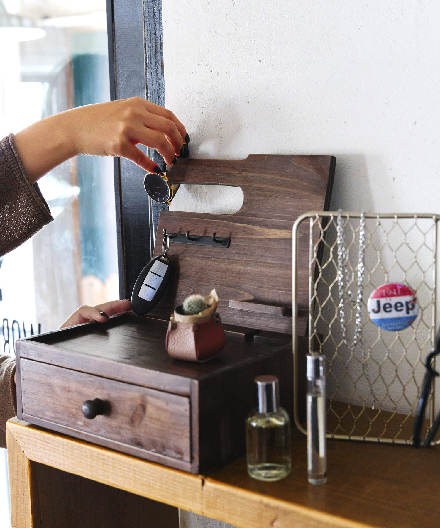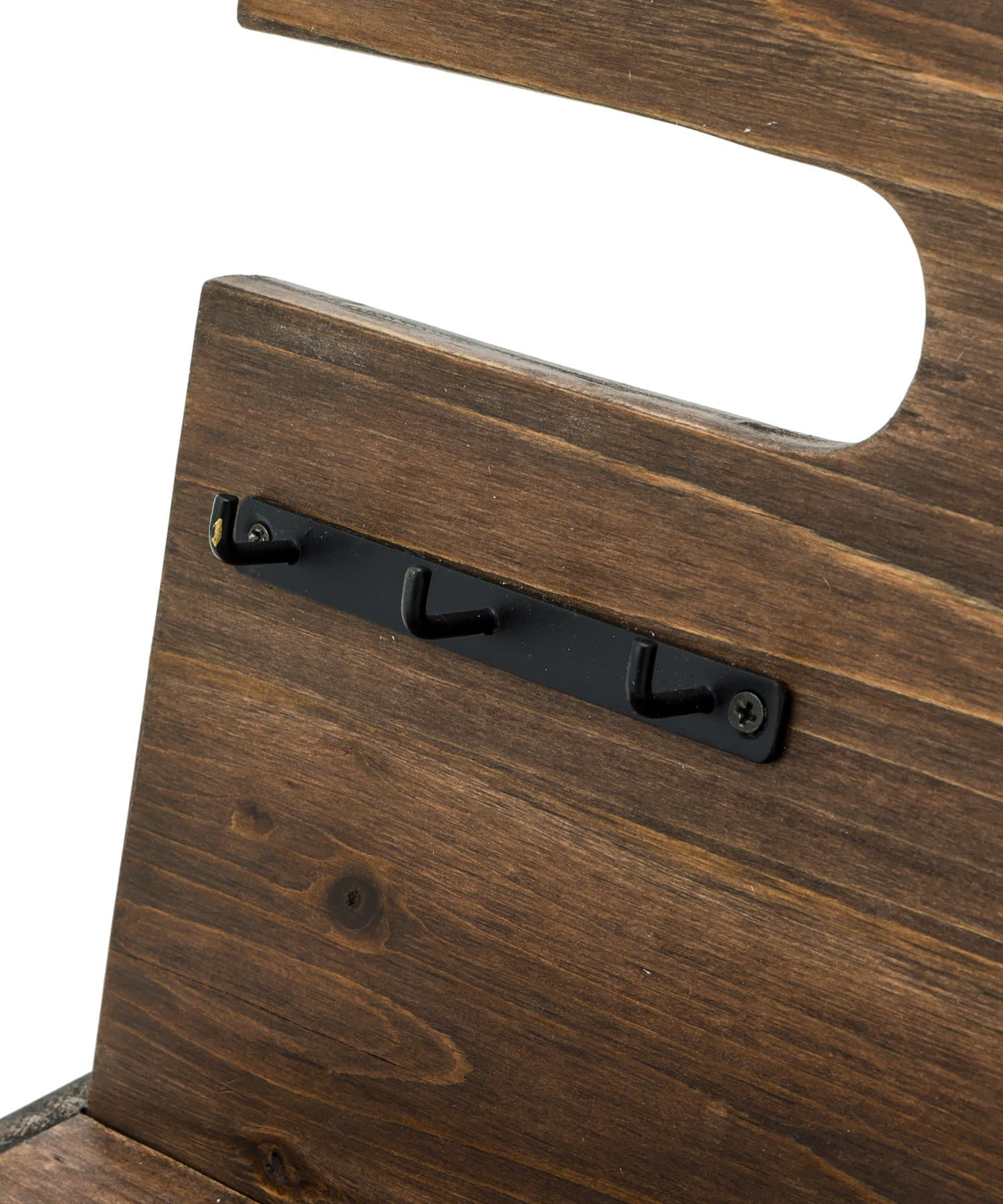 ●落ち着いた深い色合いのウッドと無骨なアイアンのフックの組み合わせがクールなデザインです。