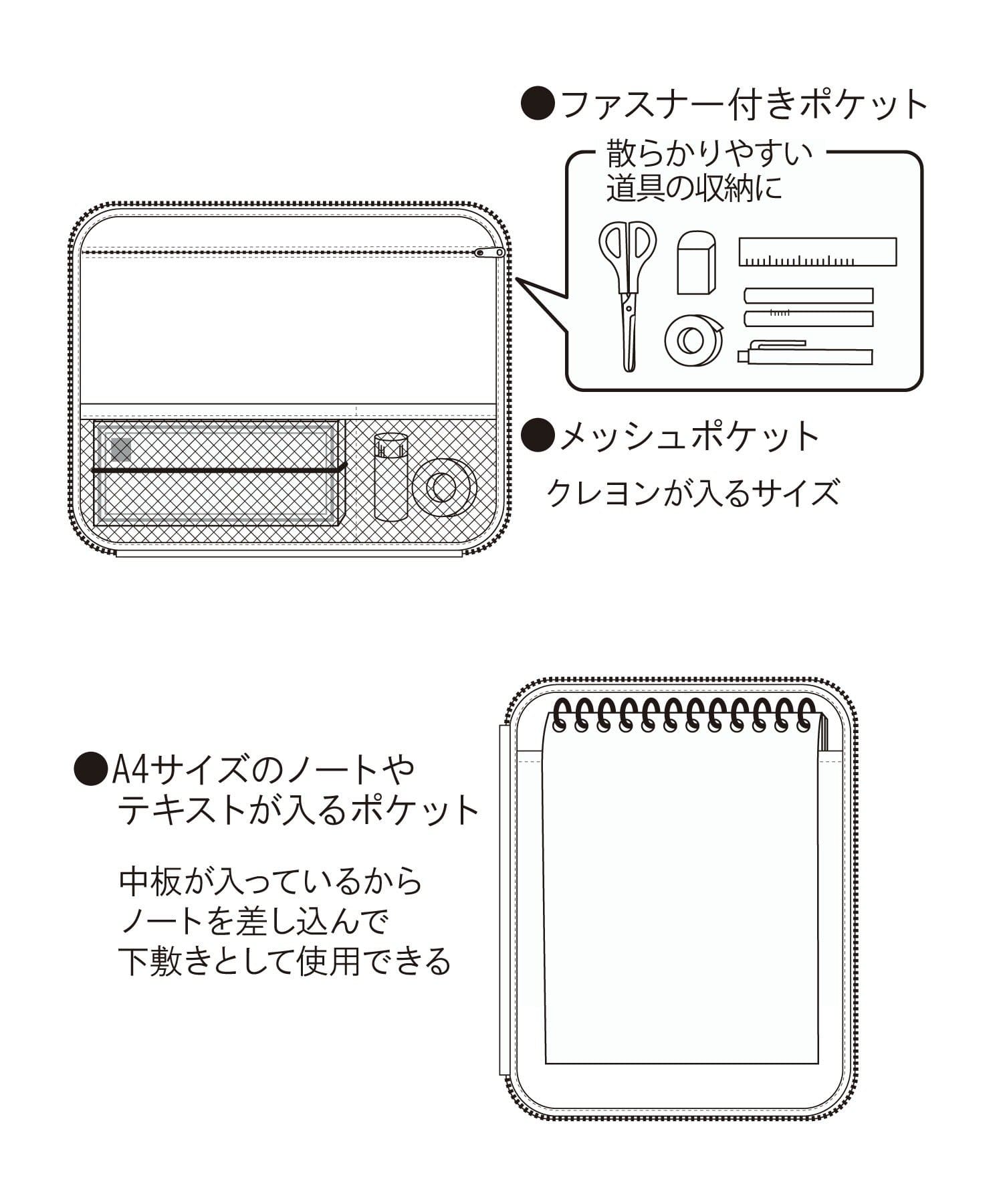 ●消しゴムやハサミなどの小物文具はファスナーポケットに収納ができます。