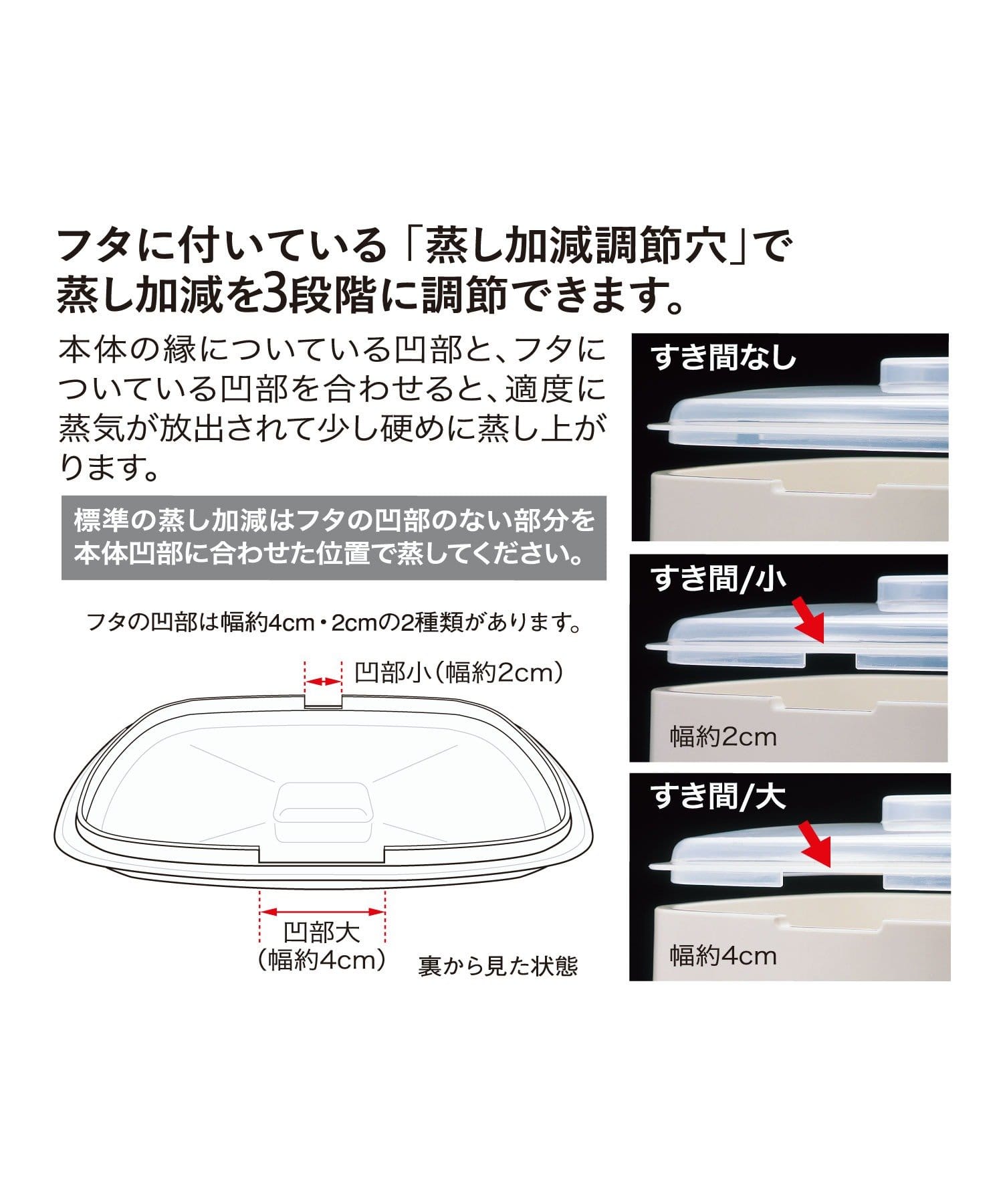 ●蓋に蒸し加減調節穴があるので、蓋を閉める向きによって、3段階に蒸し加減が調節できます。