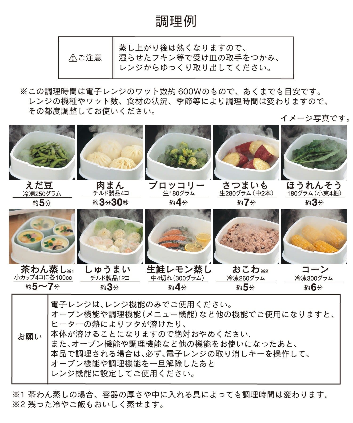 ●加熱時間は電子レンジのメーカーや機種、気温、材料の温度によって異なります。まず加熱時間を短めにし、様子を見ながら調理してください。