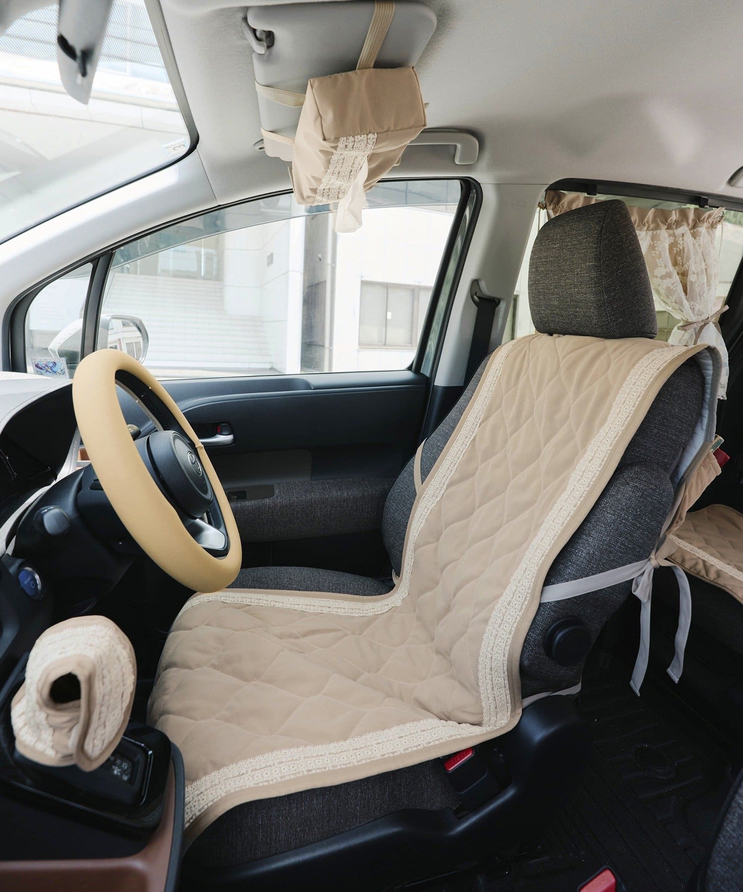 ●シンプルなベージュのキルト生地にレースが可愛らしいデザインです。