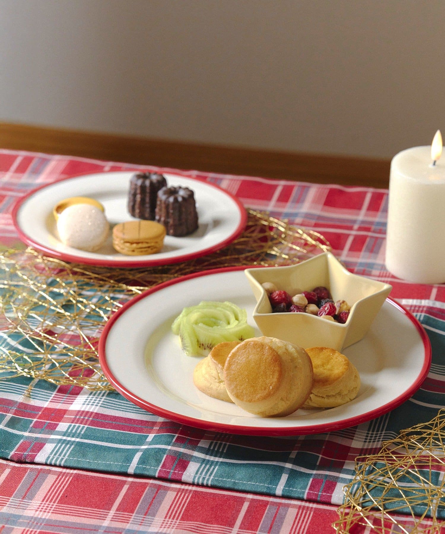 ●白ベースに赤いラインが映える、クリスマスムードたっぷりのプレート。