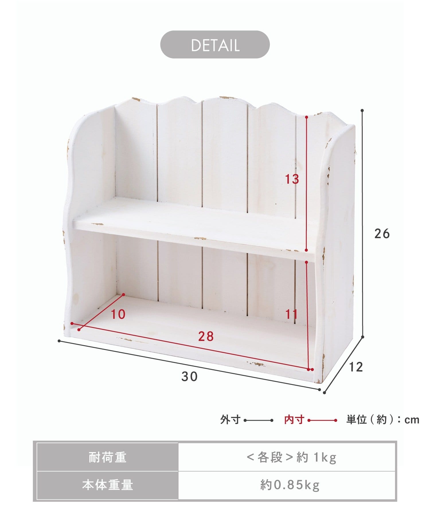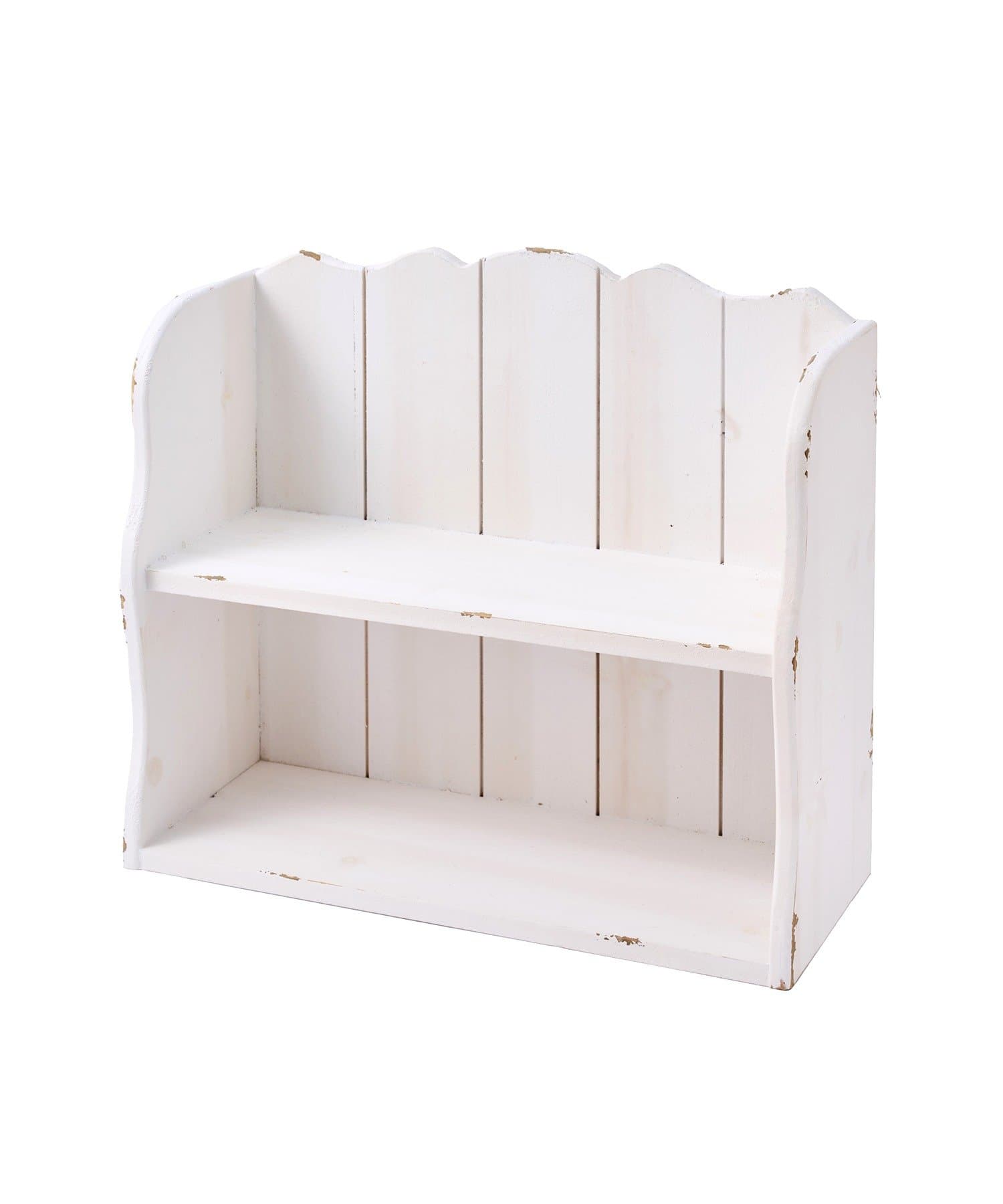 ●ホワイトシャビー仕上げの卓上2段シェルフ。