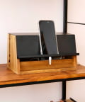 ●ボックス内部に電源タップなどを隠せるだけでなく、天板手前部分を充電中のモバイル端末用スタンドとして活用できる充電ステーション仕様です。
