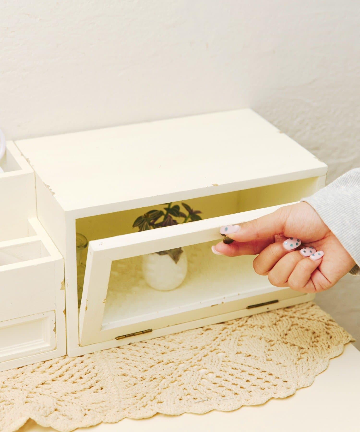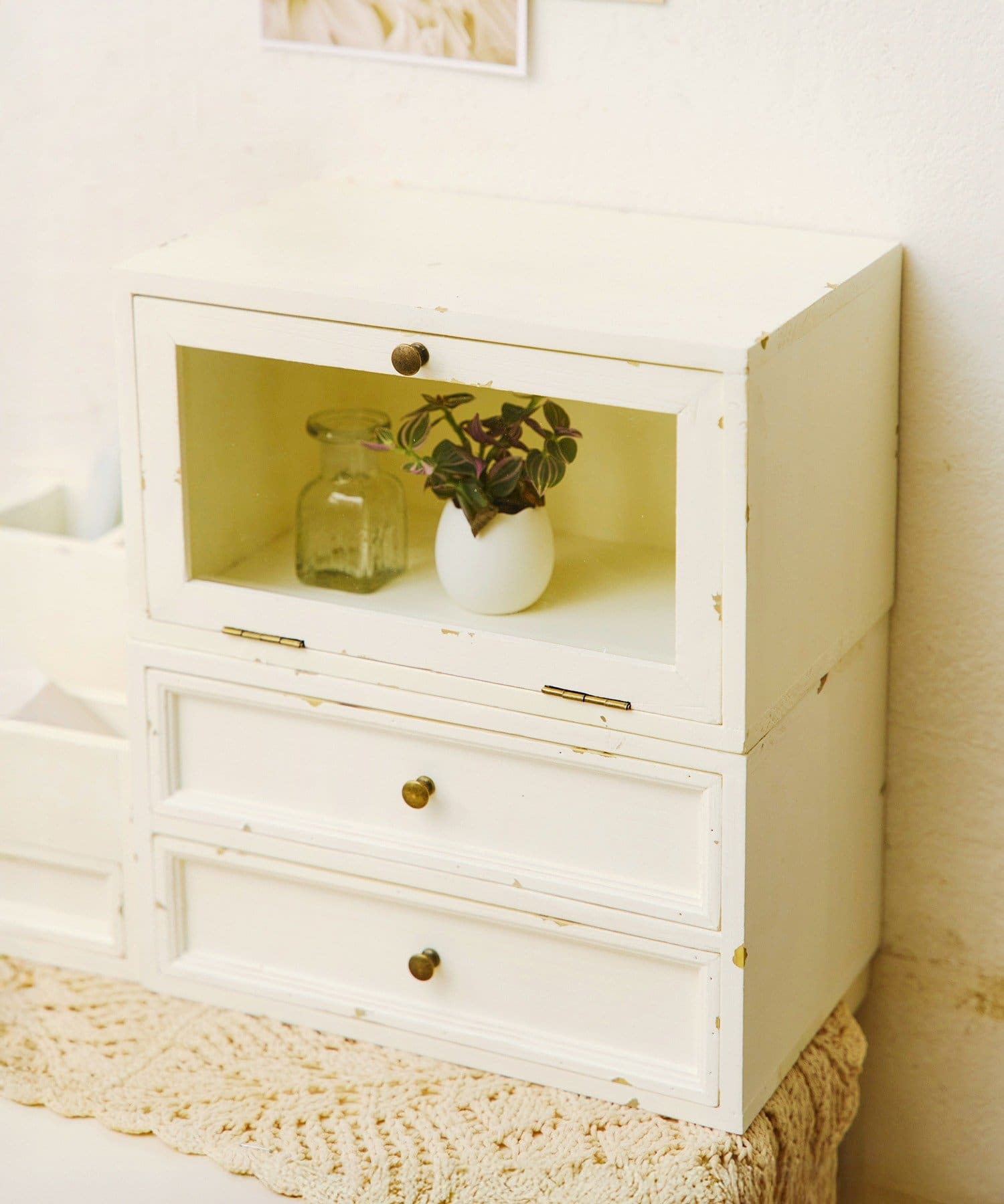 ●お気に入りの小物を見せながら収納できる、ガラス扉付きのキャビネットです。