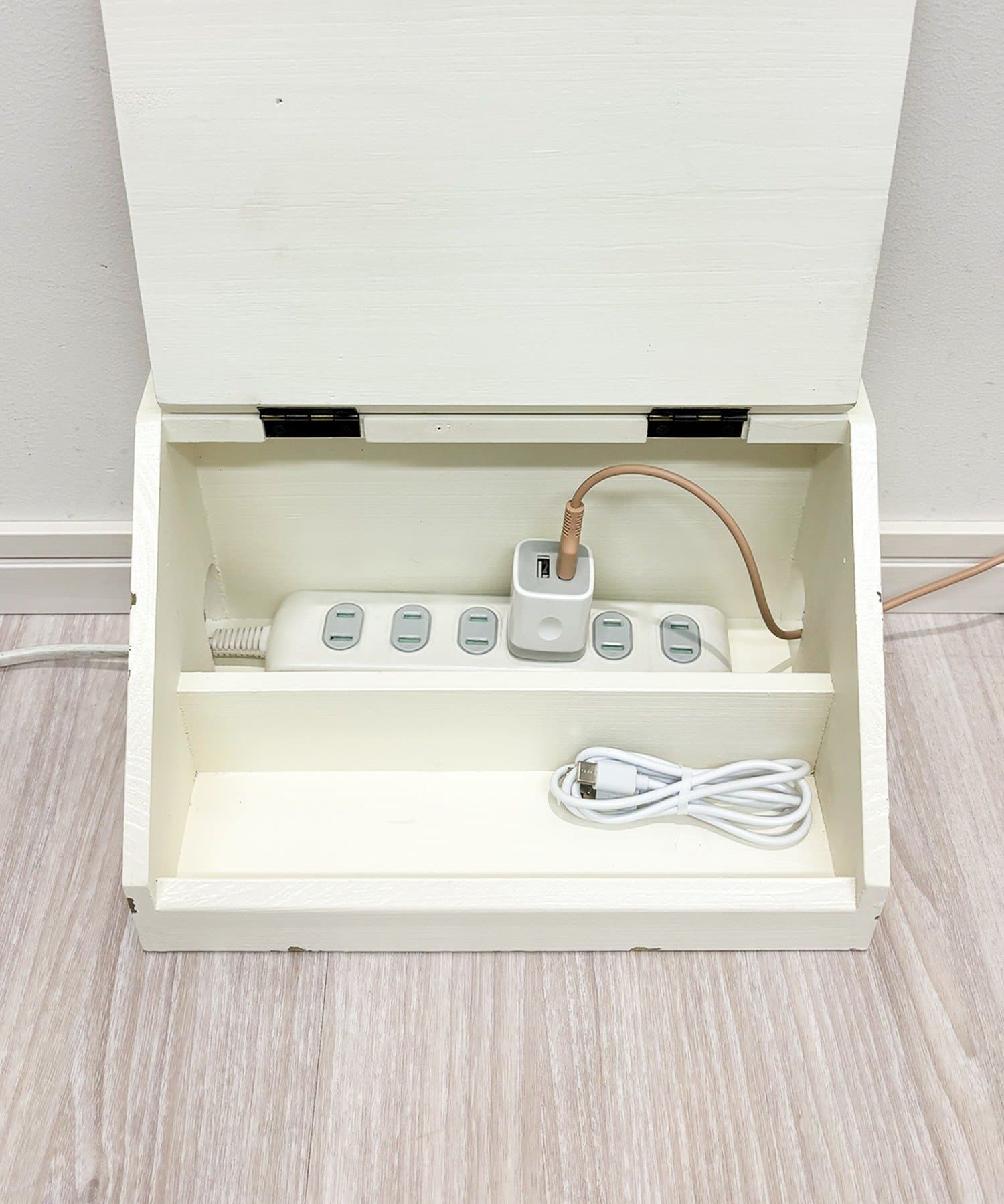 ●散らかりがちなケーブルや電源タップをすっきり隠して収納できるケーブルボックスです。
